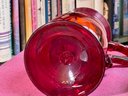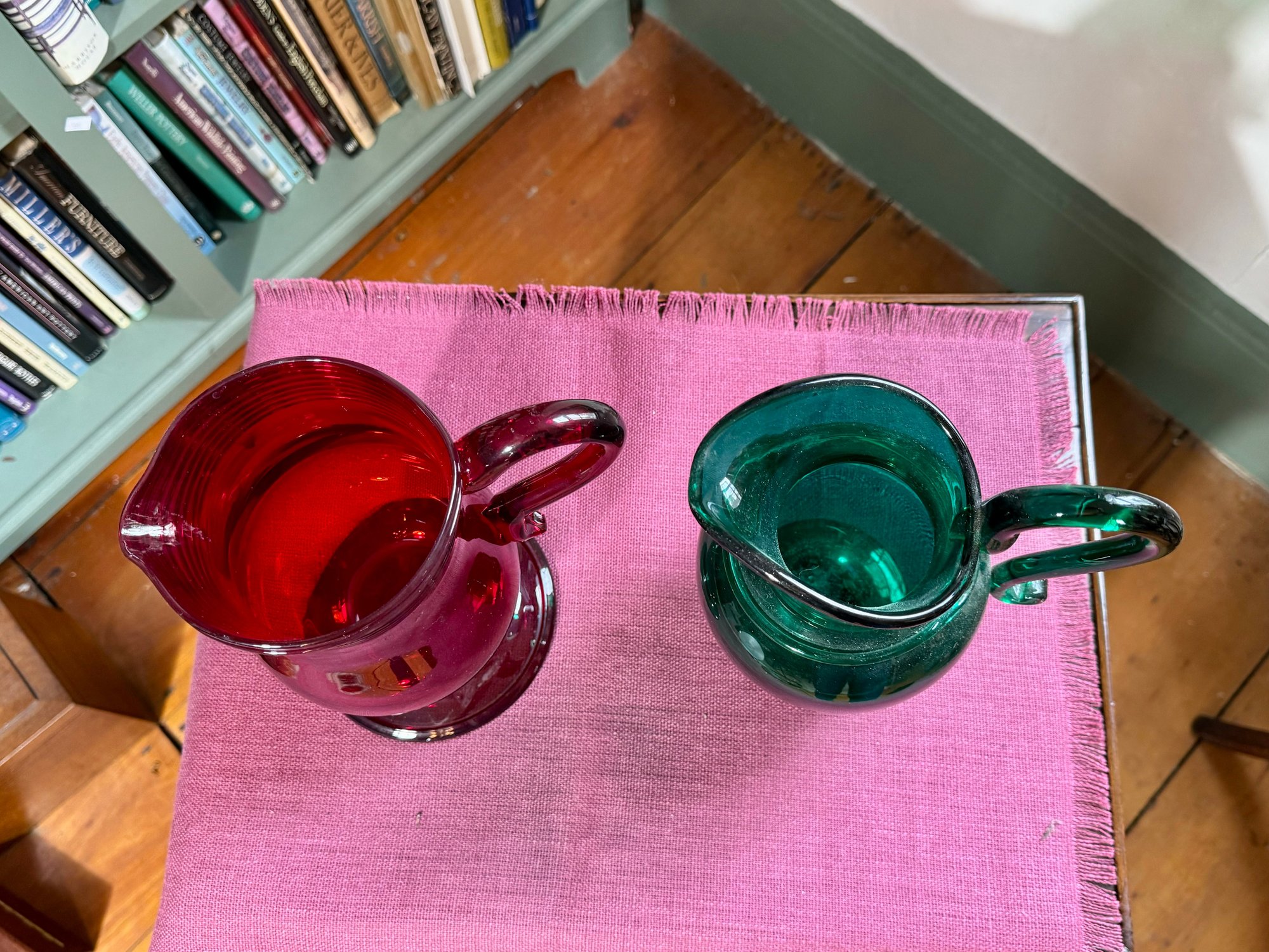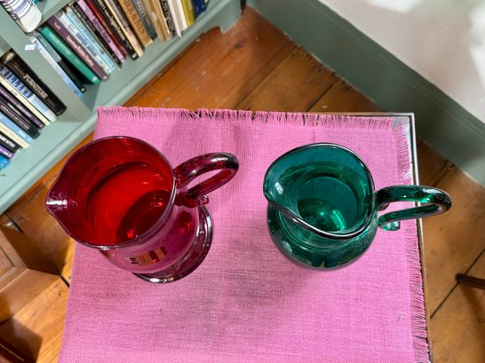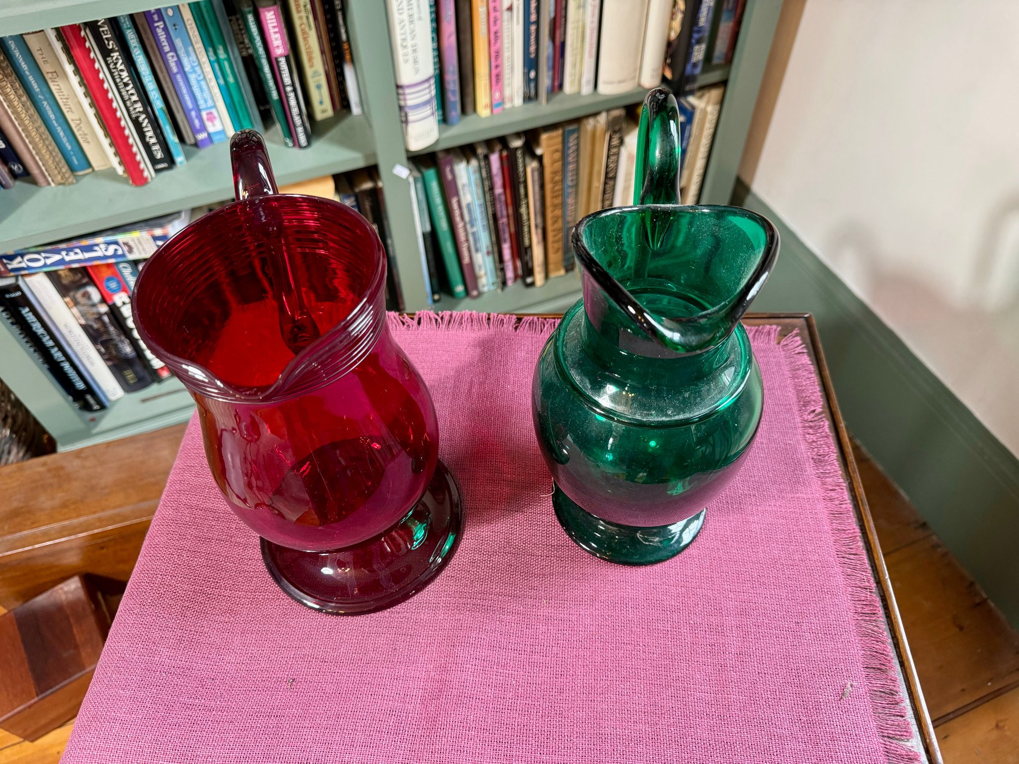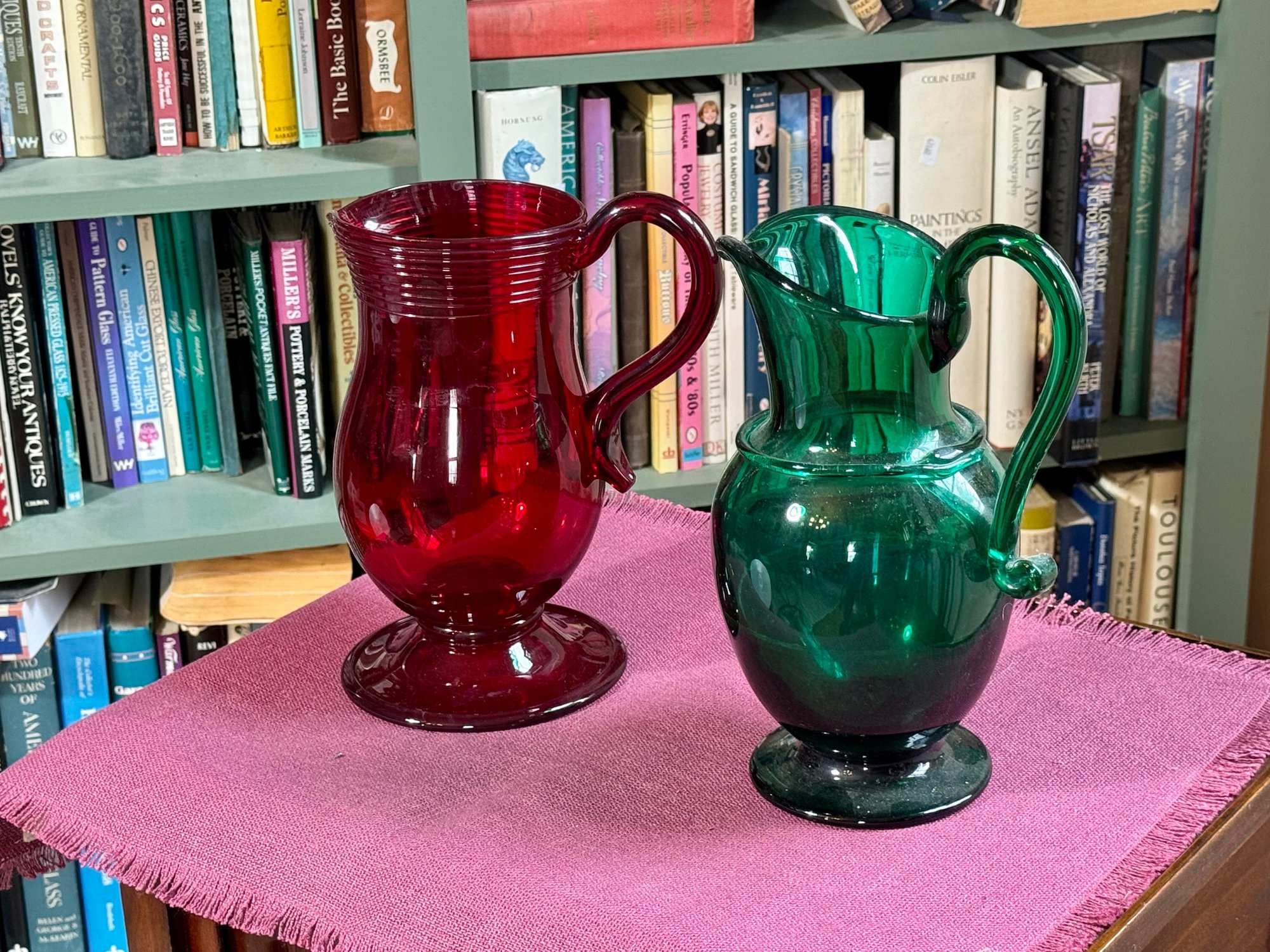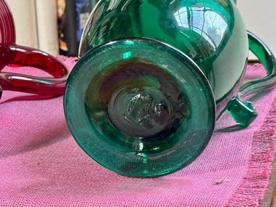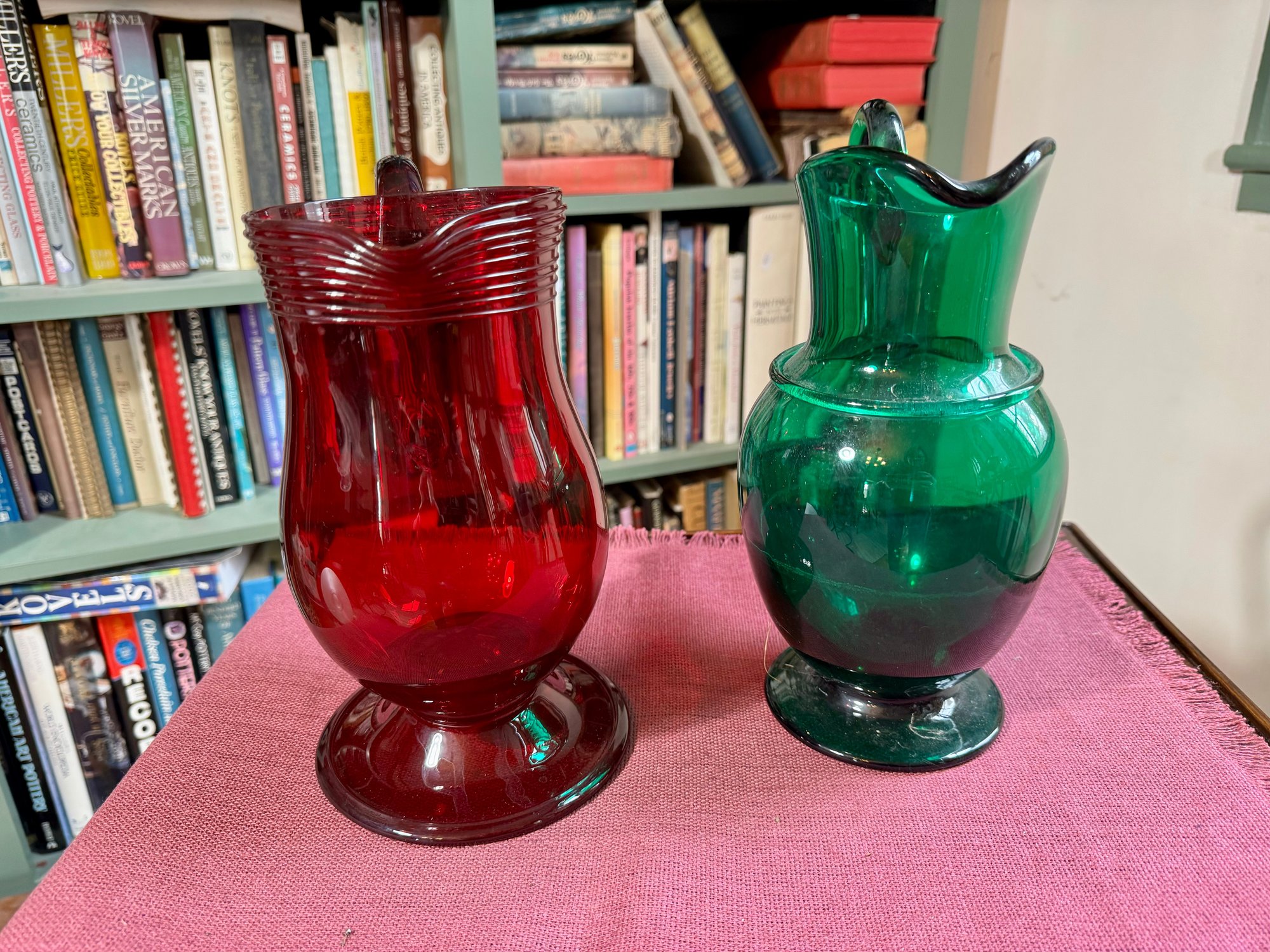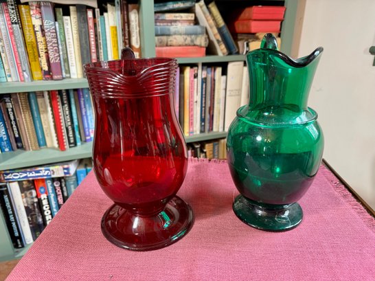 Two vintage handblown glass pitchers: red with a ribbed top 9.25” H, green with an applied glass bead trim 9.5” H.
