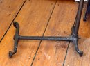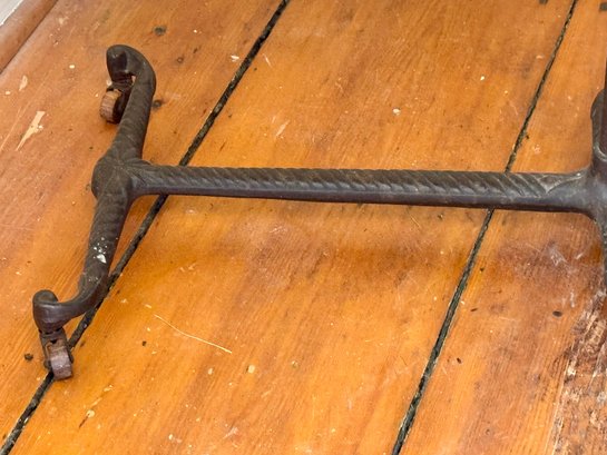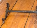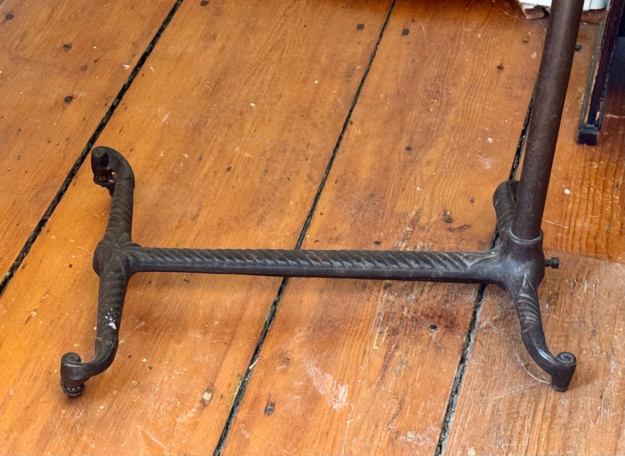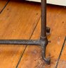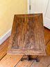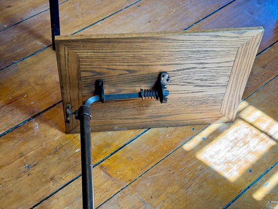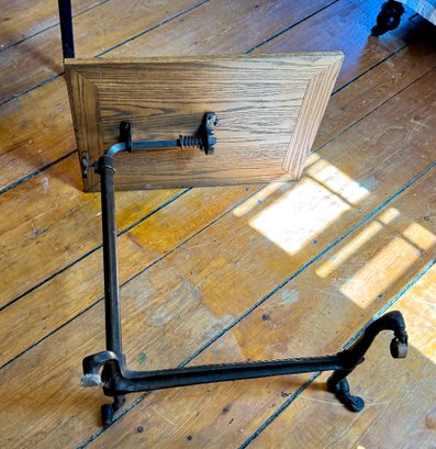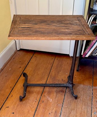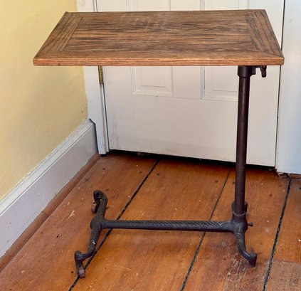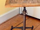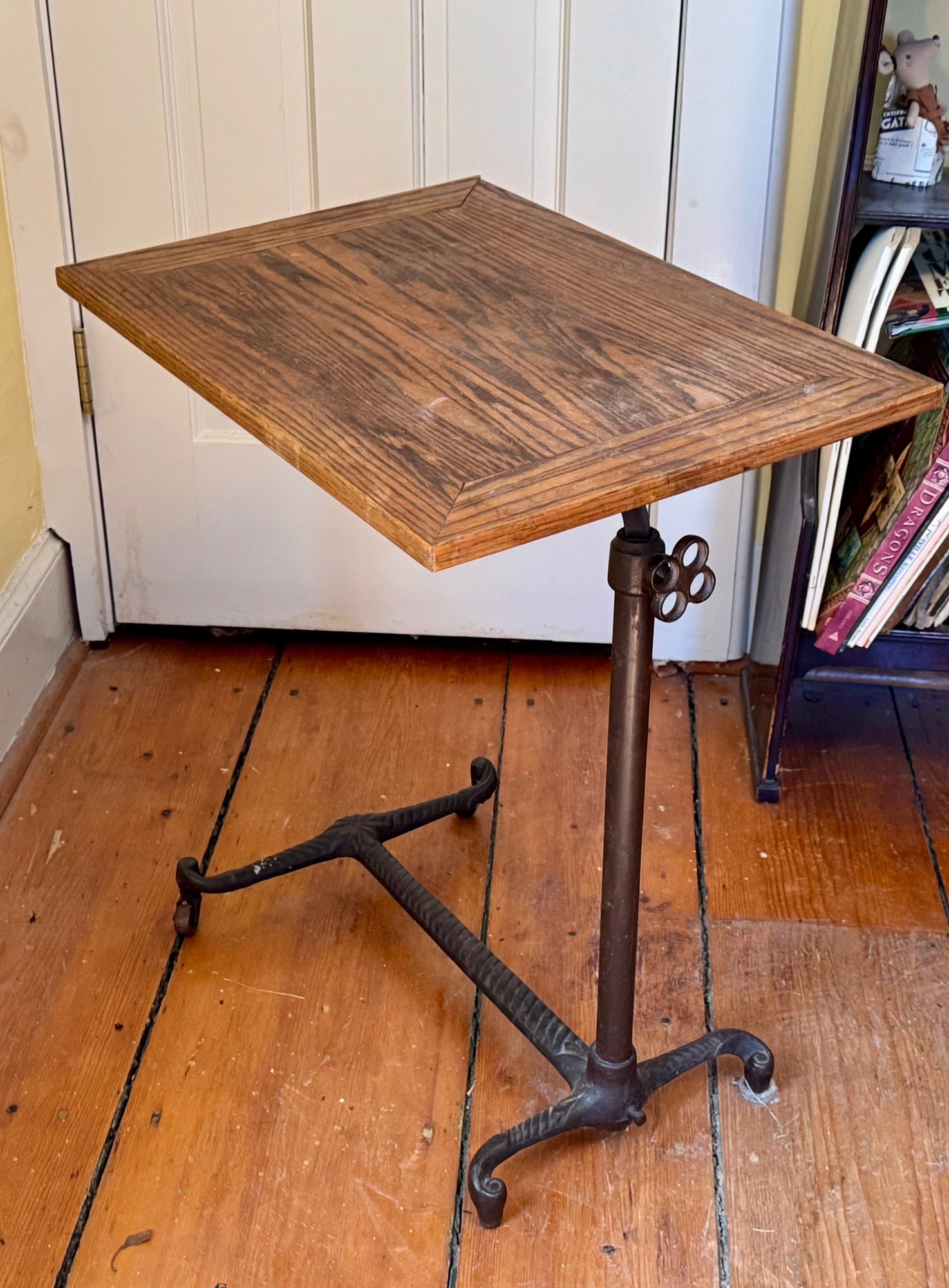 A vintage adjustable desk/work table with an oak top and metal base with two caster wheels.