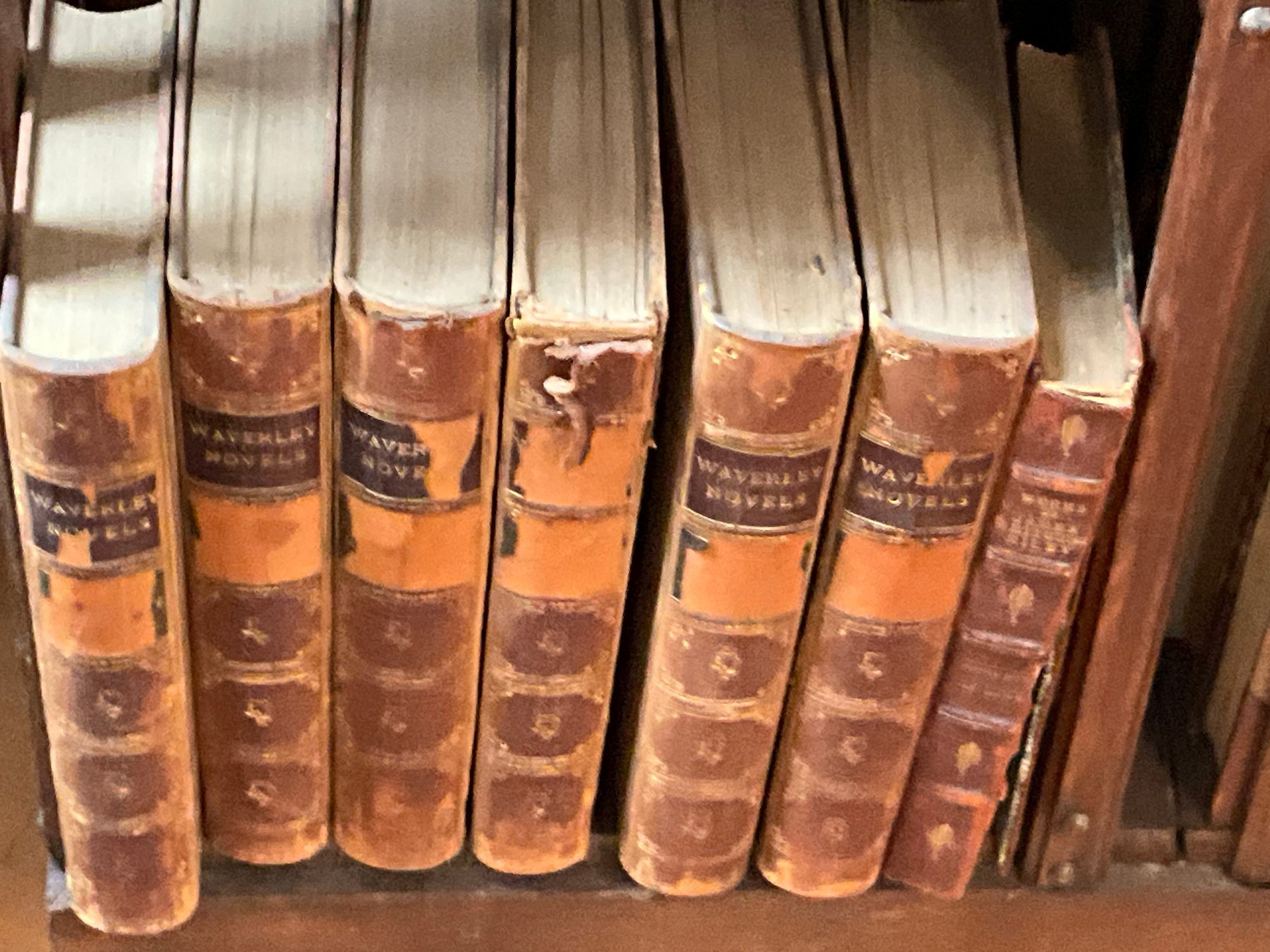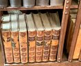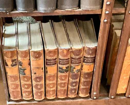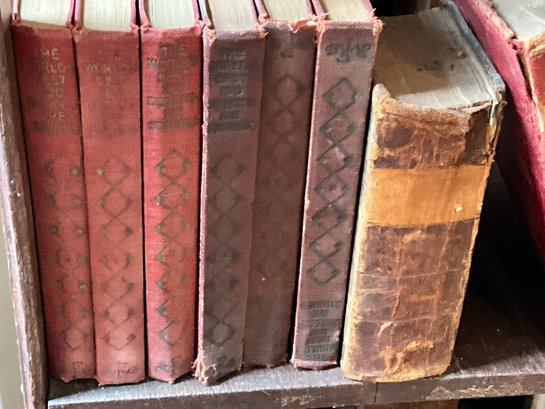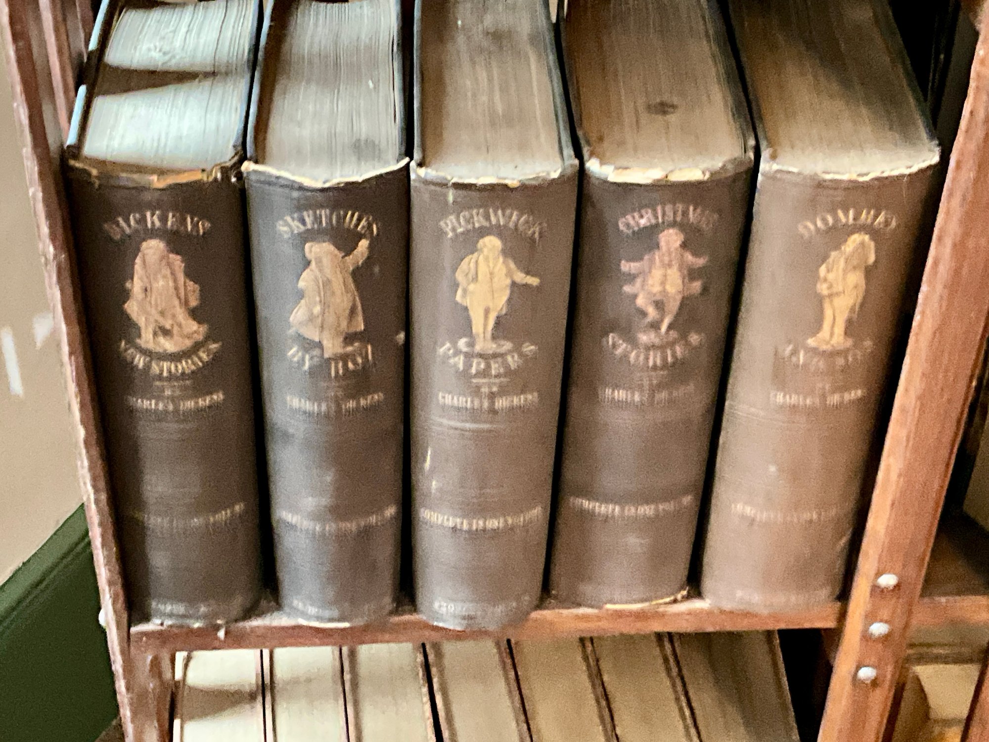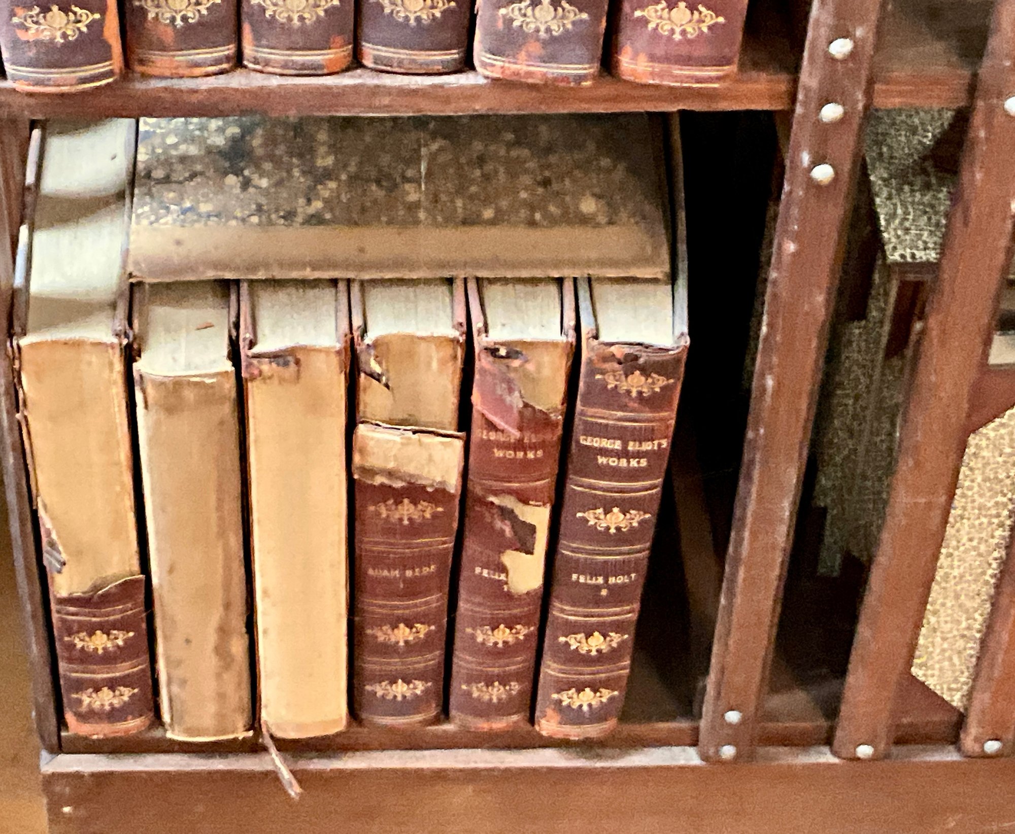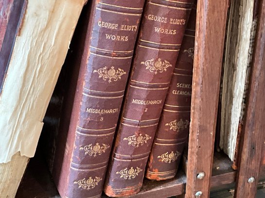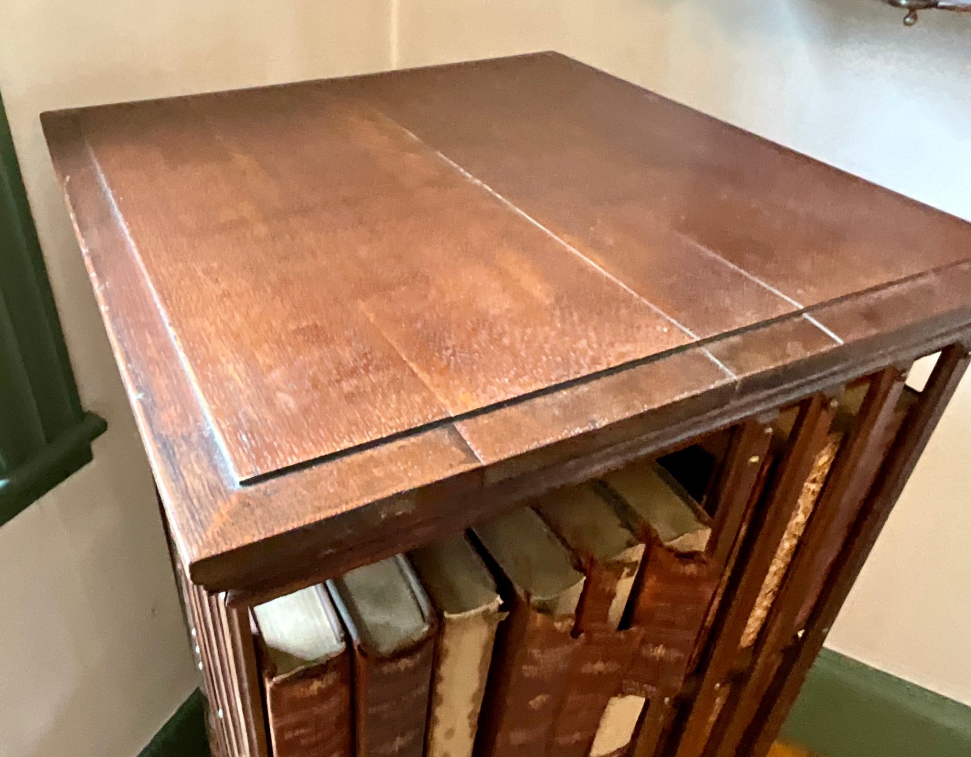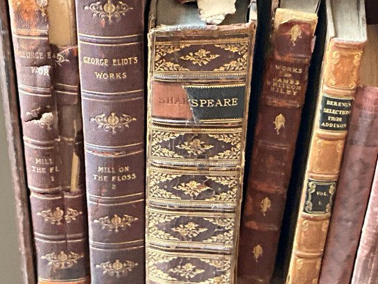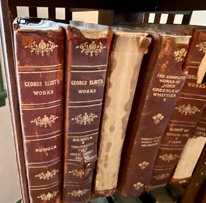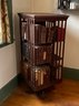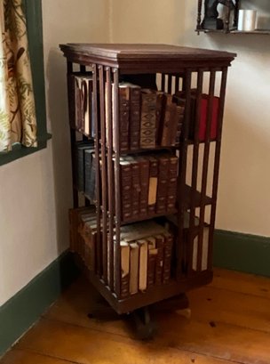 A vintage oak revolving bookcase with antique books included George Elliot, Shakespeare, and Dickens.