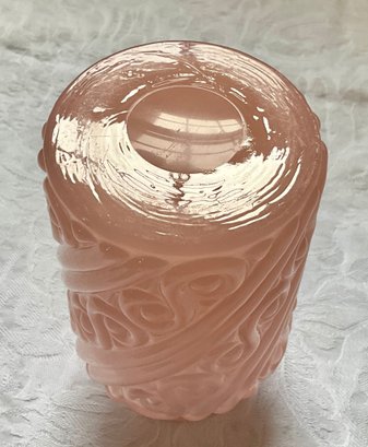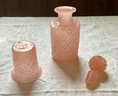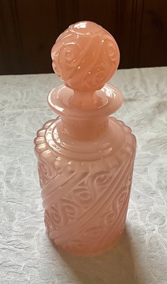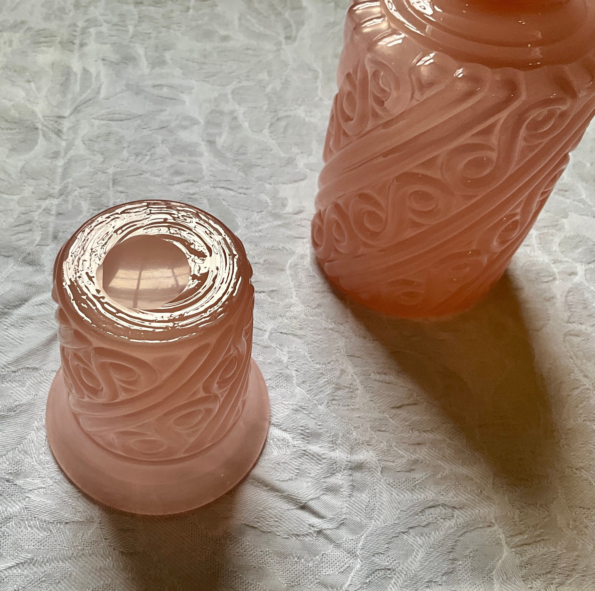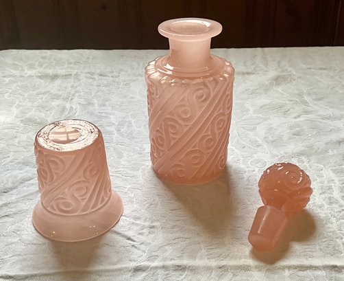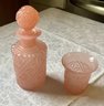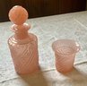 A vintage pink Portieux 7.5'H decanter with stopper and a matching 3.5"H cup.