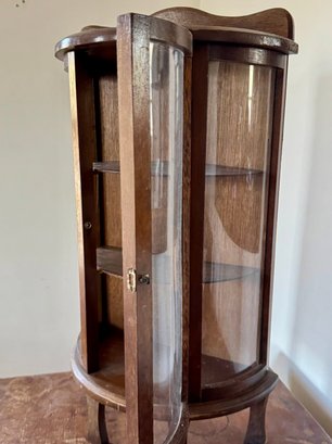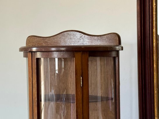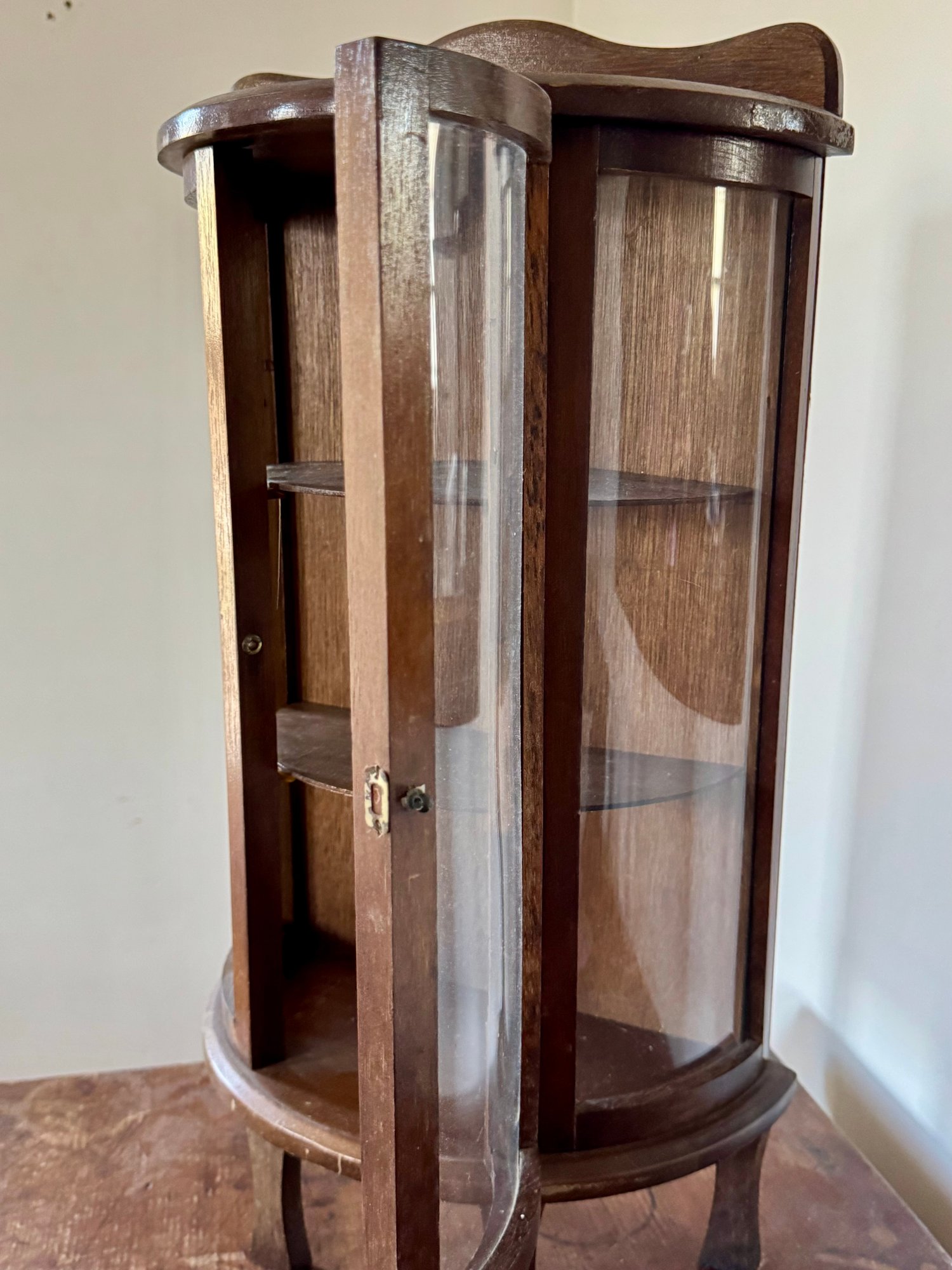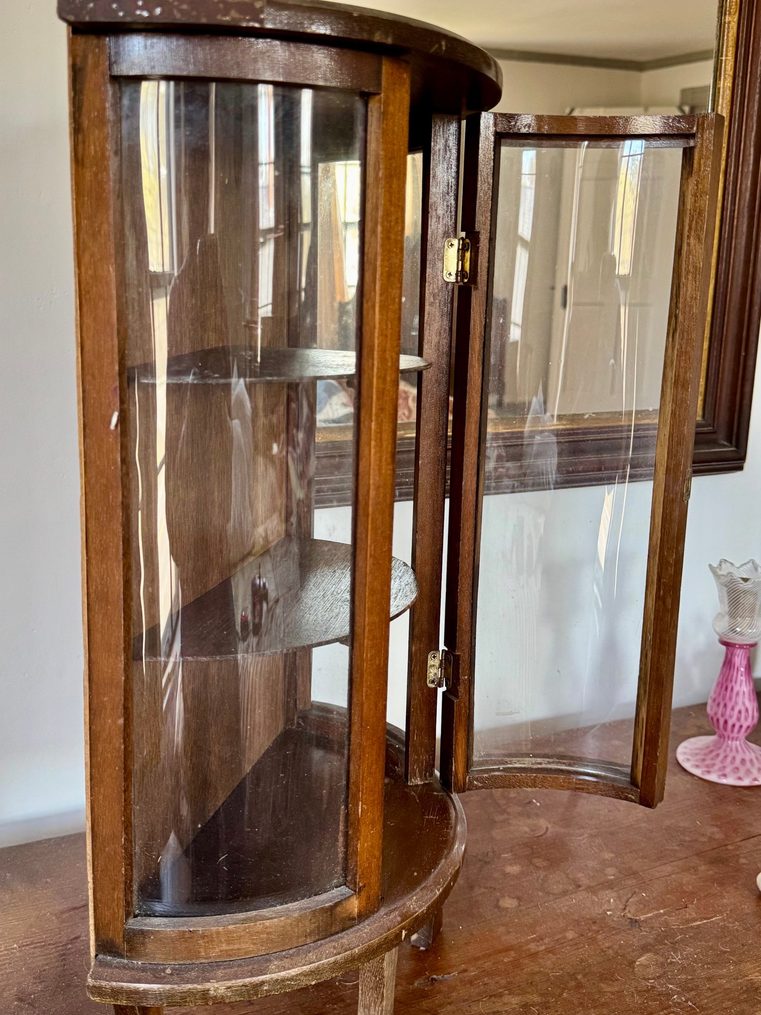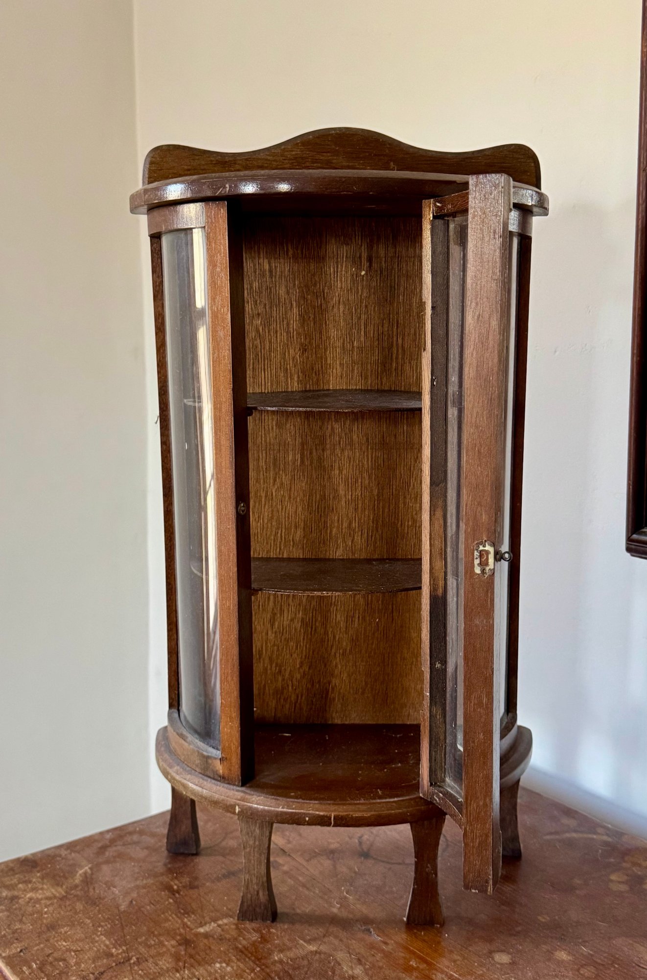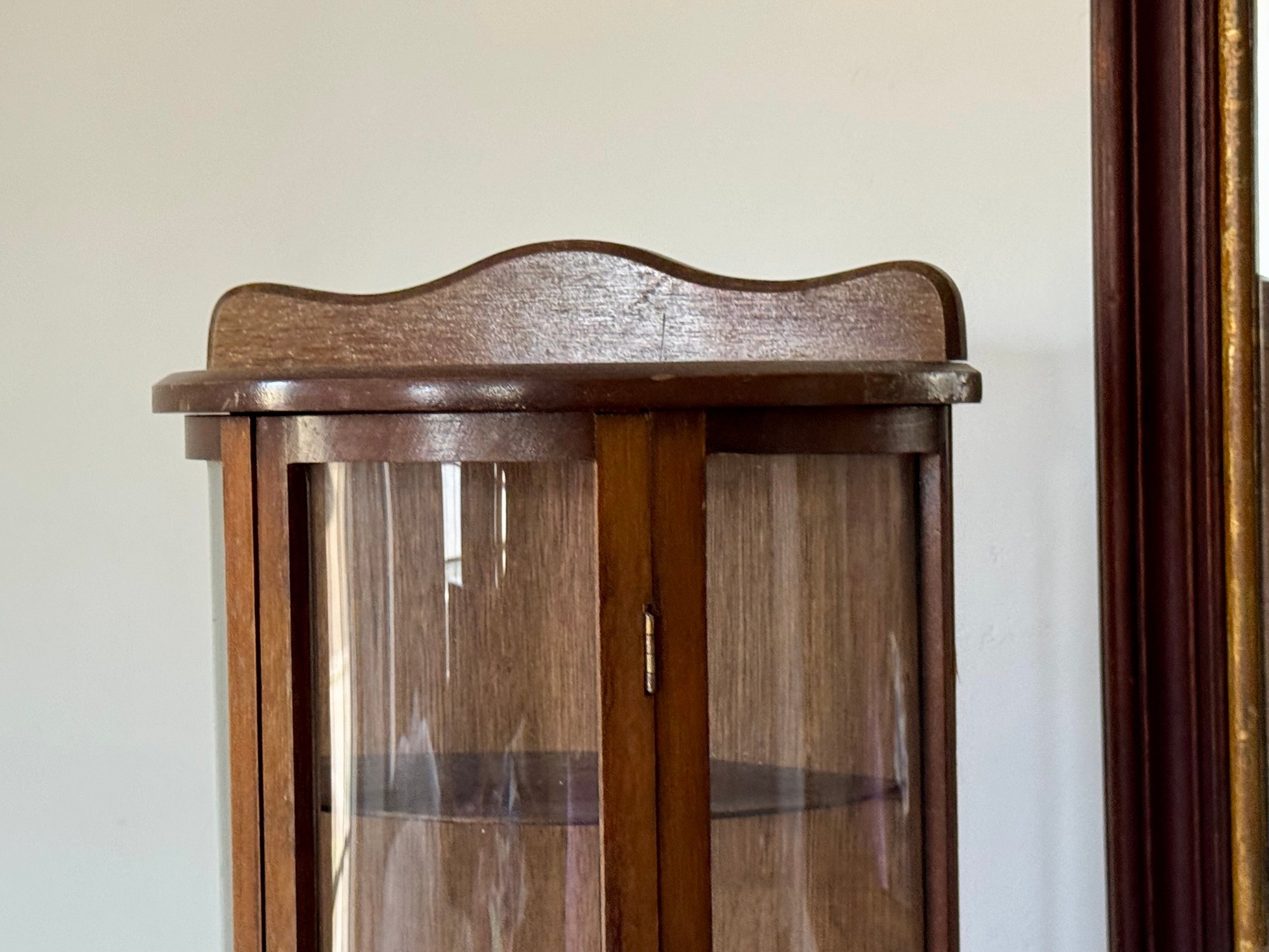 A small curio cabinet with a single door, interior with adjustable and removable shelves.