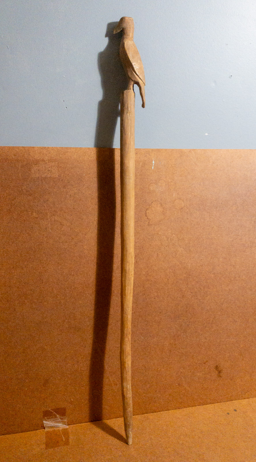 Hold onto your hats, folks! What we've got here is a real mystery and it is coming up for grabs from a lifelong anthropologist's collection! An absolute treasure! This hand-carved wooden staff, topped with a majestic bird, just flew into the auction! Now, I can't say for certain what secrets it holds, or what faraway lands it has seen... but I'll tell you what – it's got more character than a whole flock of wild turkeys! Feels older than dirt. They don't carve like this anymore.