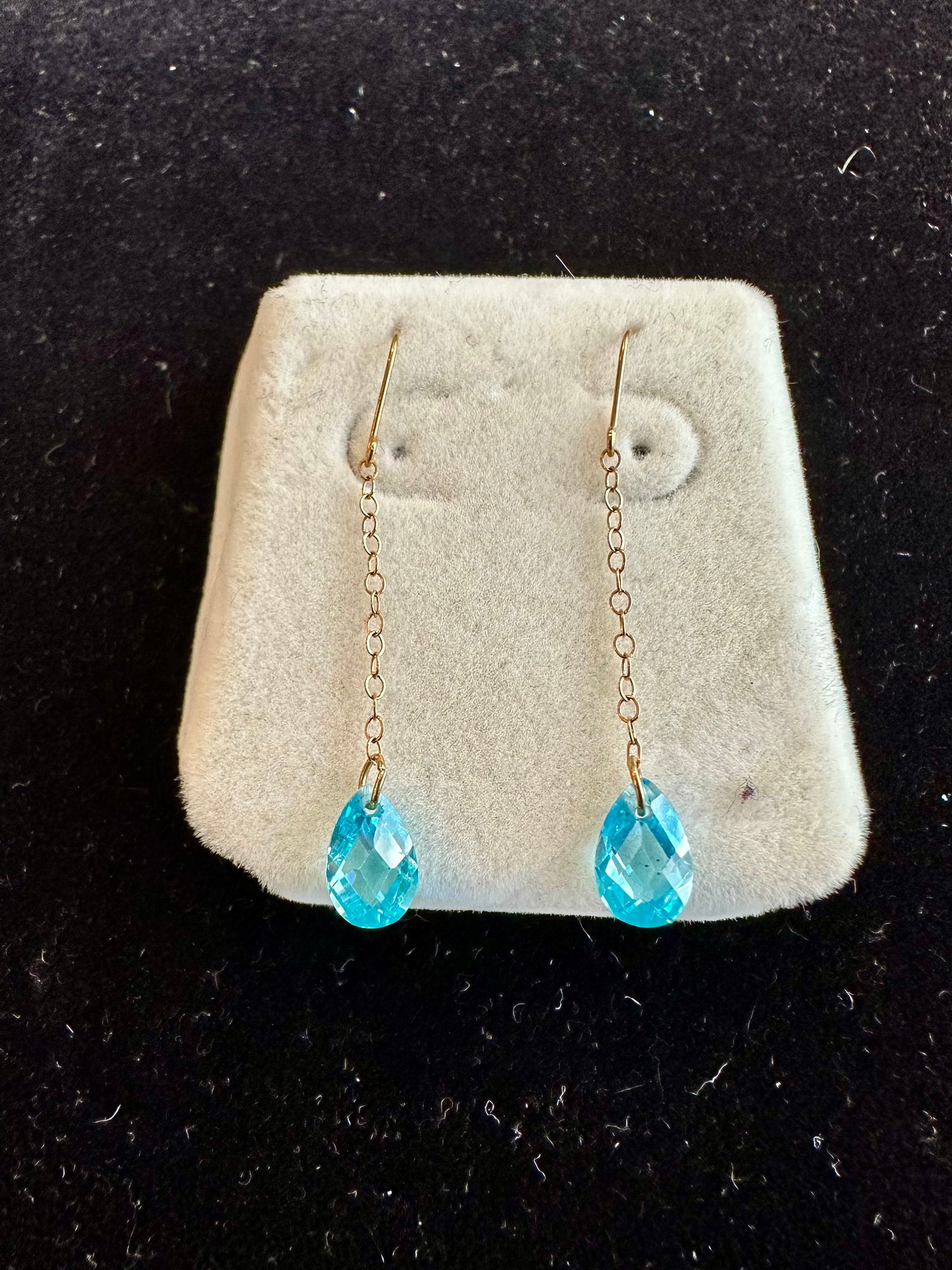 Suspended on delicate 14K chains, cerulean blue crystals reflect the light on the beautiful dangle earrings