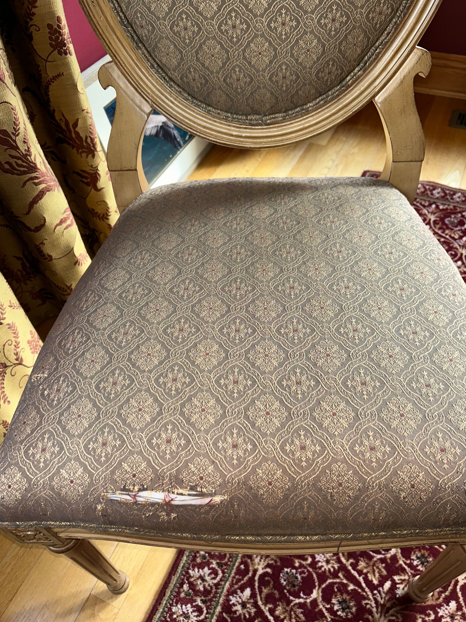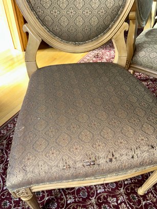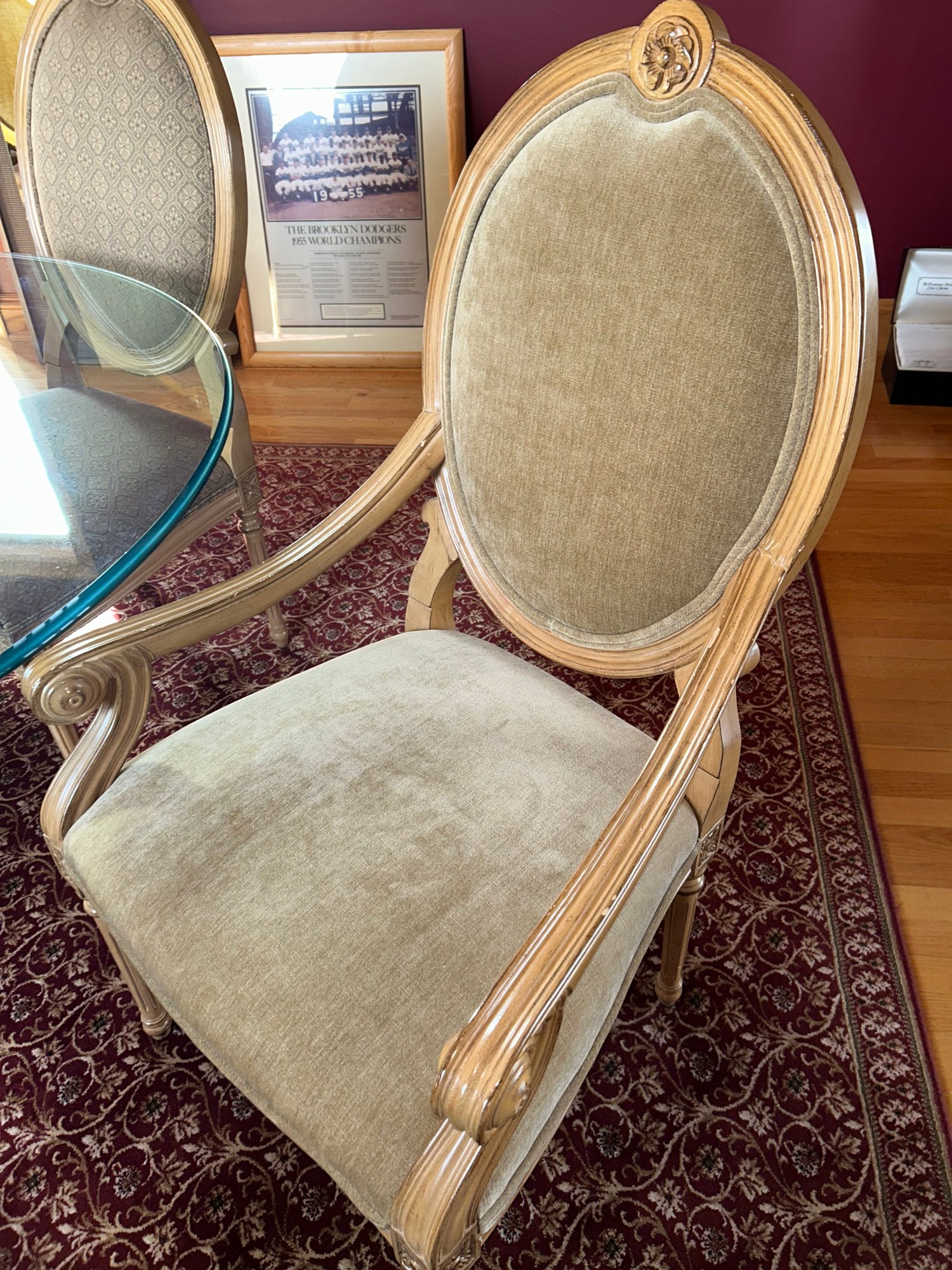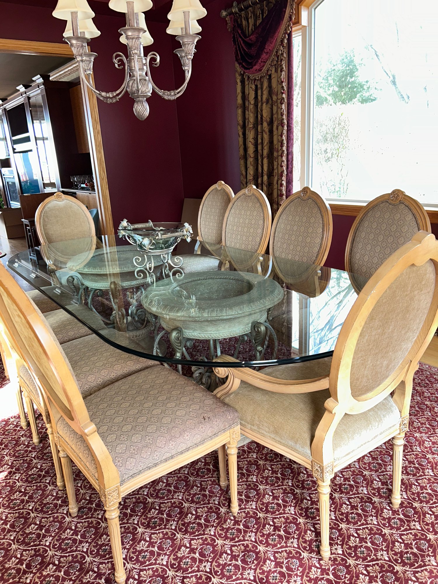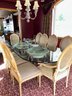 Includes table & 10 chairs - 2 arm, 8 side. 2 side chairs have ripped upholstery.