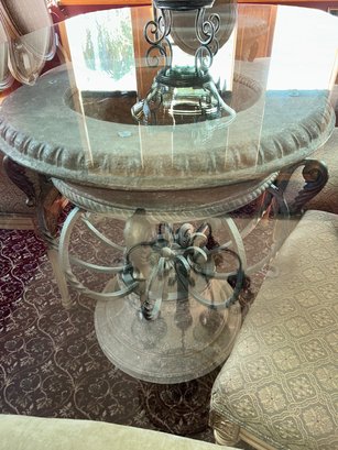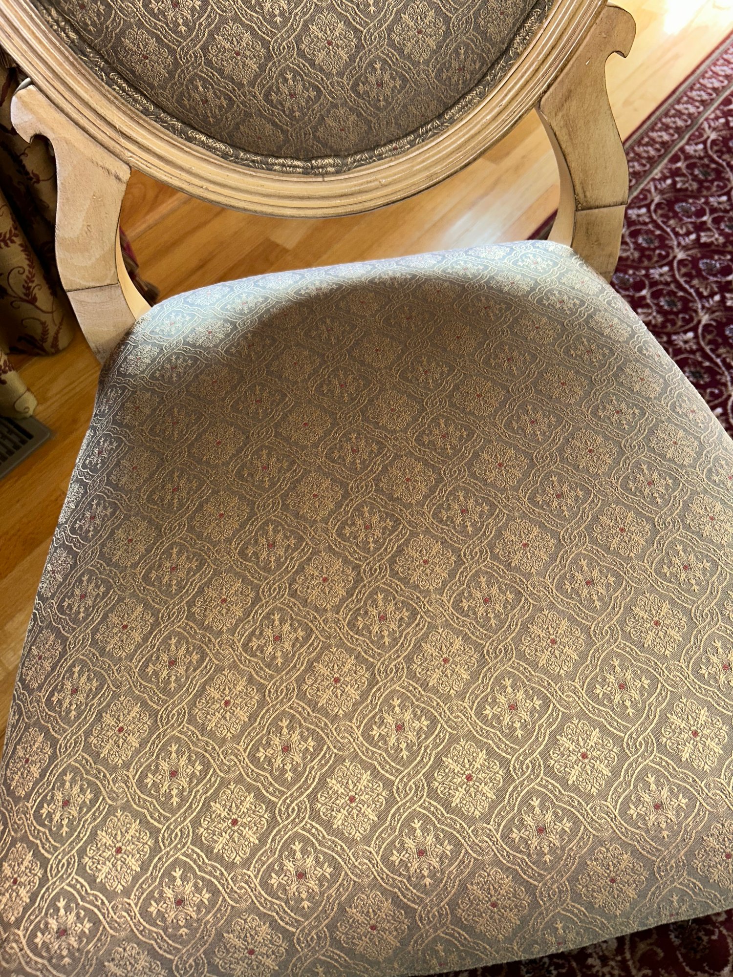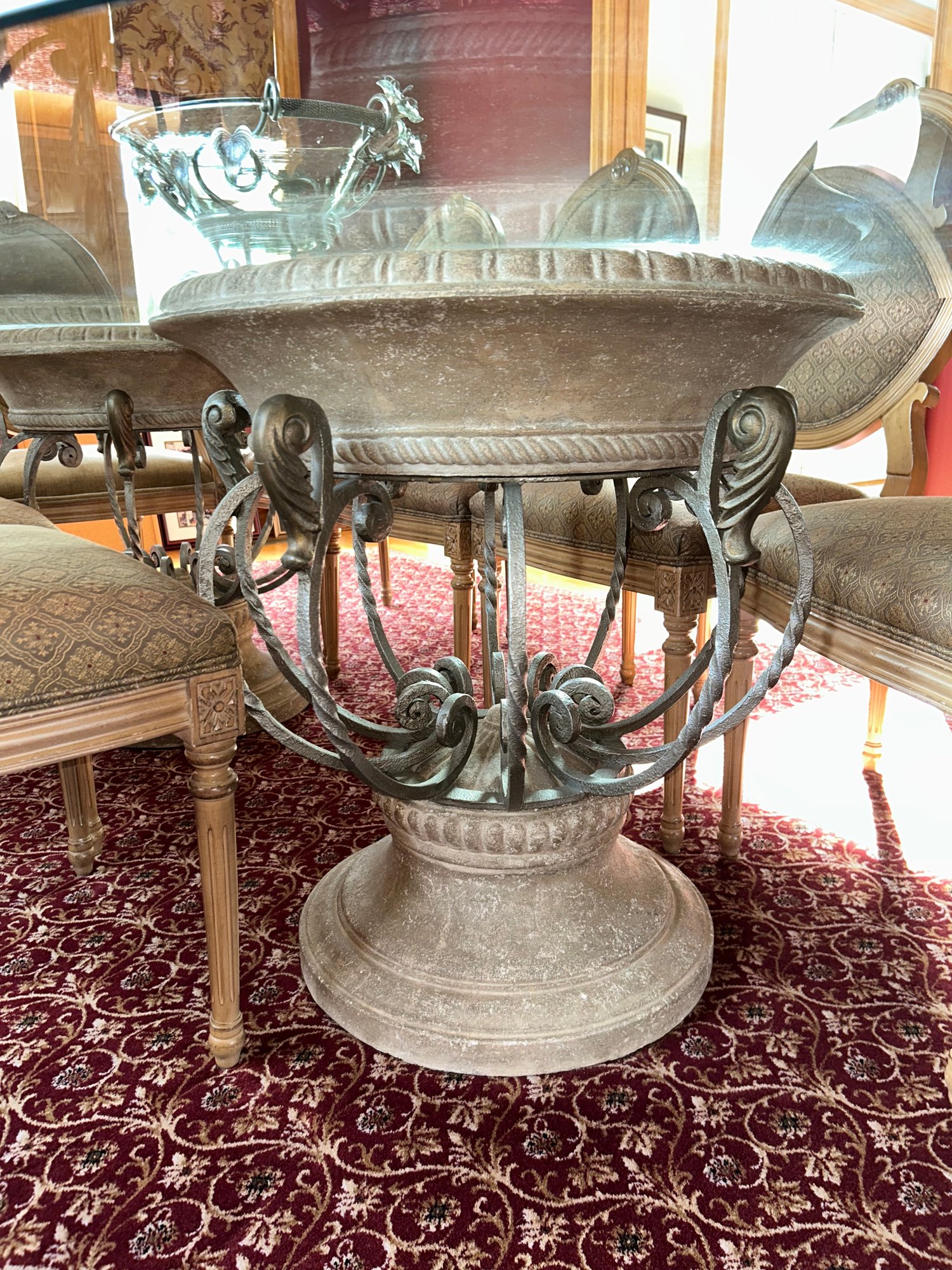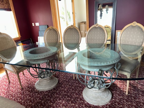 Includes table & 10 chairs - 2 arm, 8 side. 2 side chairs have ripped upholstery.