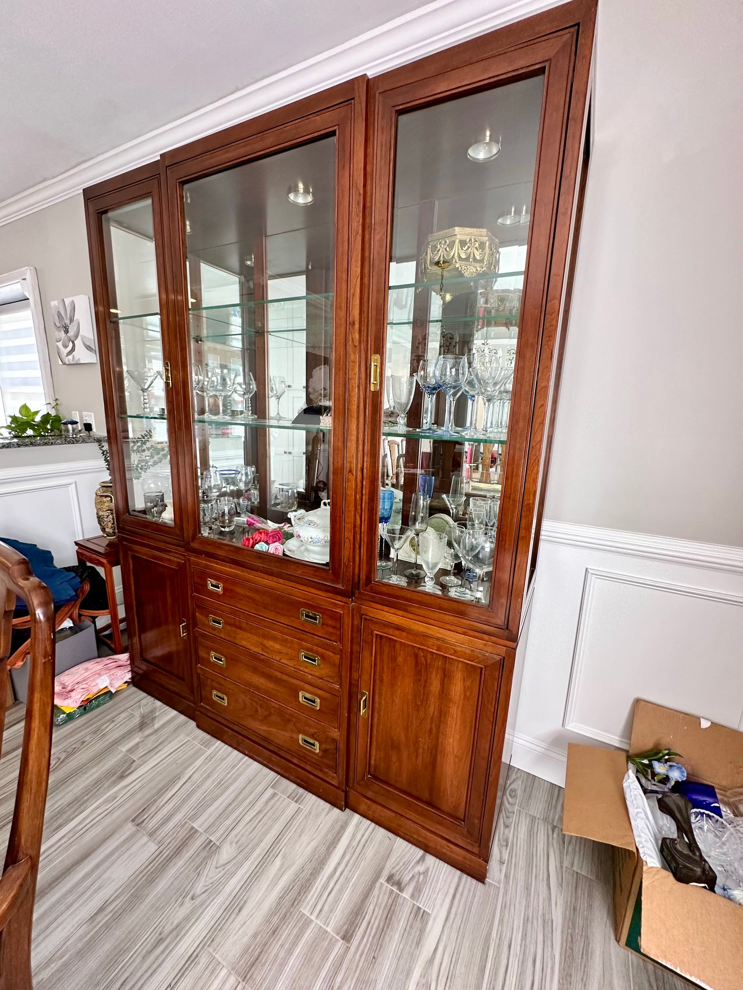 Can be separated into 2 different pieces, in excellent condition. Lights up.Bring help to carry out.