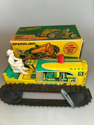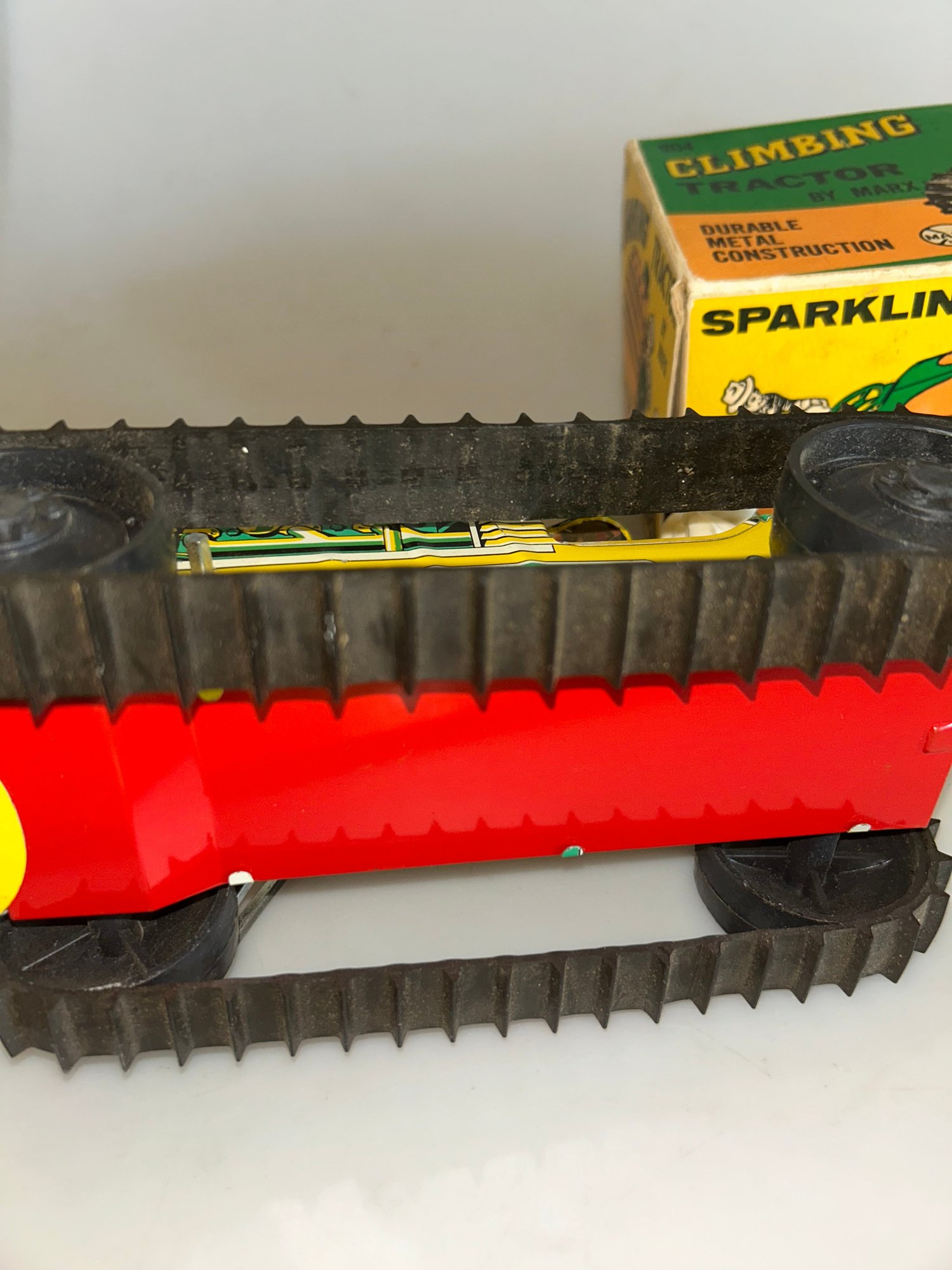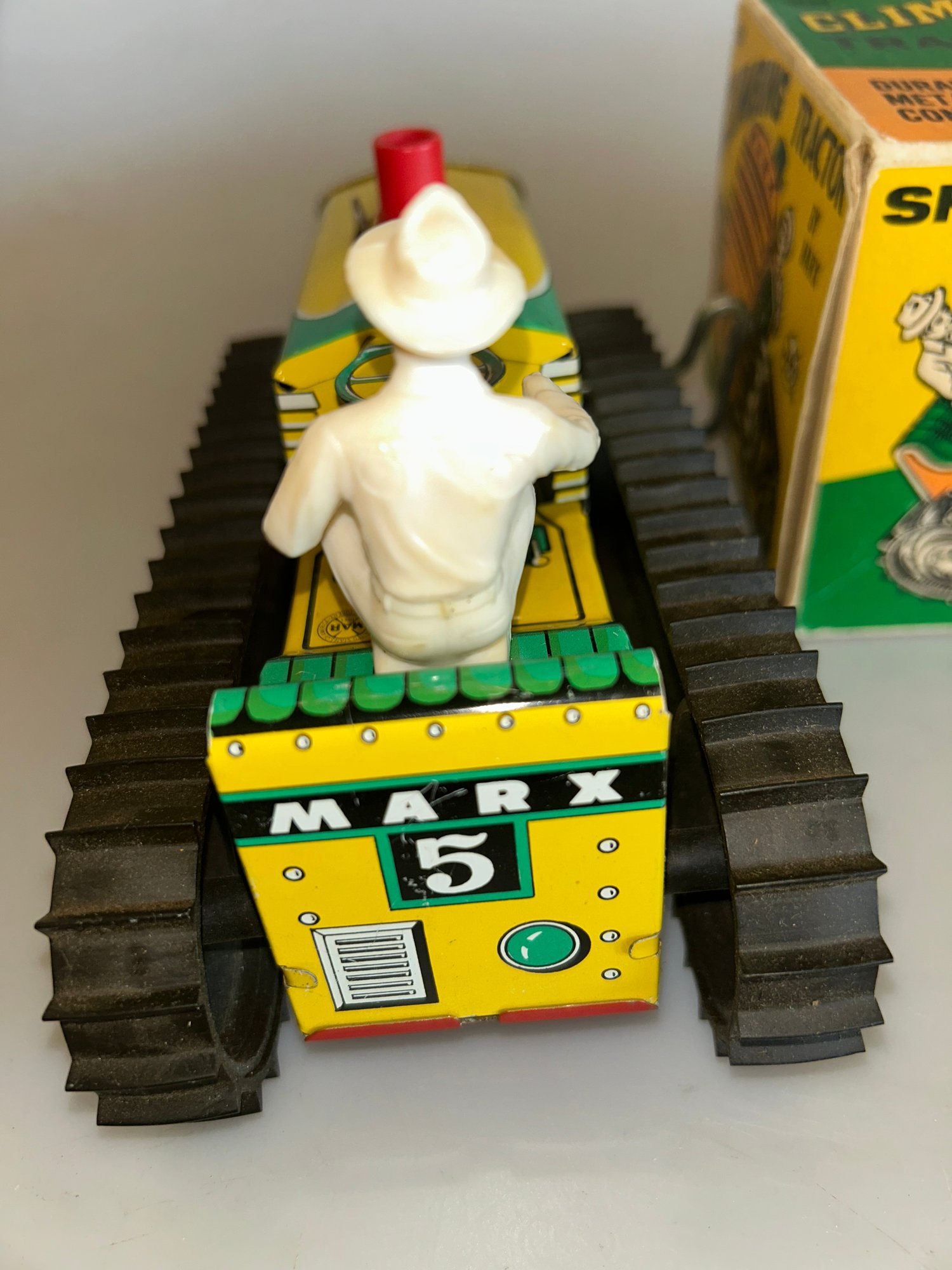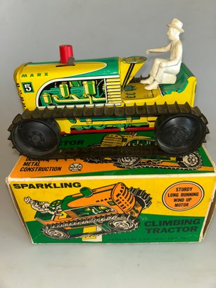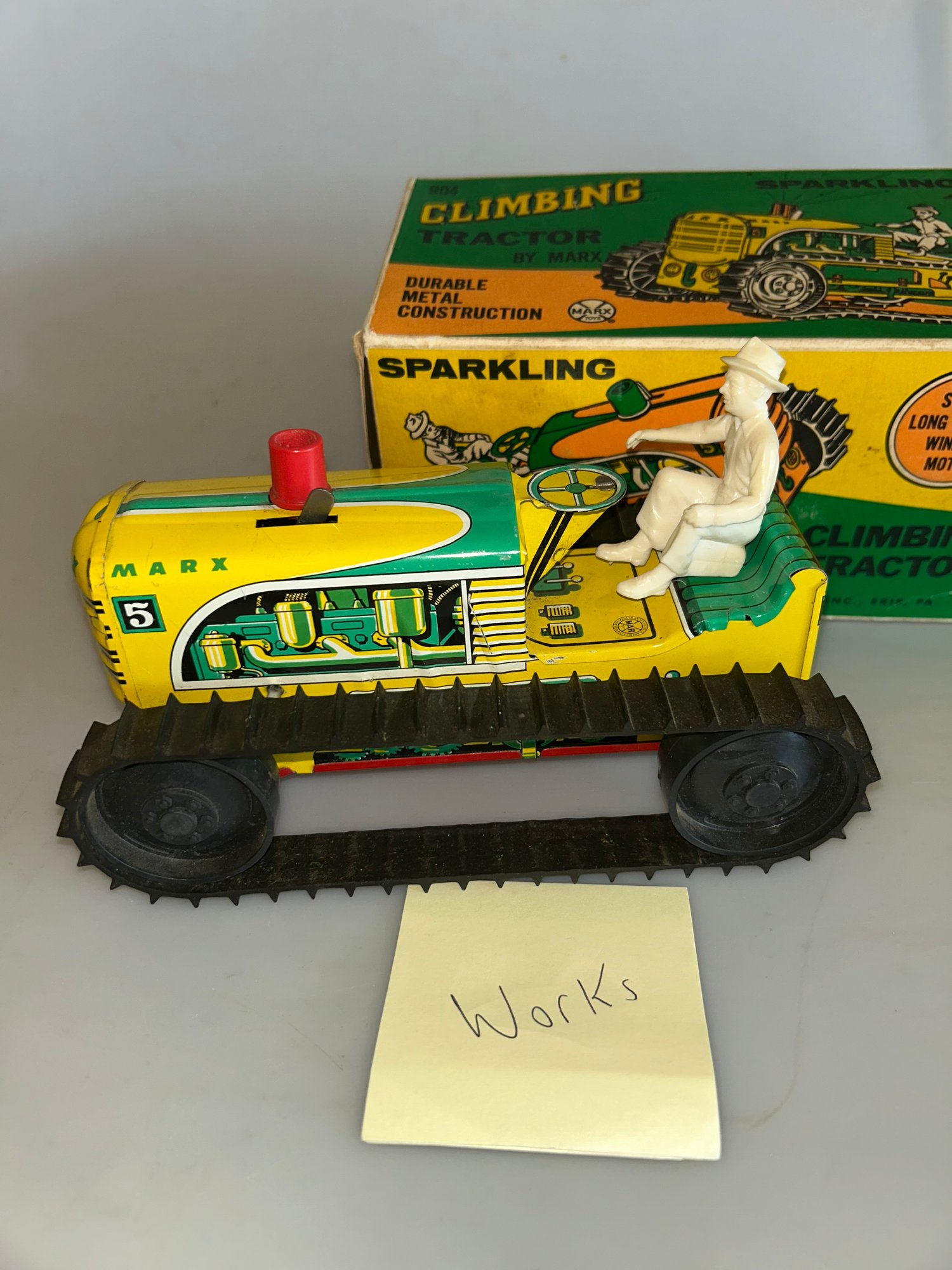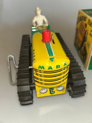 MARX 1950's CLIMBING TRACTOR SET SPARKLING TIN MIB WINDUP TOY YELLOW WITH BOX