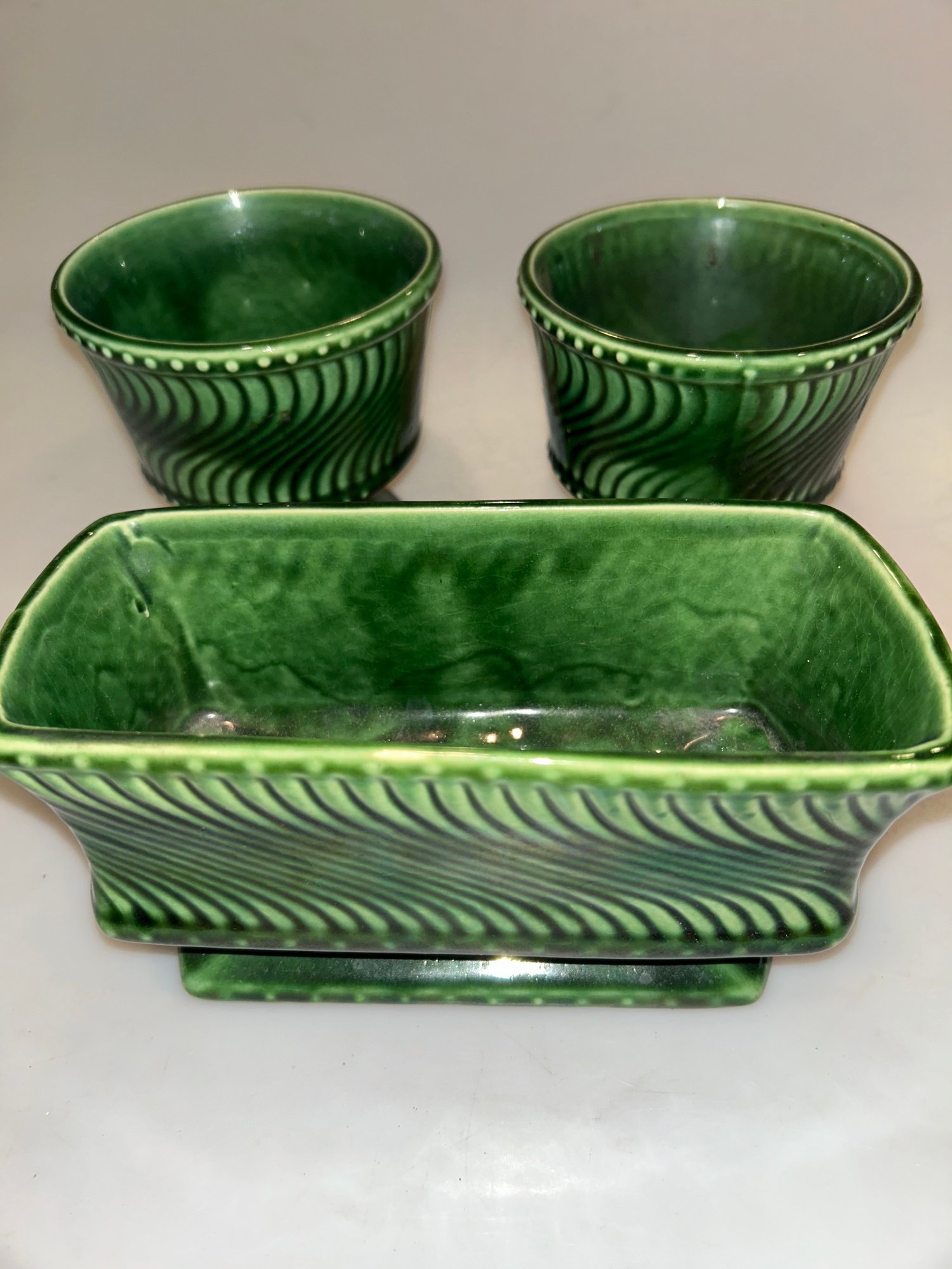 McCoy Floraline Pedestal Green Swirl Pottery Planter & 2 Pots