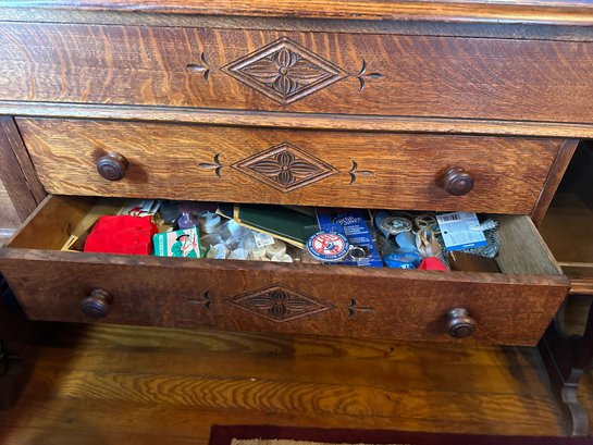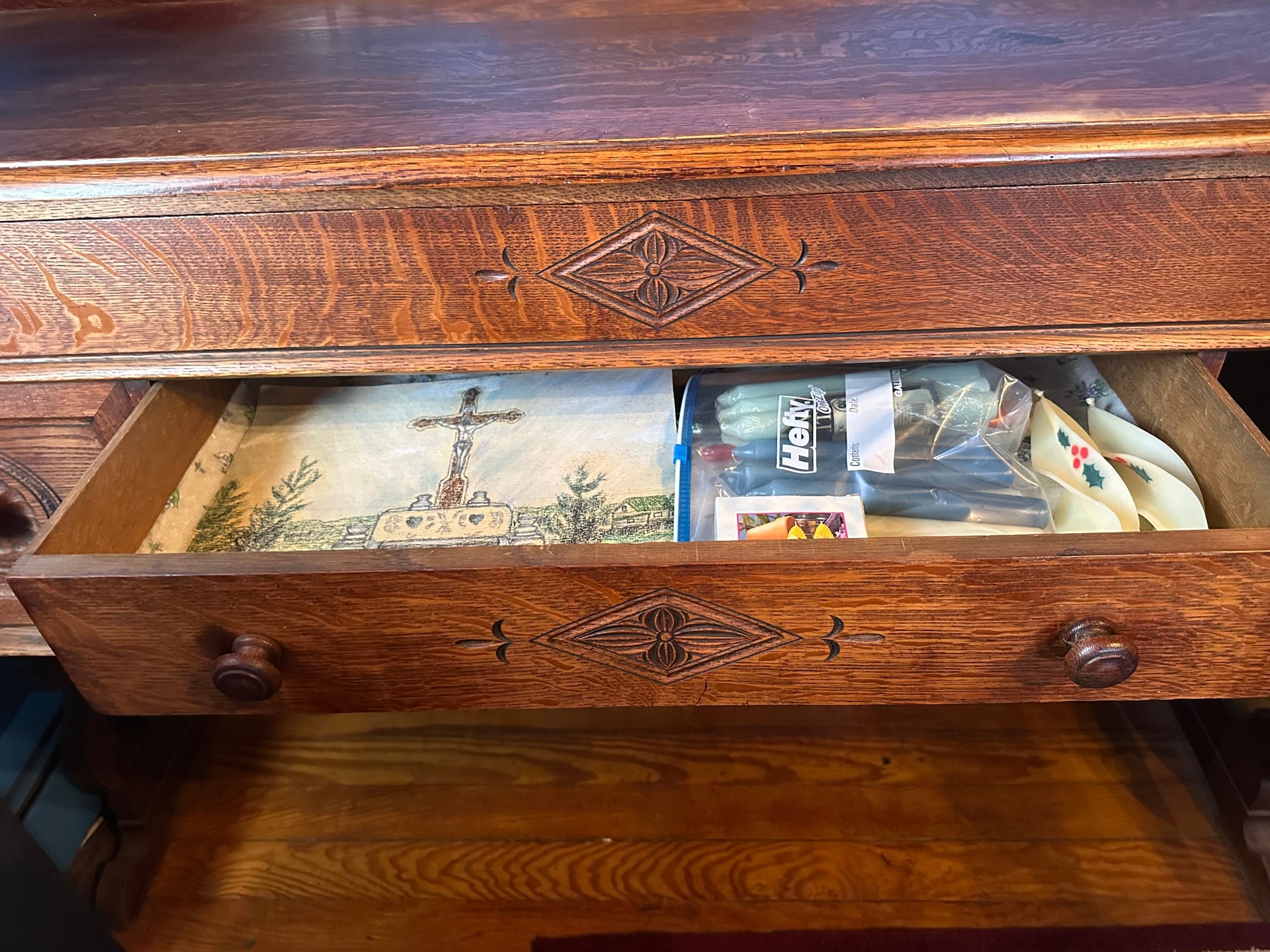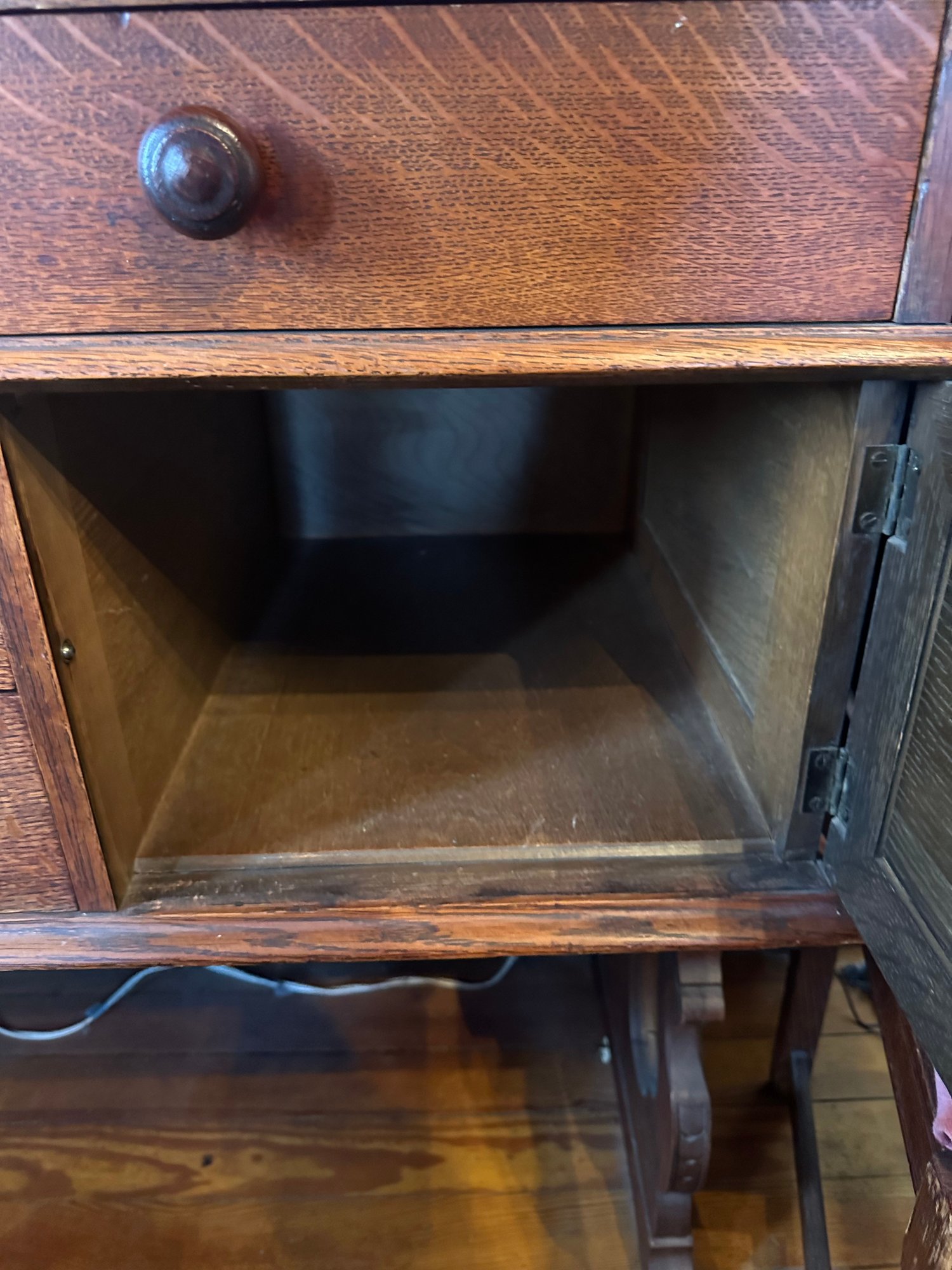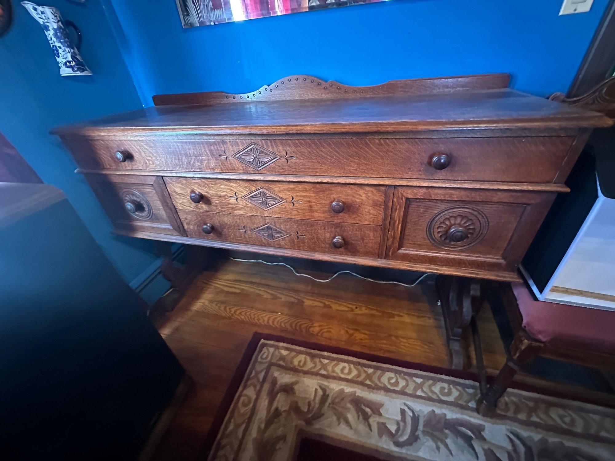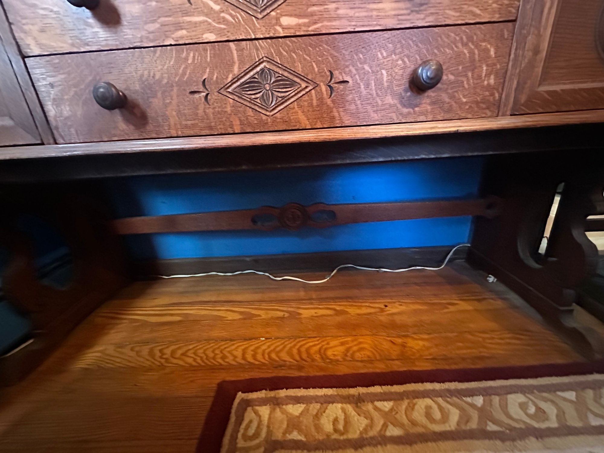 Decorative diamond-shaped inlays and brass hardware, beautiful condition