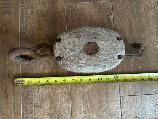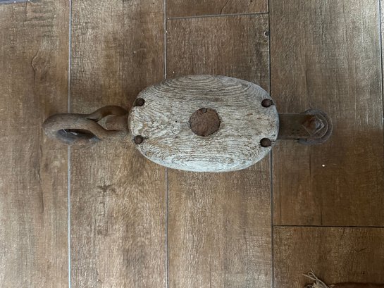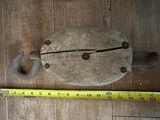Vintage Single Rope Wooden Block Pulley With Hook