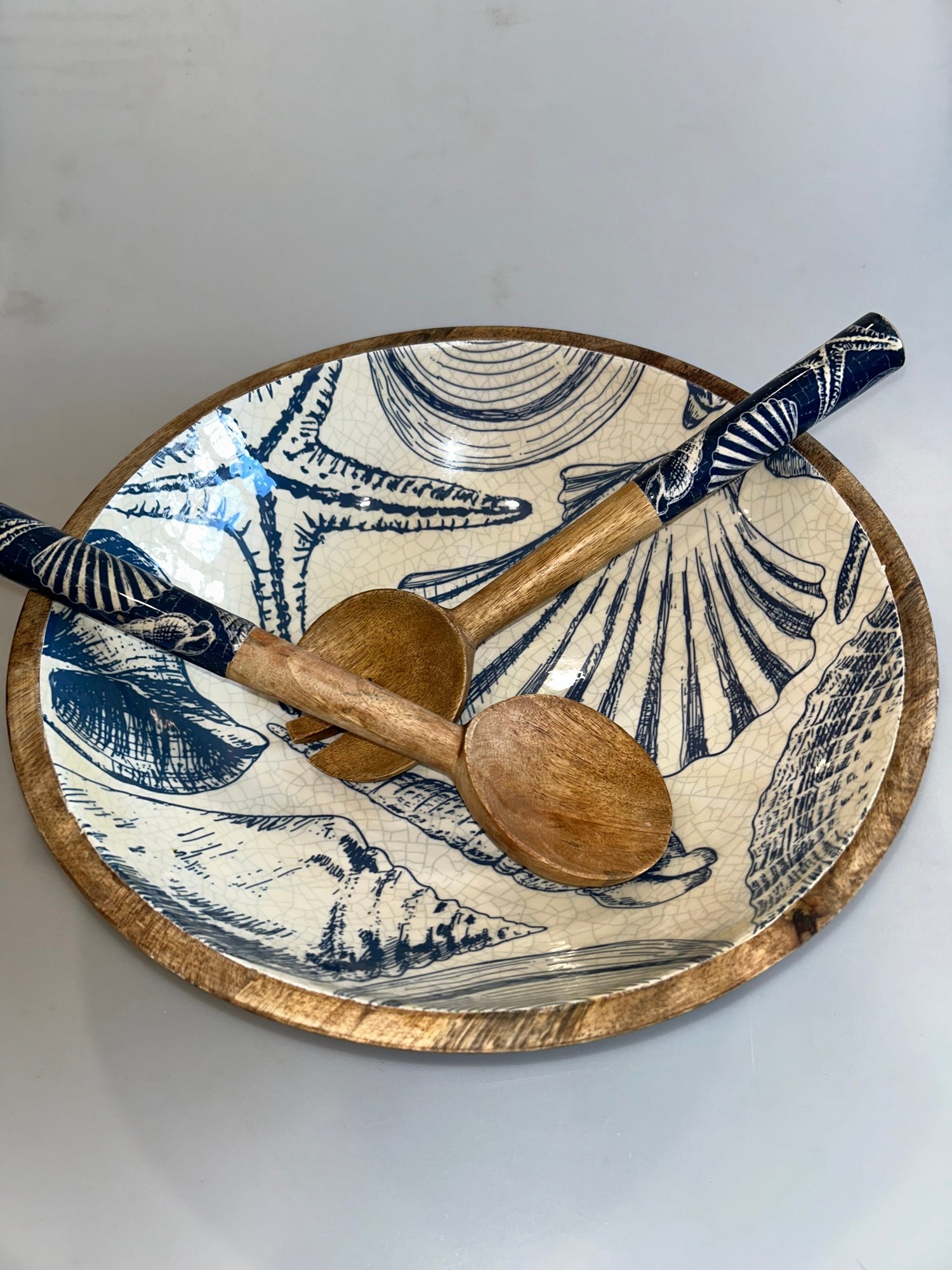 Wood & Enamel Coastal Seashell Serving Bowl & Utensils