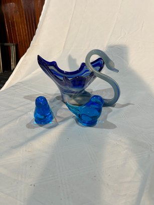 3 glass birds, one vintage hand blown blue swan. The two small blue birds signed Leo Ware 1984