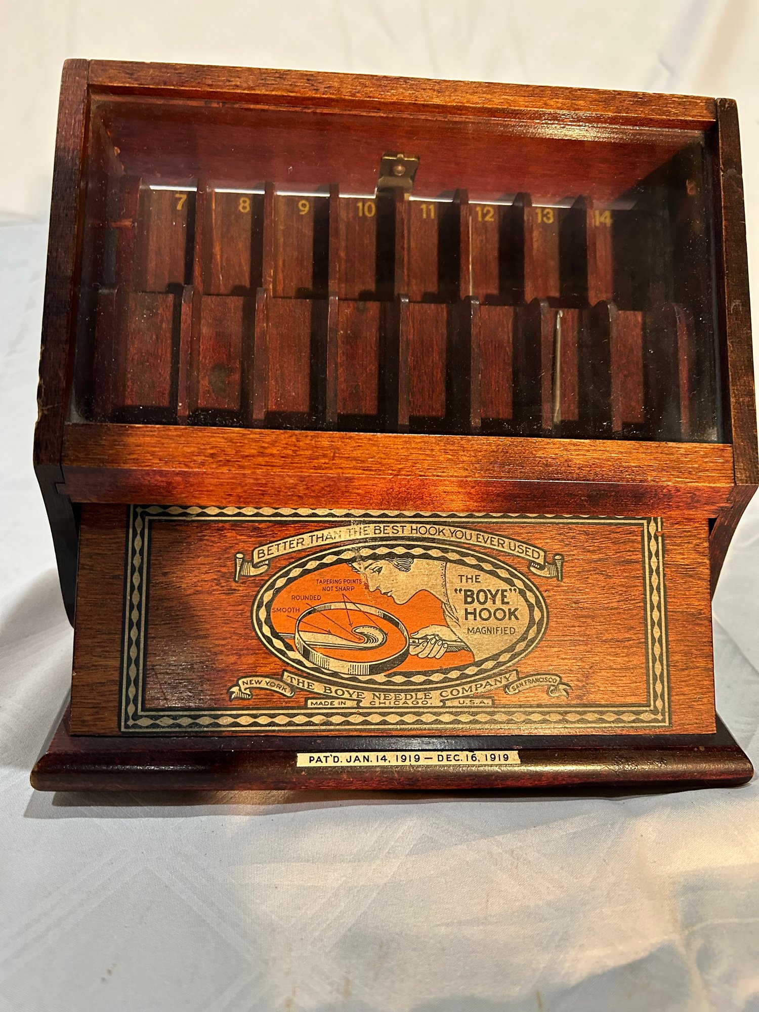 Boye Hook Needle Company Display made in Chicago, it comes with three crochet hooks 5, 7, 12. Minor dinge on back (see Picture). 7 1/2" high by 6 in deep, 8" wide