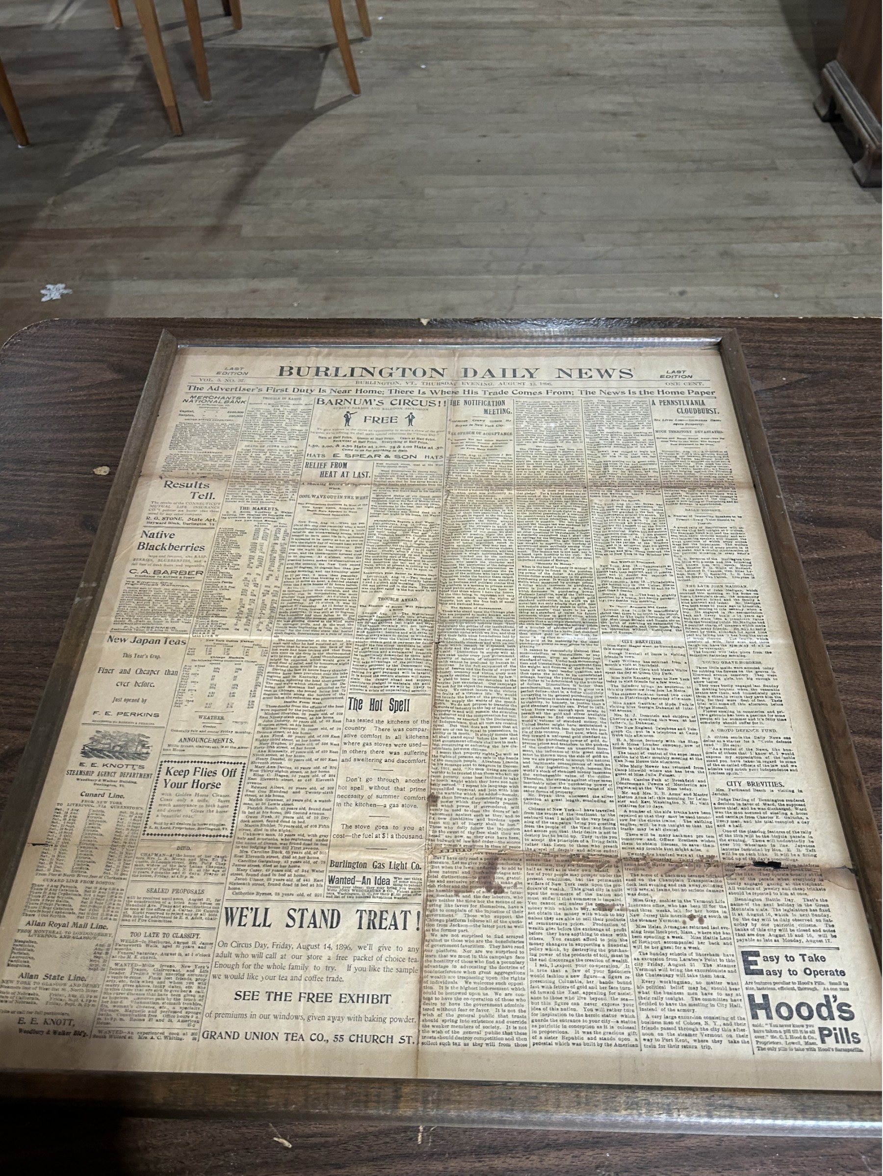 Framed Burlington, Vermont, Burlington Daily News Dated August 13, 1896. Double Sided