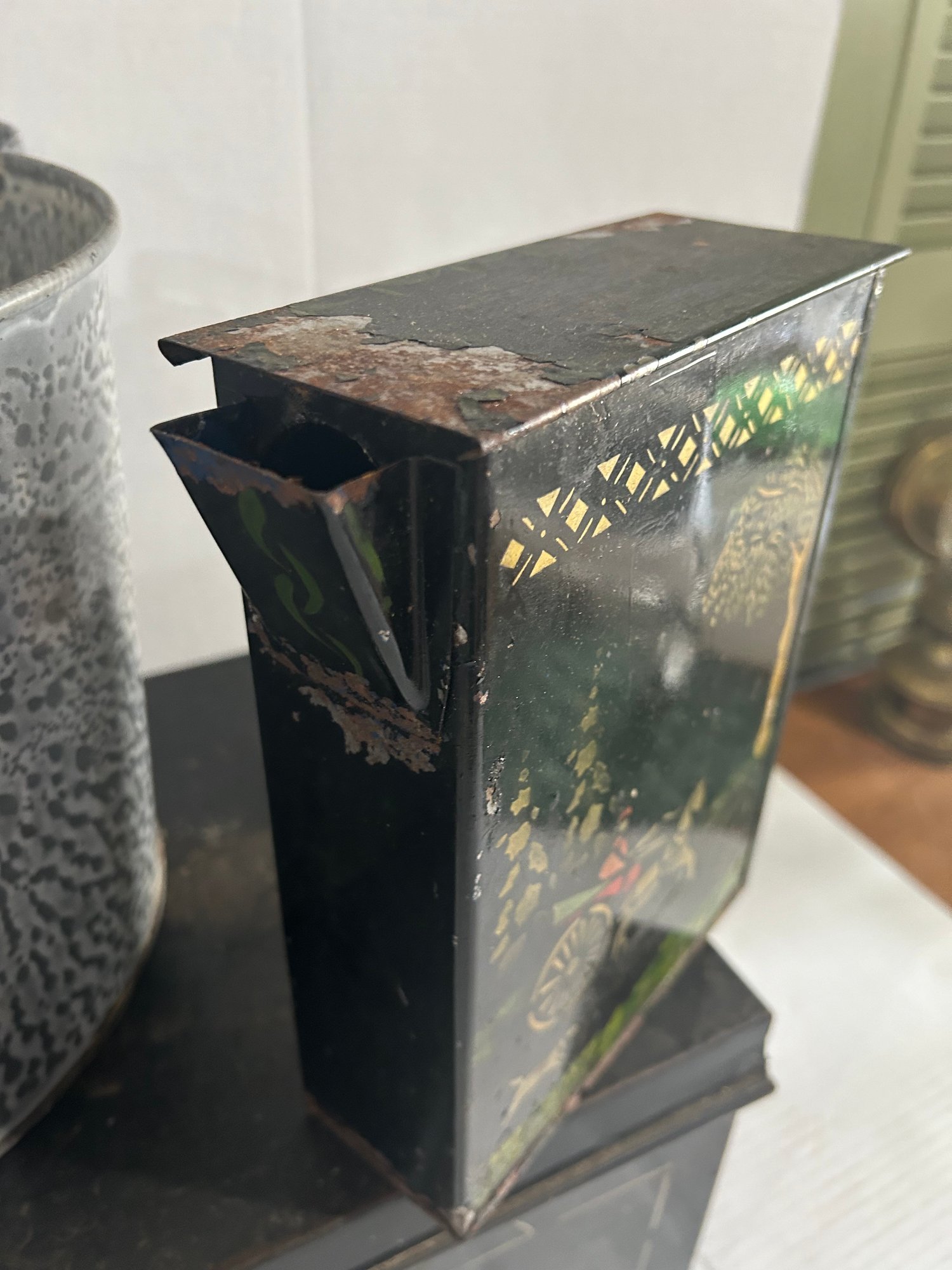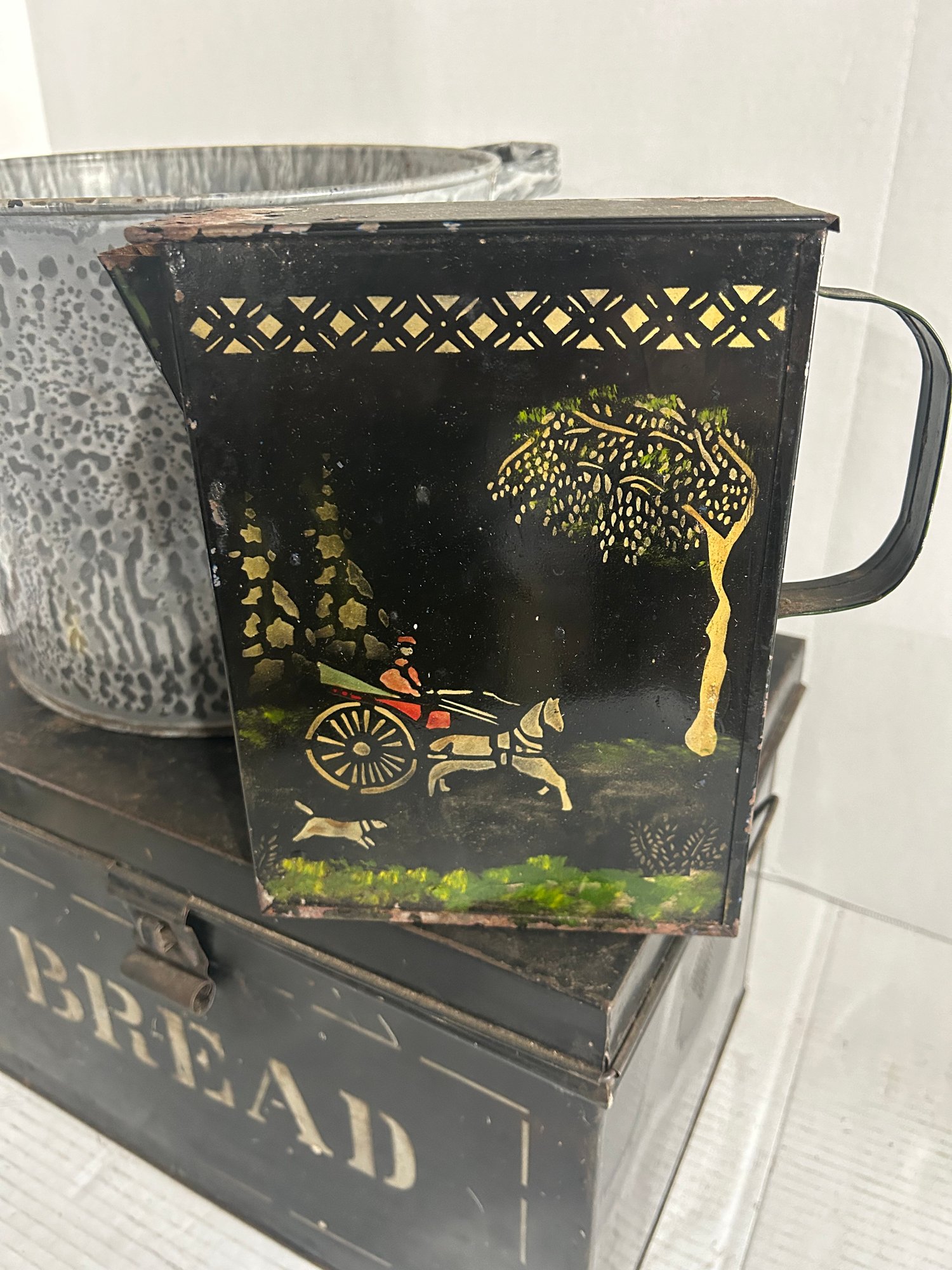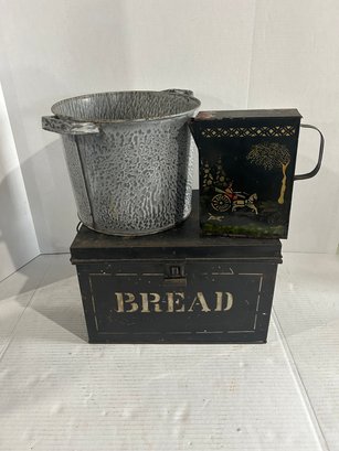 Lot 112-bread Box, Enamel Pot, And Tin Pitcher
