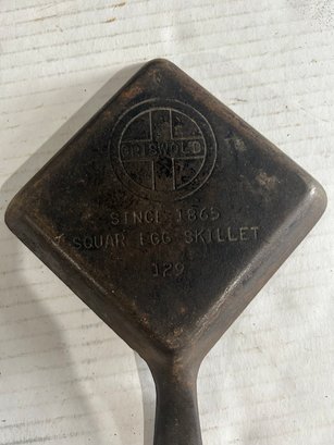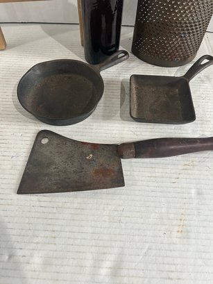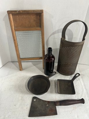 Lot 115-griswold 129 Square Eg Skillet, Cleaver, Large Grater Washboard And Bottle