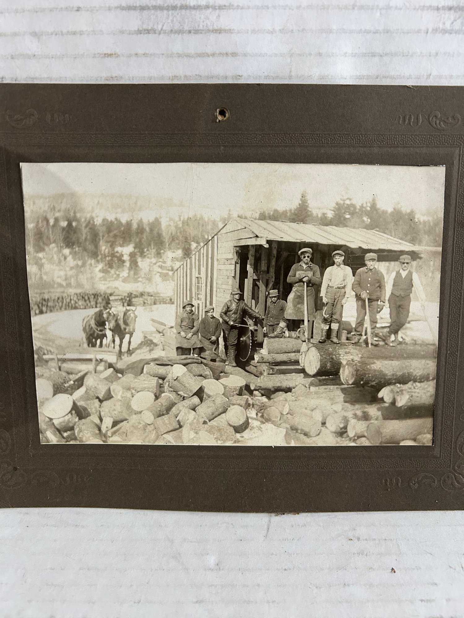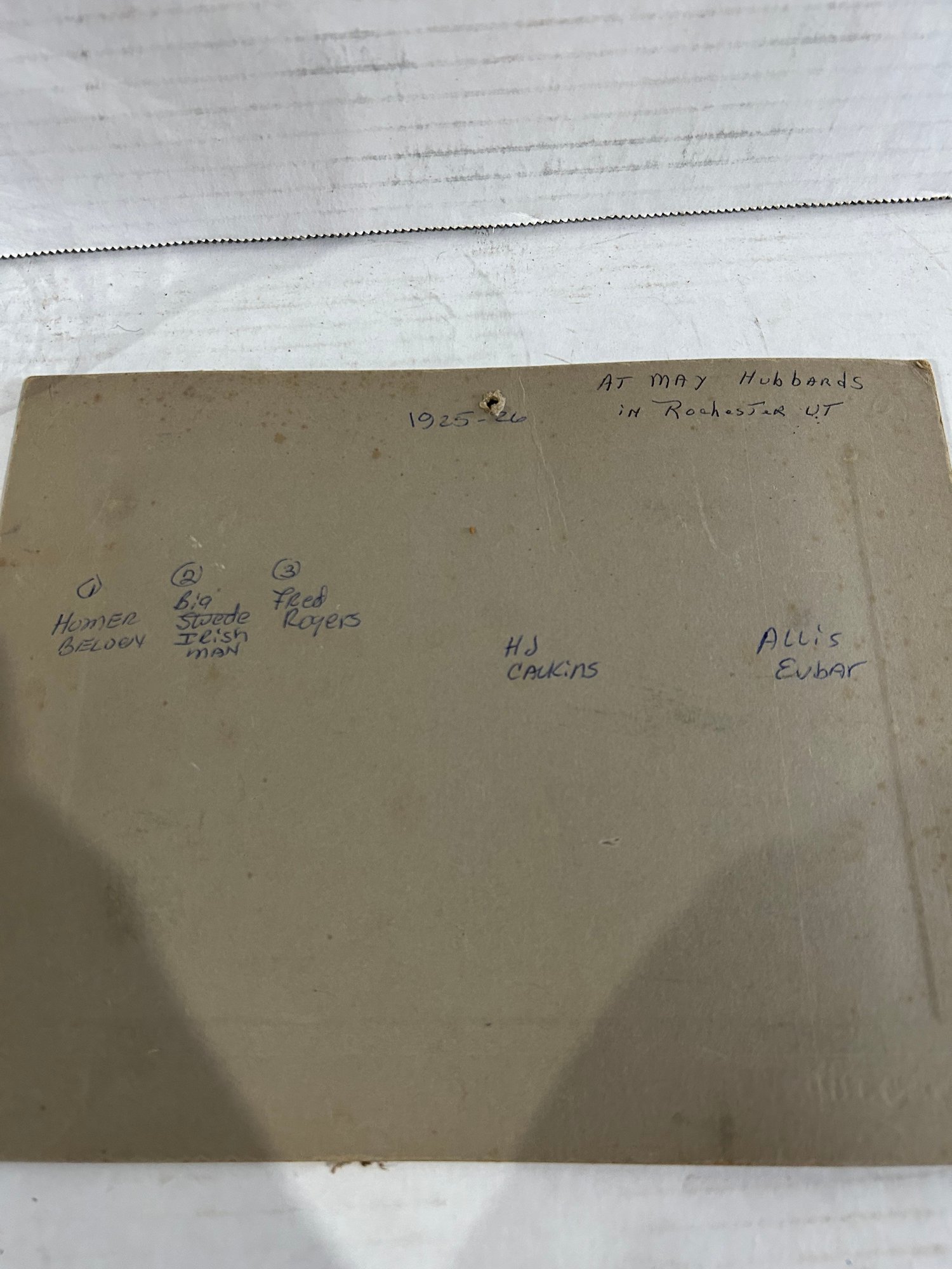 100 year old photograph. Names on back include Homer Beldon, Fred Rogers, HJ Calkins, Allis Eubar. Picture was at May Hubbards in Rochester, VT