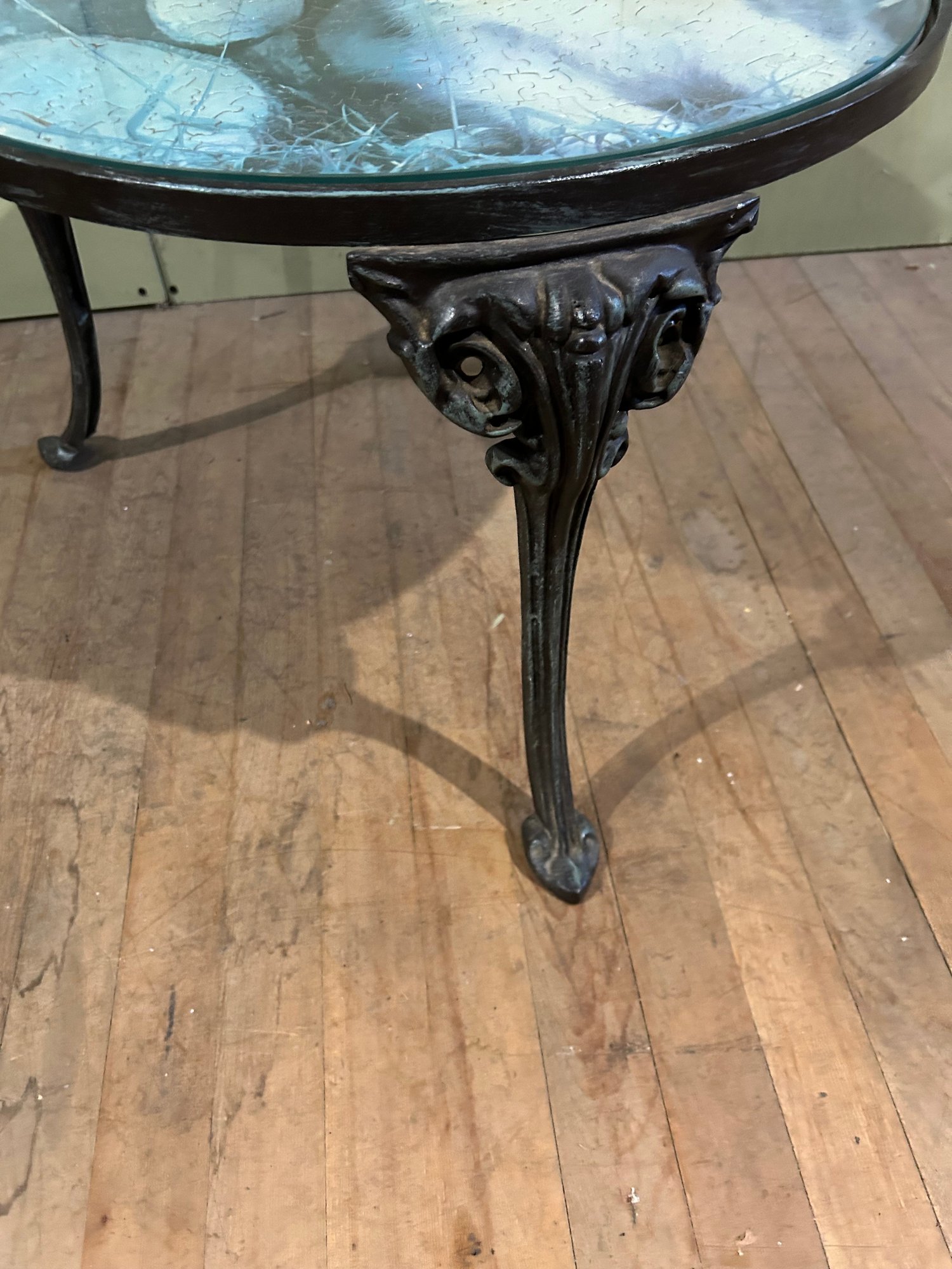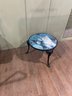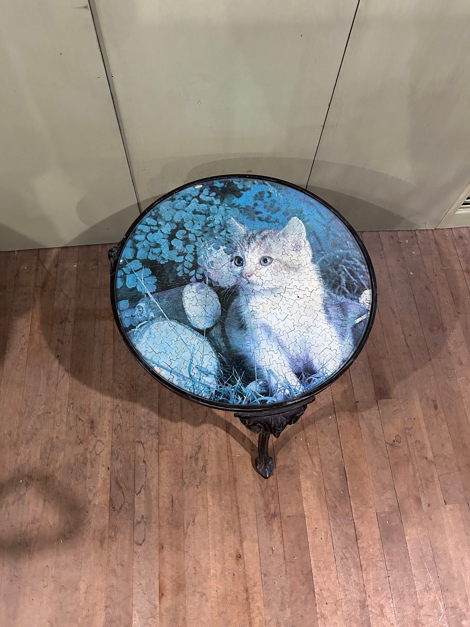 Lot 177- Small Round Metal Accent Table With Glass Top Protecting Completed Cat Puzzle. 21wx15h