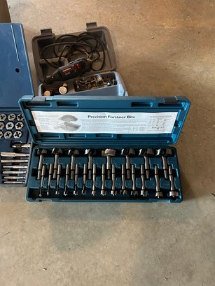 Lot 199- Tool Lot- Precision Forstener Bits, Tap And Die Set, Craftsman Router, Staplers And Sharpening Tool