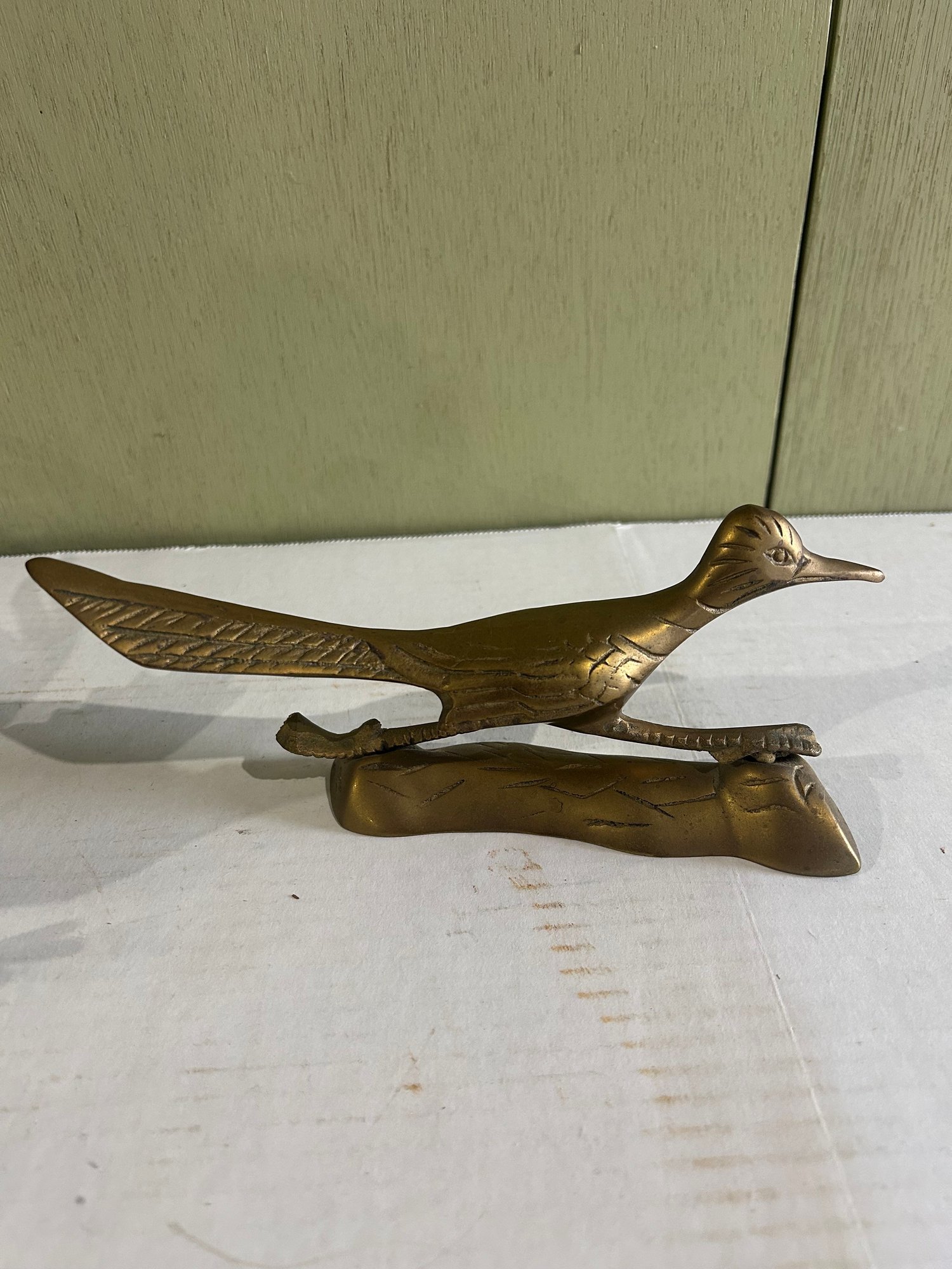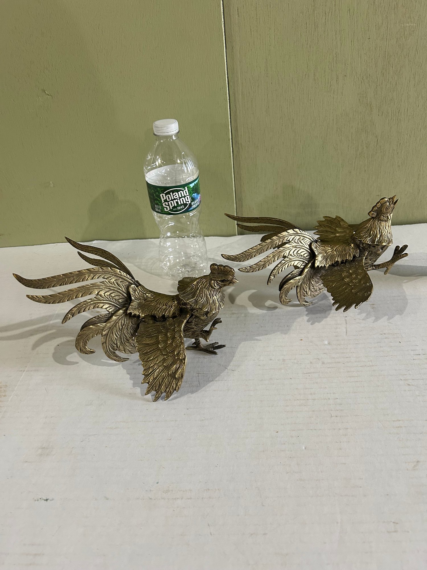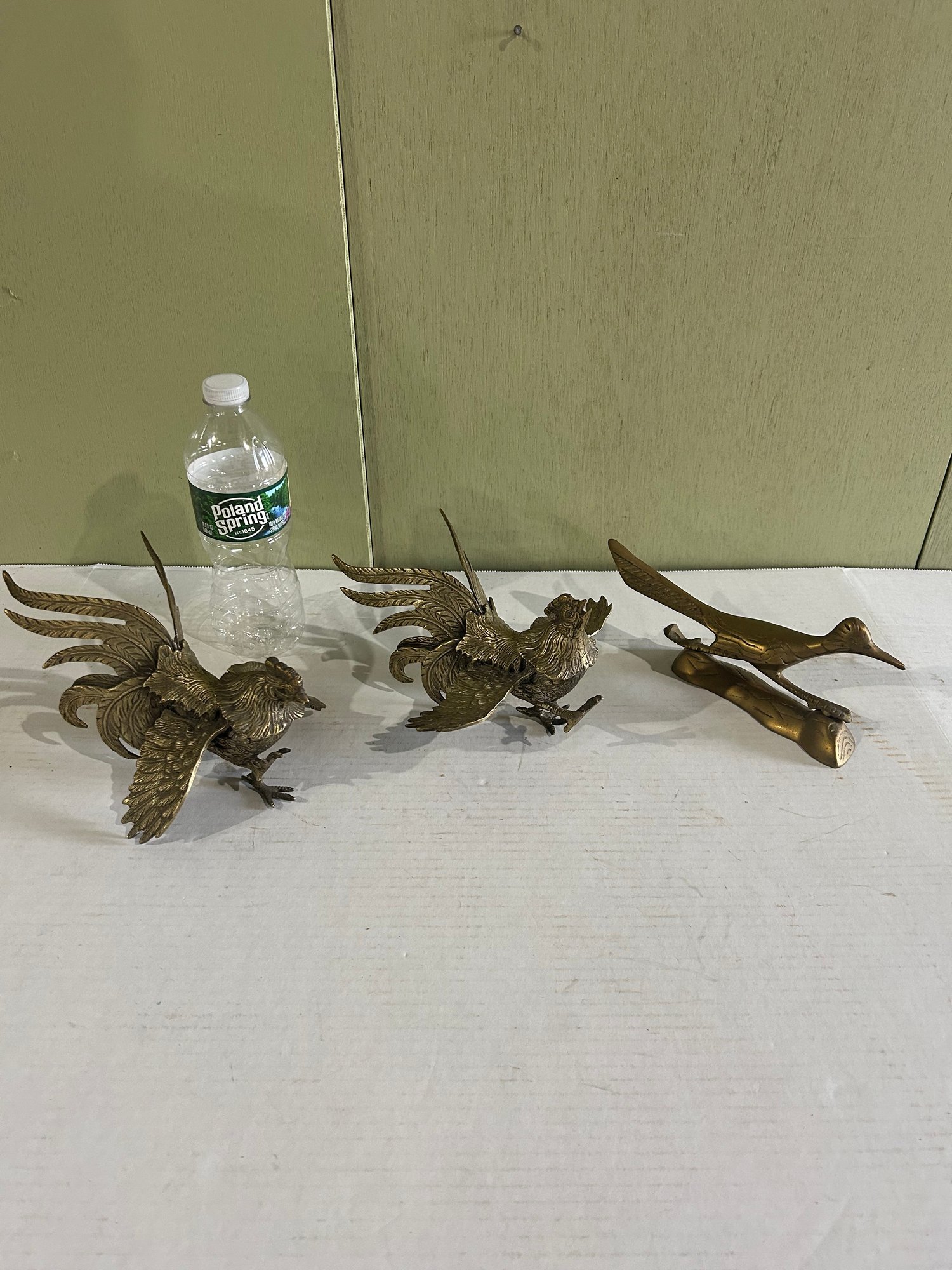 Lot 206- Three Brass Figurines. Two Fighting Roosters And A Roadrunner
