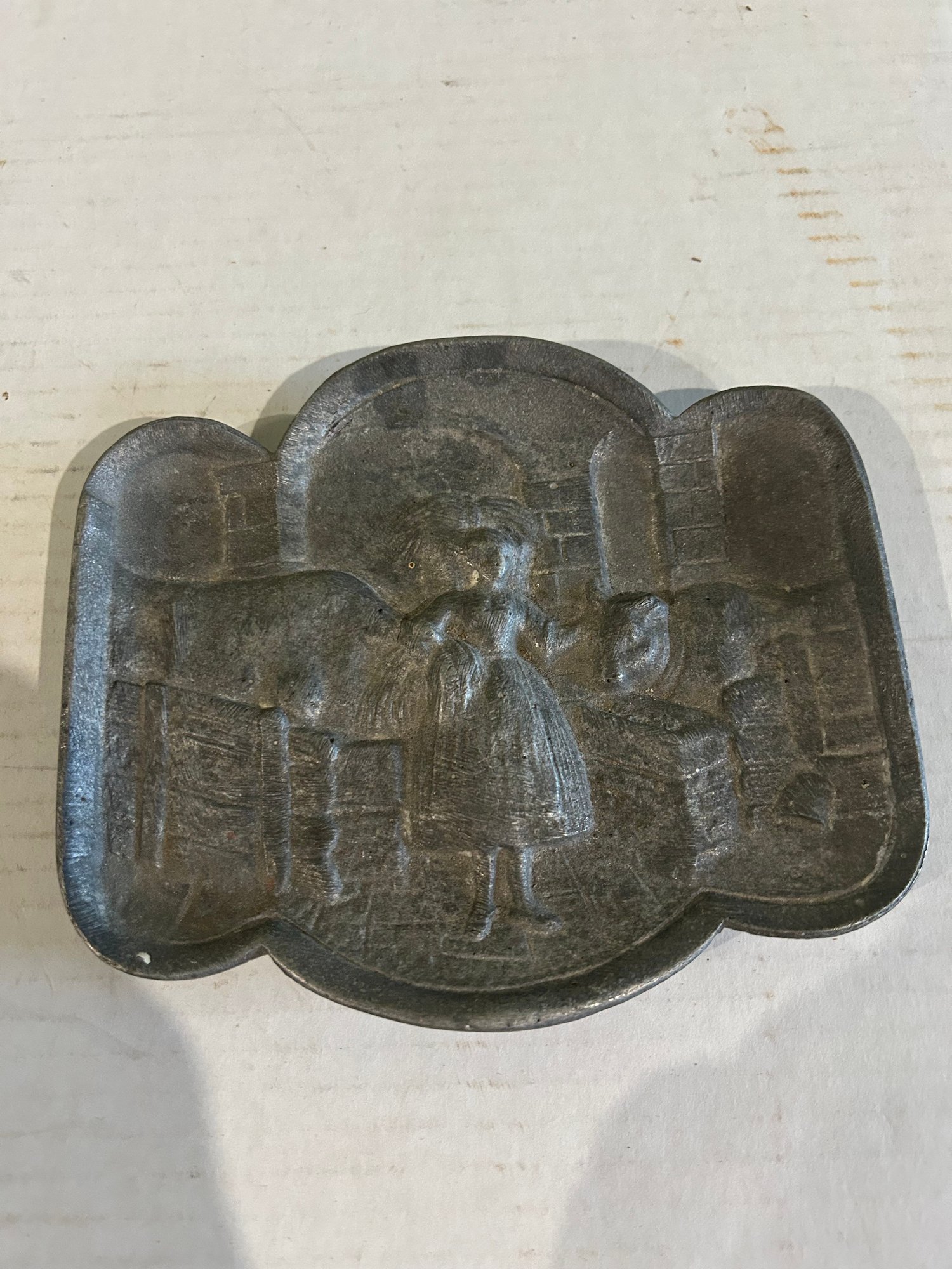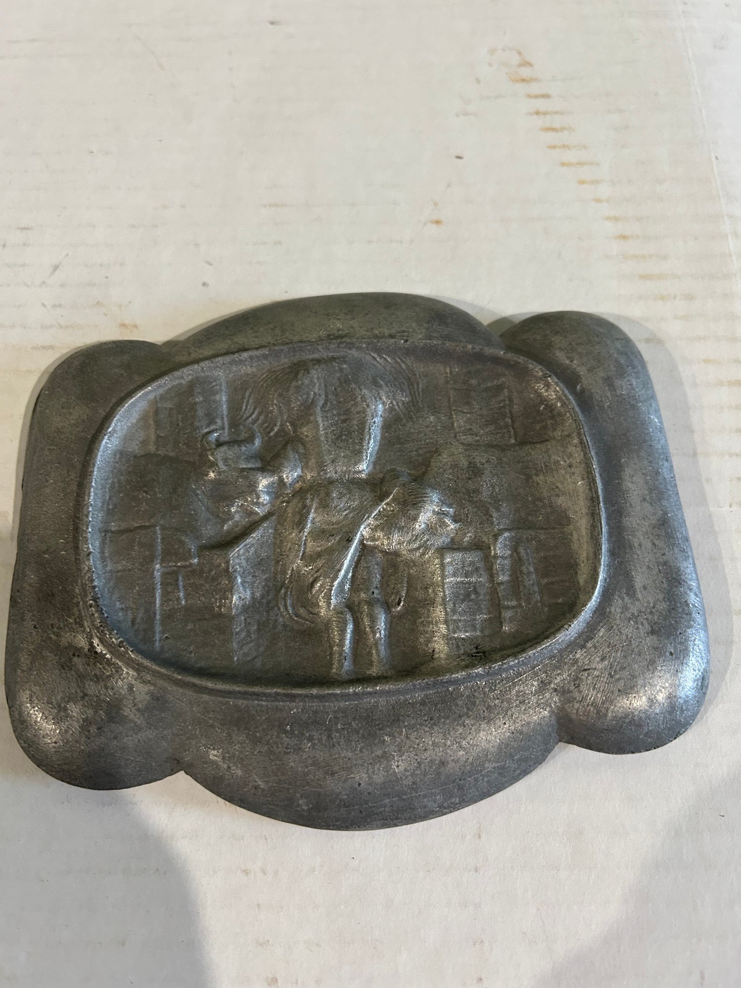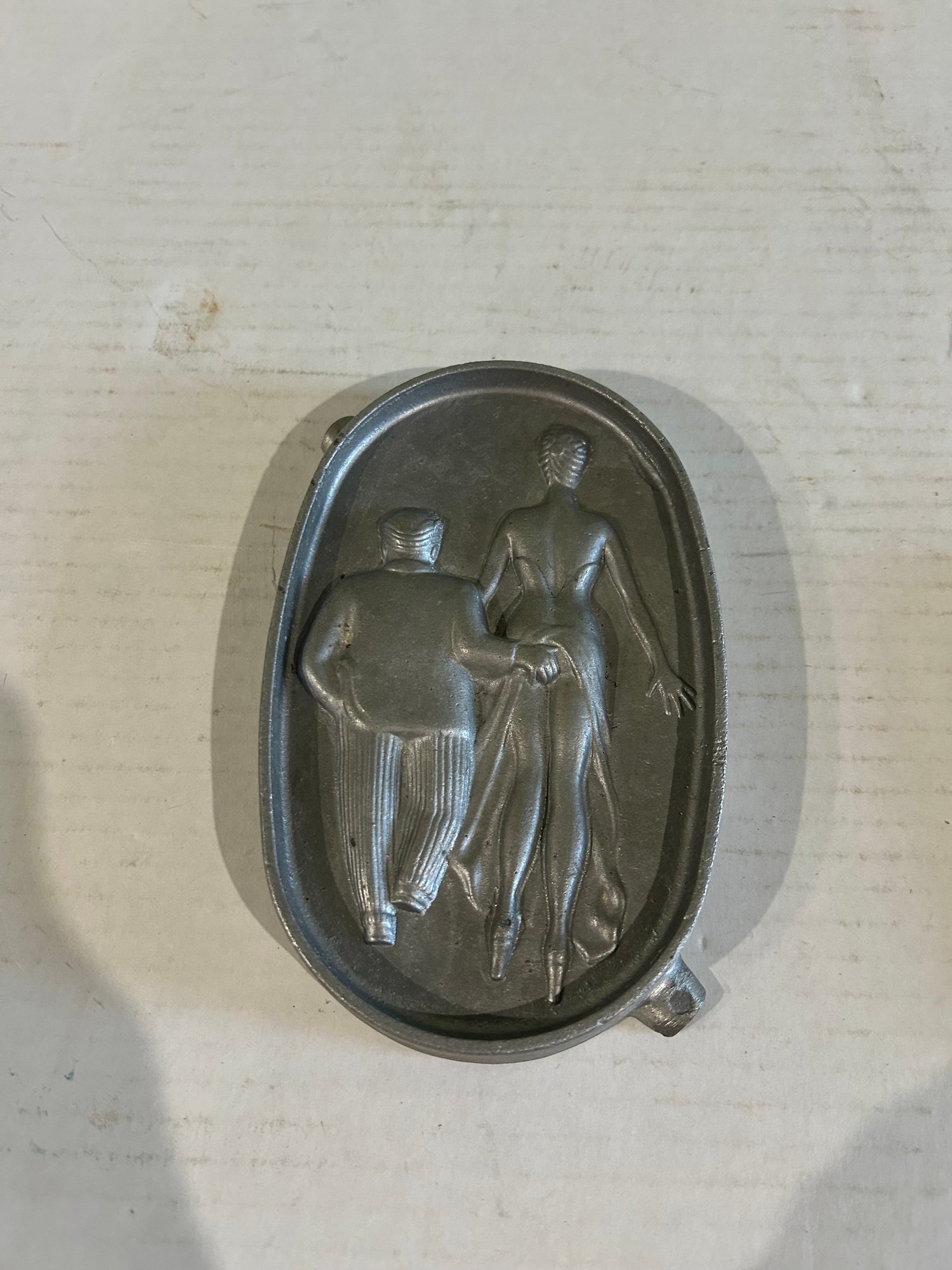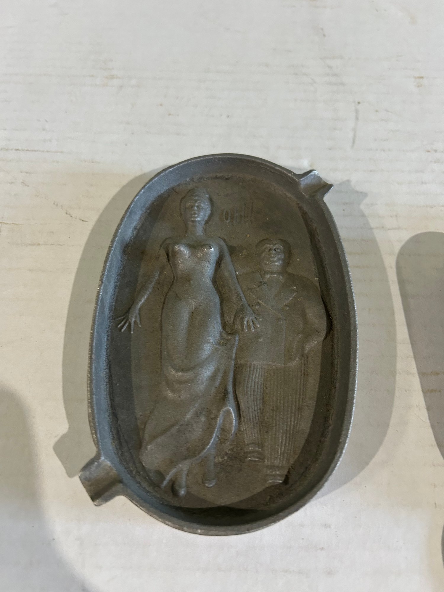 Lot 210- Fun Lot! Vintage Cooper Skillet Kitchen Thermometer, Risque Pewter Dish And Naughty Ash Tray