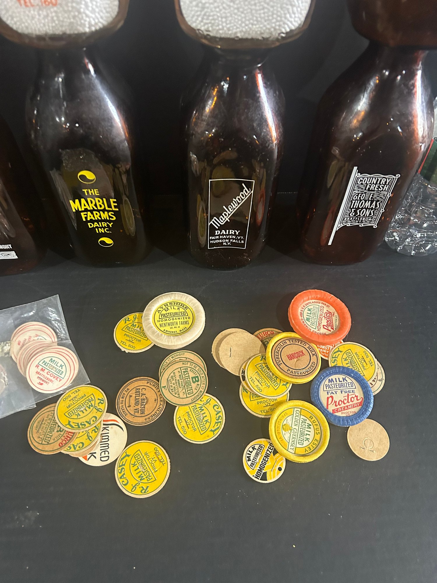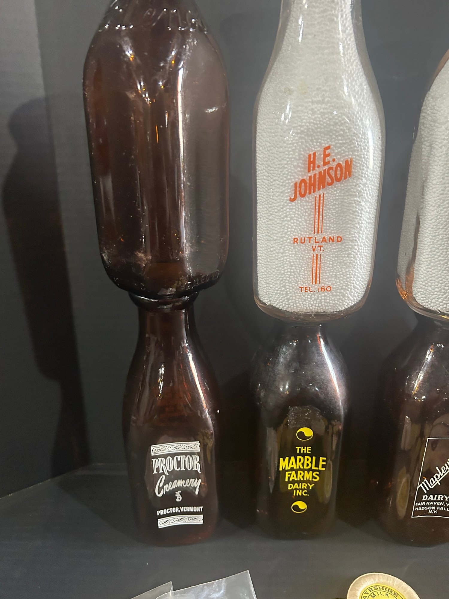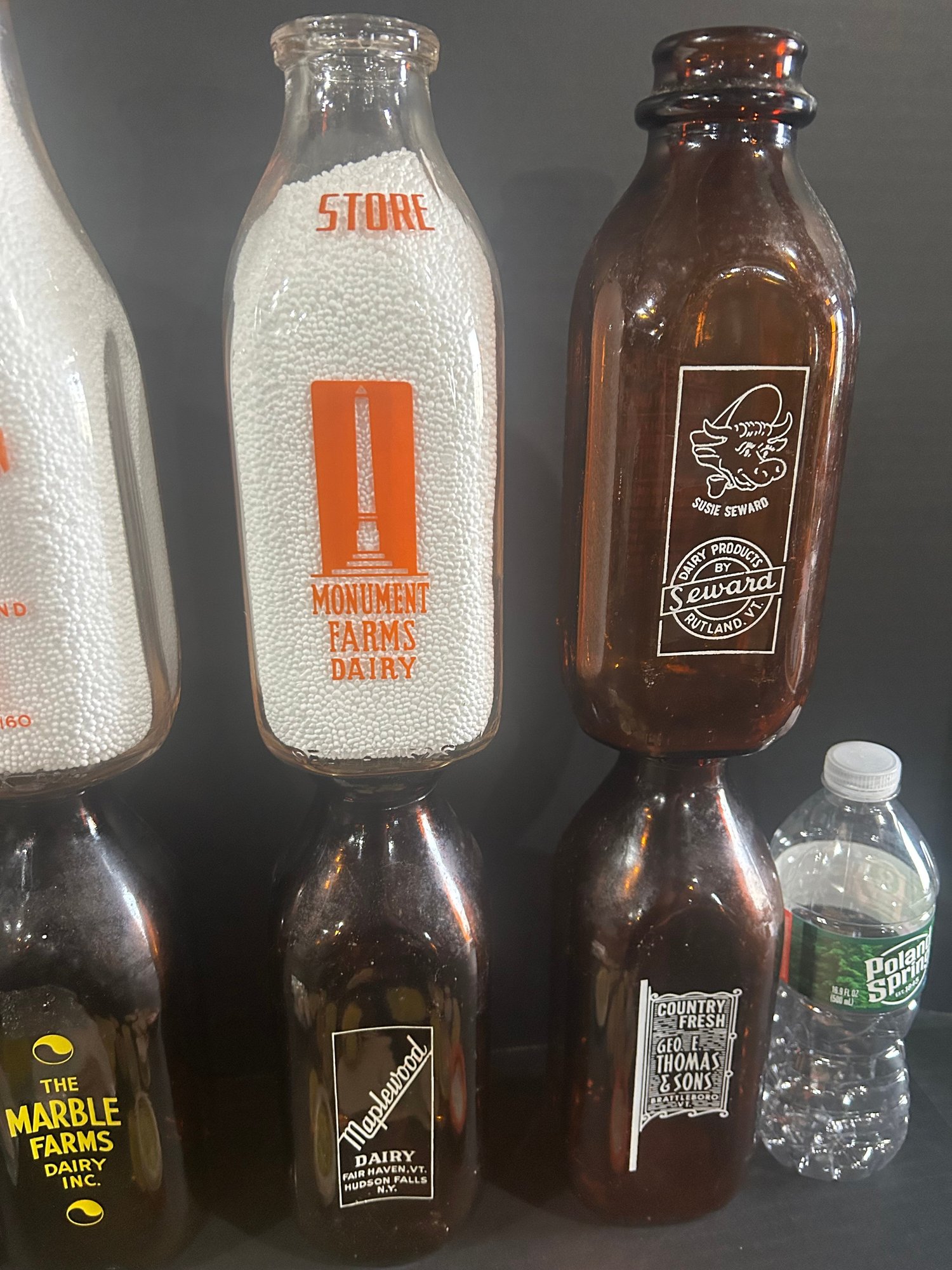 Bottles include amber colored proctor creamery, Seward dairy, Maplewood, Geo E. Thomas and sons Brattleboro, clear HE Johnson and Monument Farms