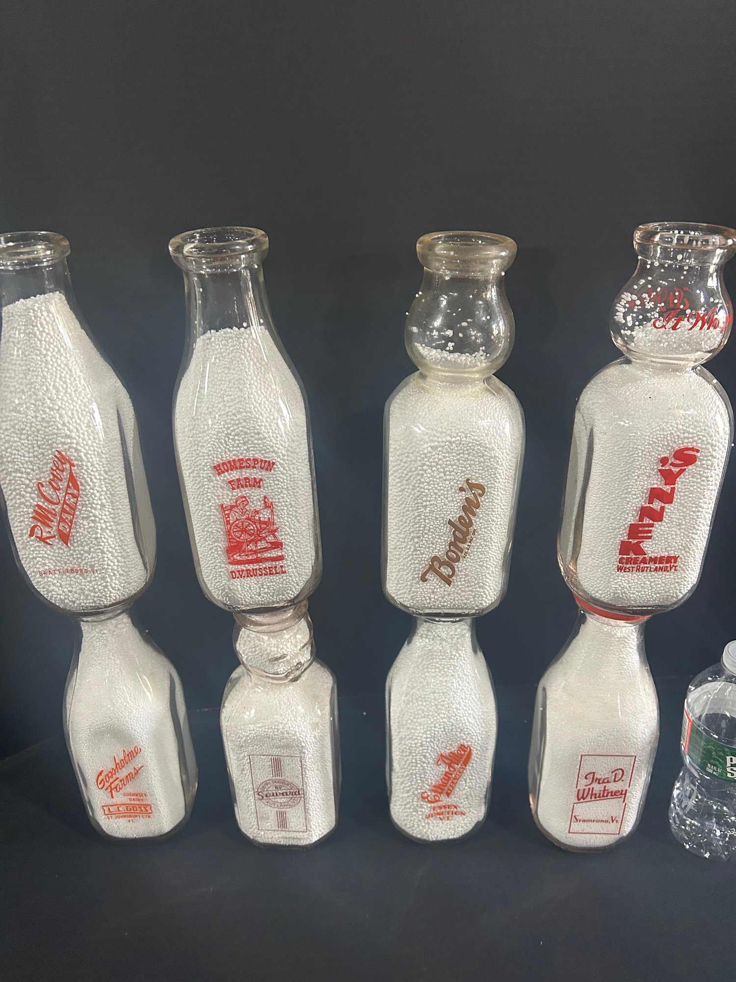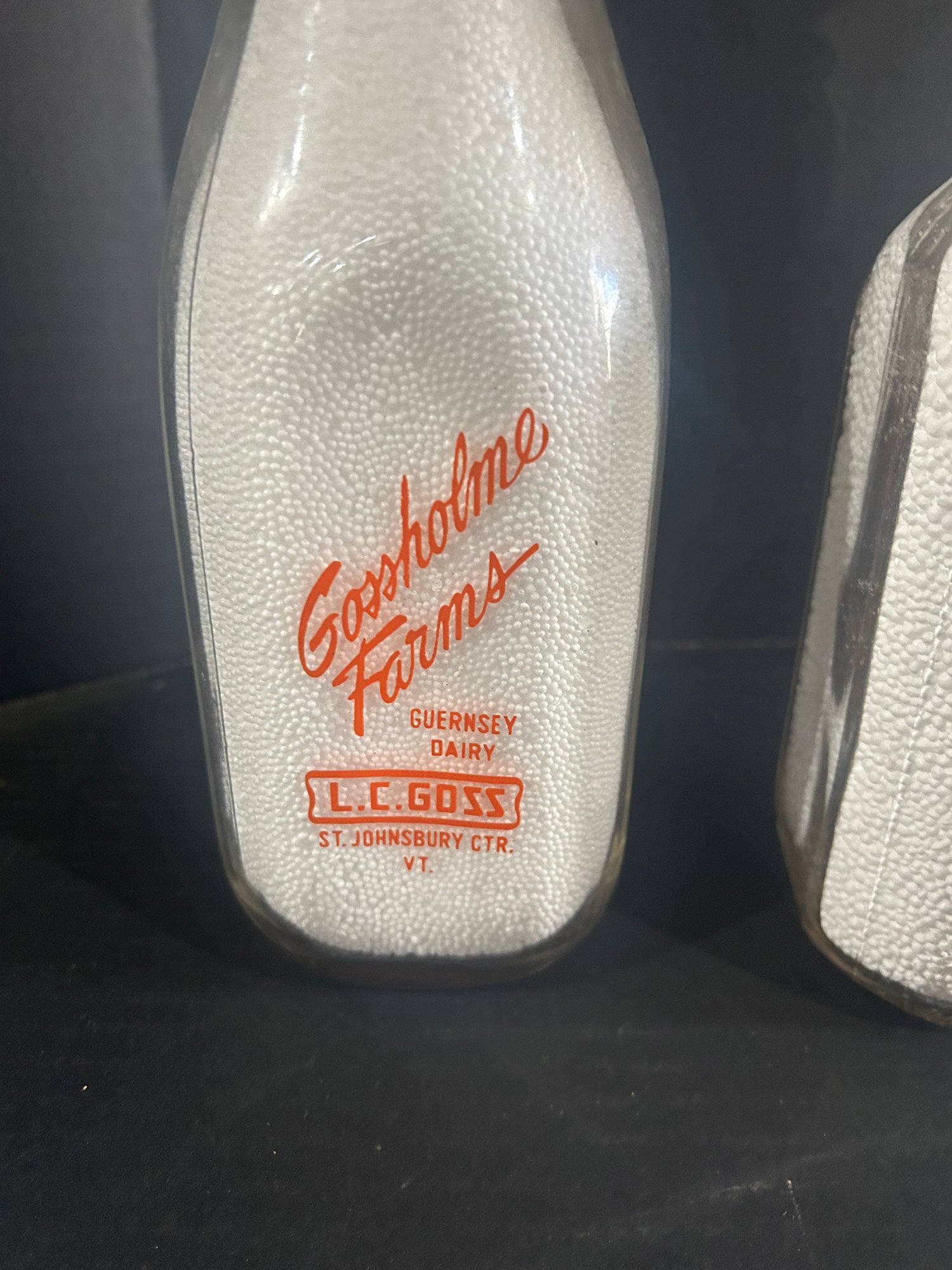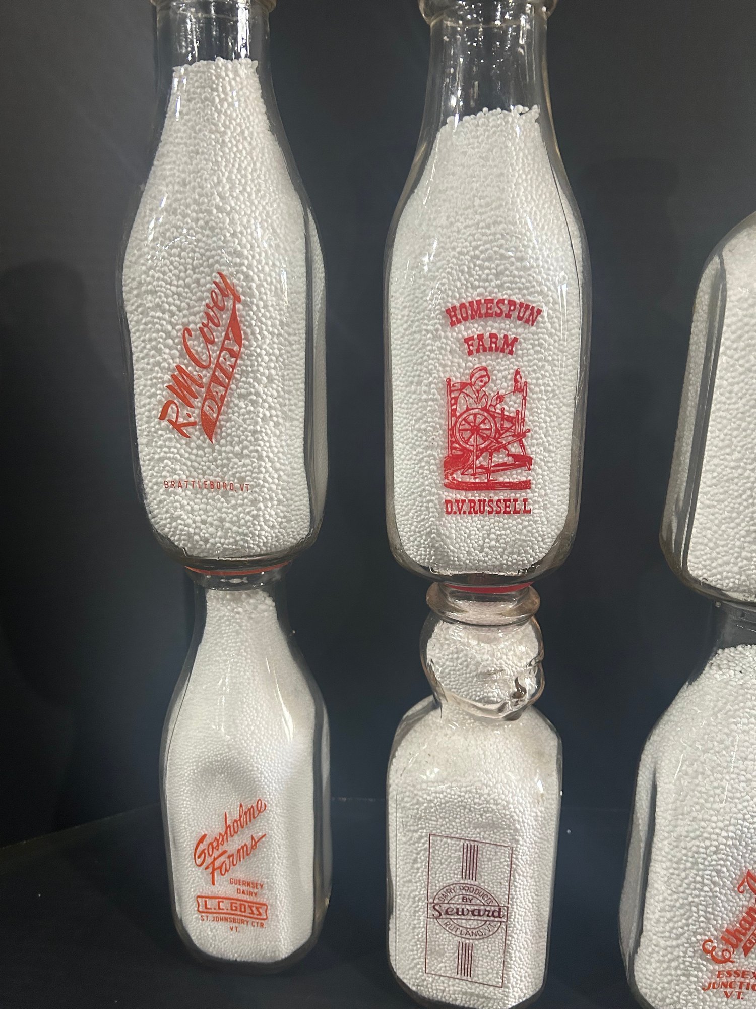 Bottles include: Gossholme Farms LC Goss Saint Johnsbury Center, RM Covey Brattleboro VT, Homespun Farm, Kenny’s Creamery West Rutland, Ira D Whitney Stamford VT