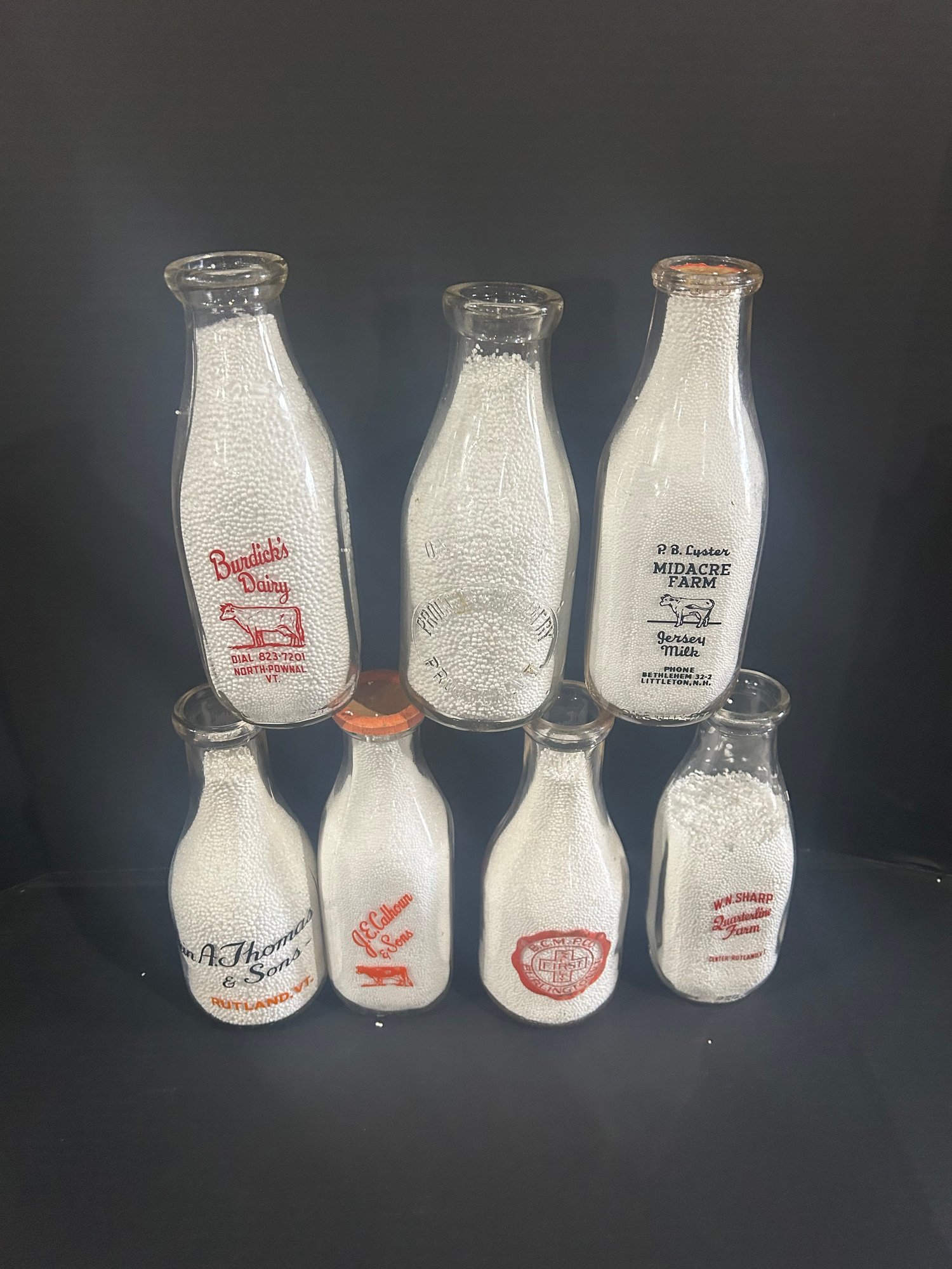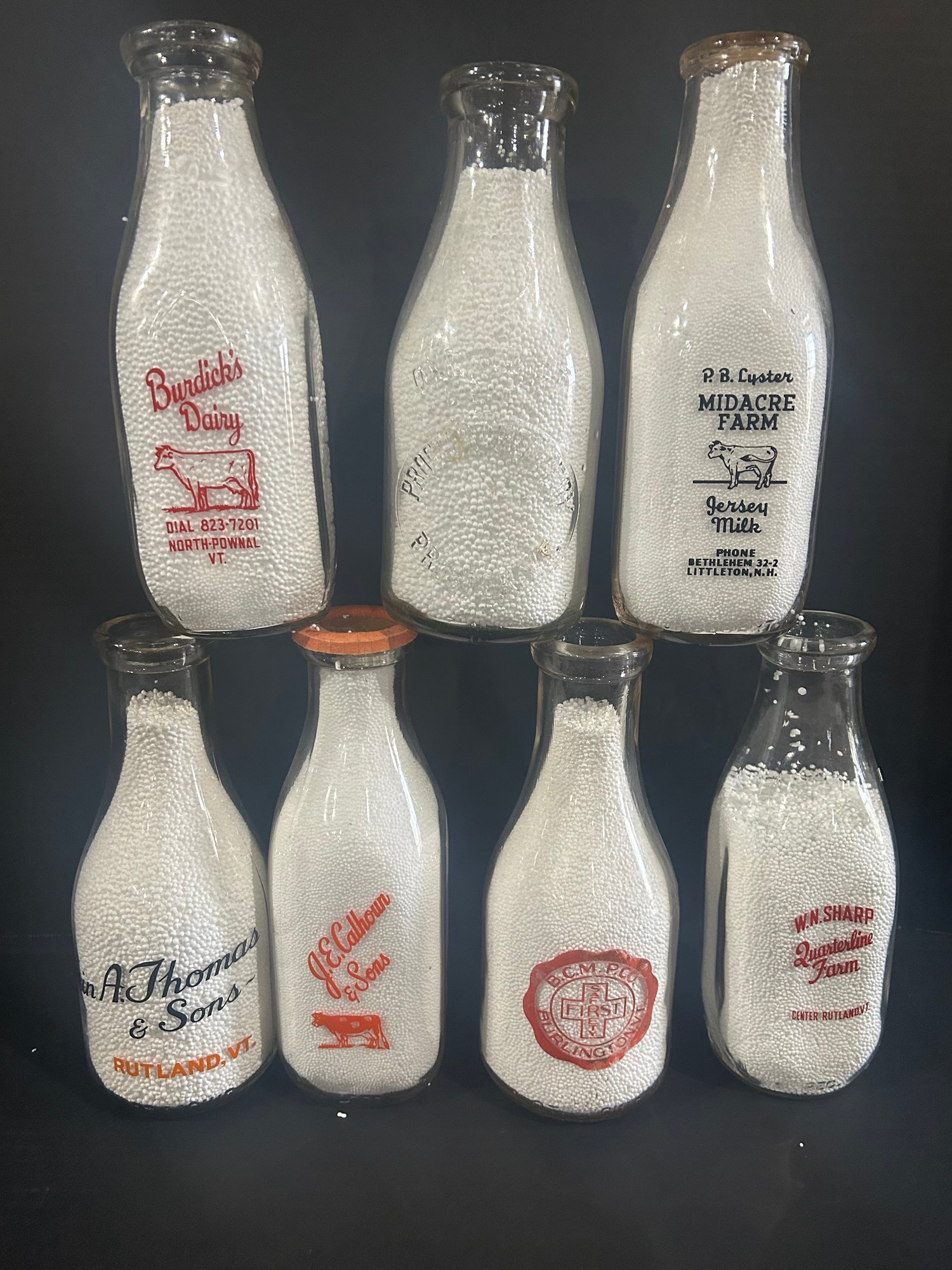 Bottles include: Burdicks Dairy N. Pownal VT, PB Lyster Midacre Farm Littleton NH, Burlington Coop, Orin Thomas & Sons Rutland VT, WN Sharp Quarterline Farm Center Rutland