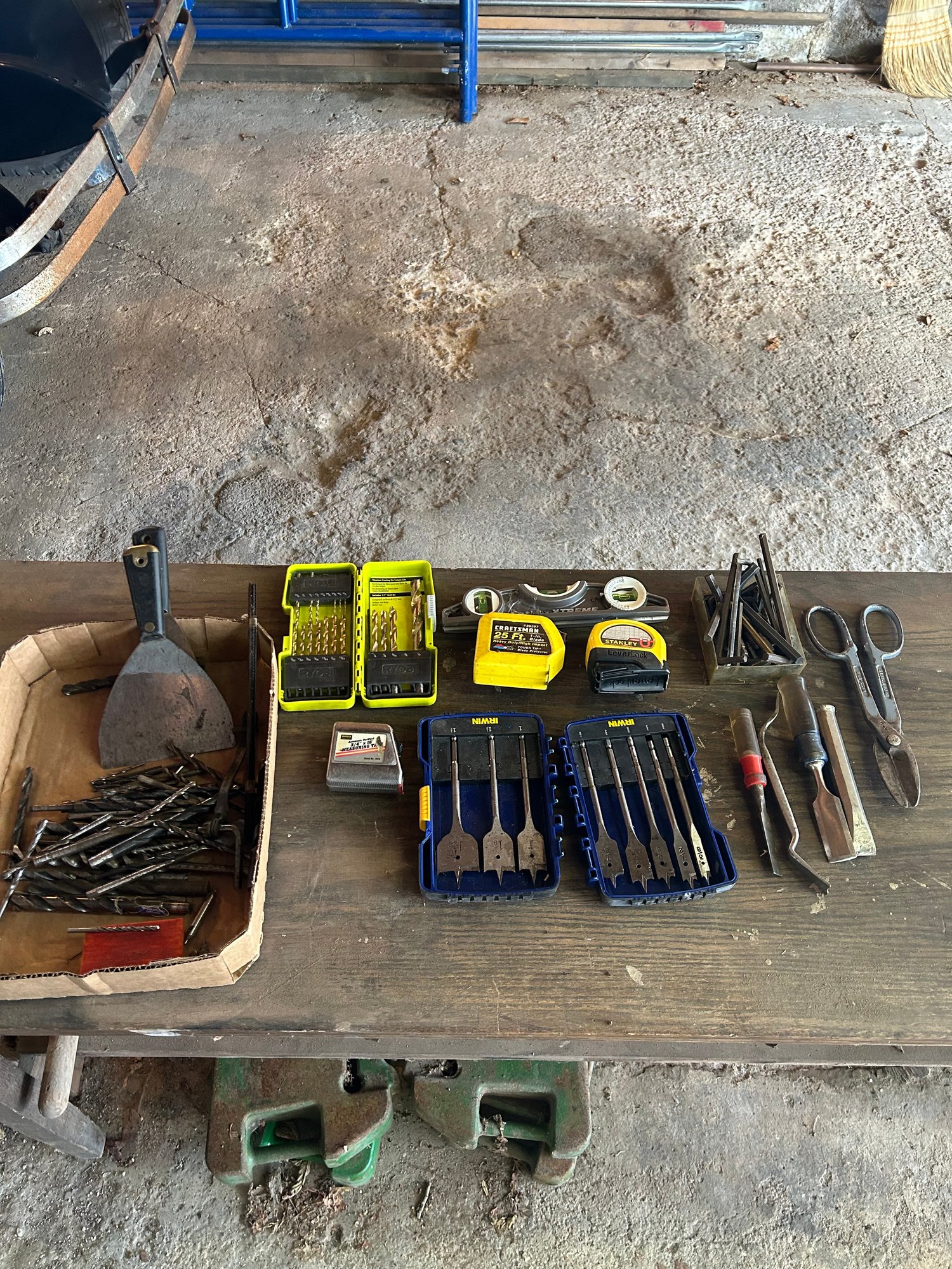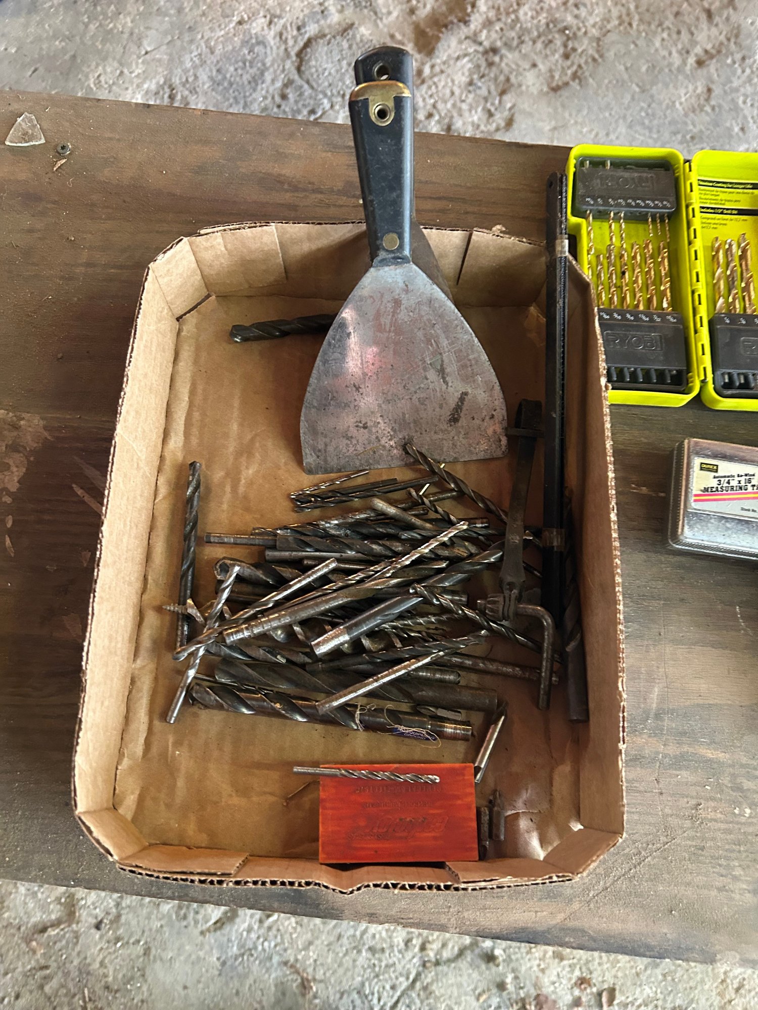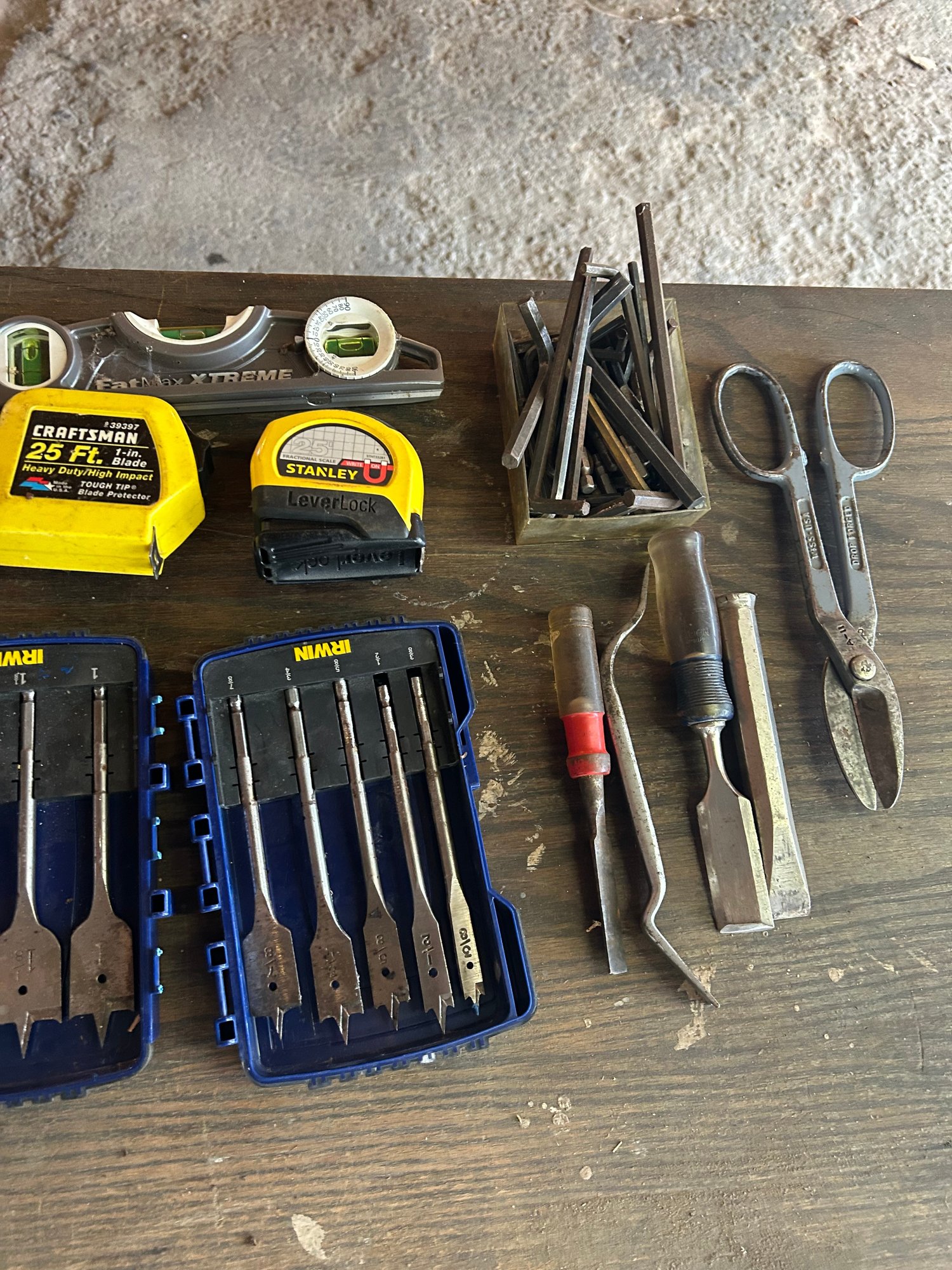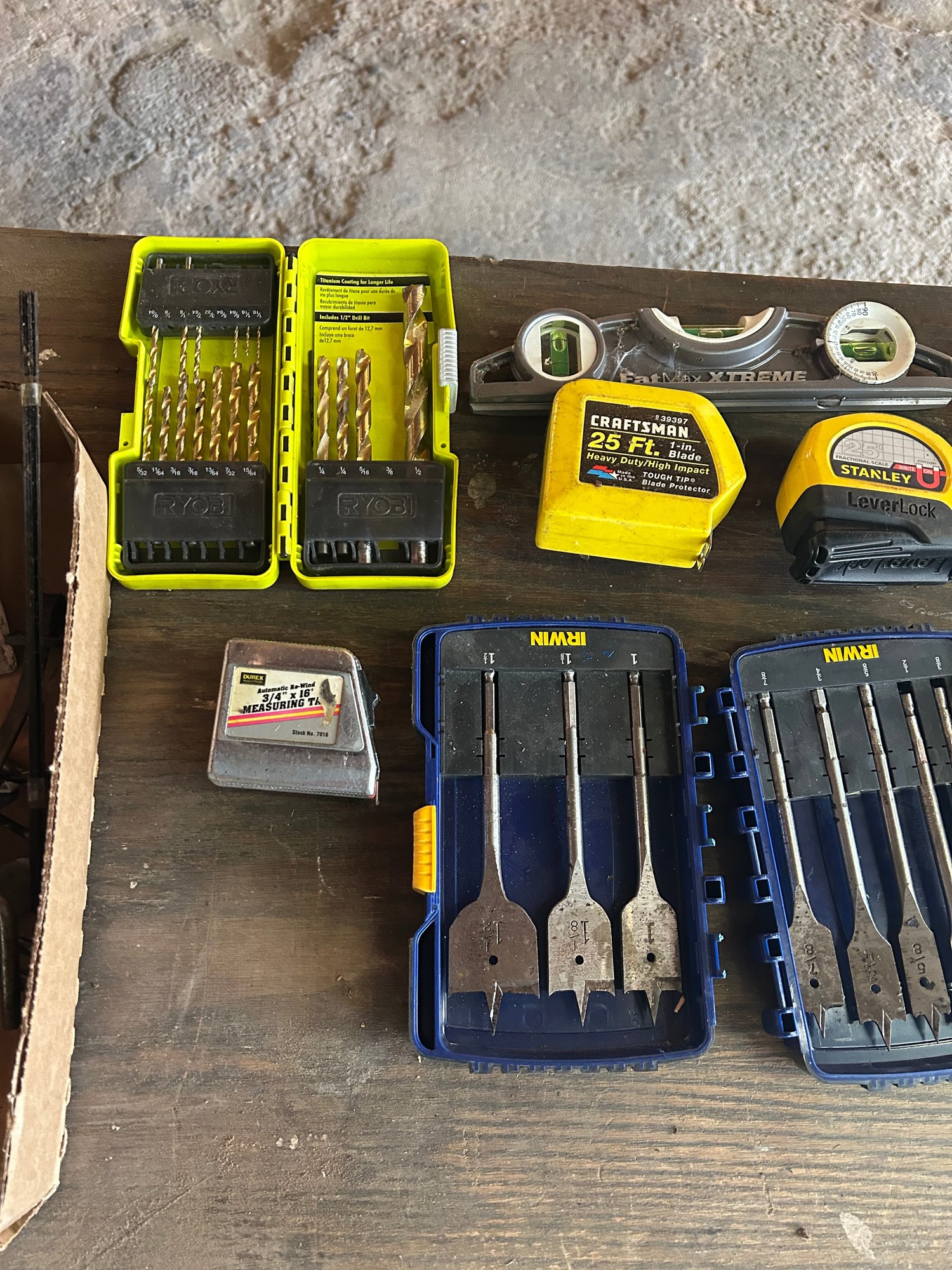 Lot 287- Tool Lot. Tape Measure, Drill Bits, Level And More