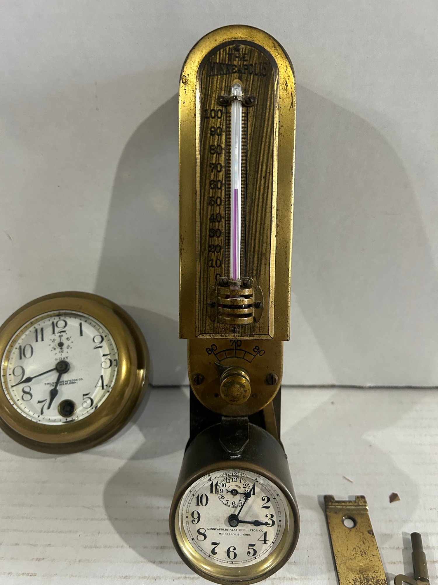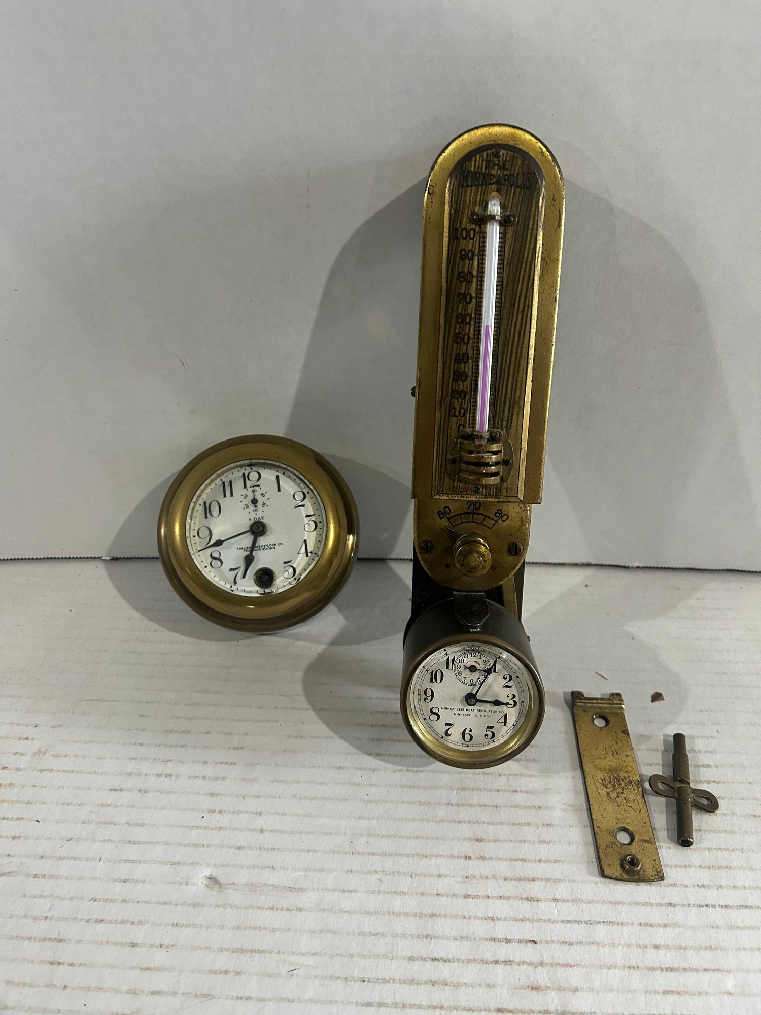 Lot 37-clock Thermometer Minneapolis And A Brass Clock From The New Haven Clock Co
