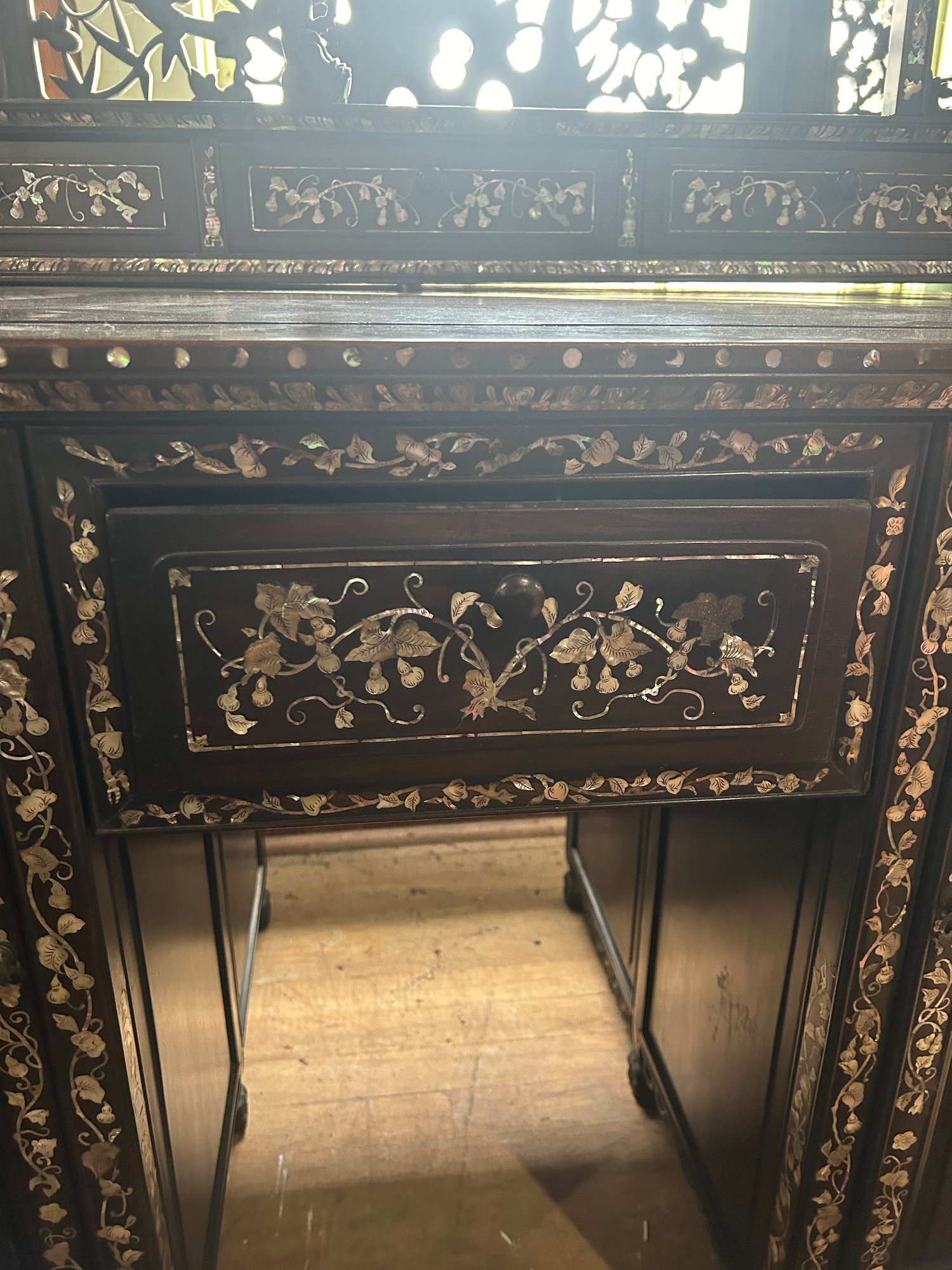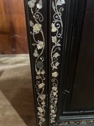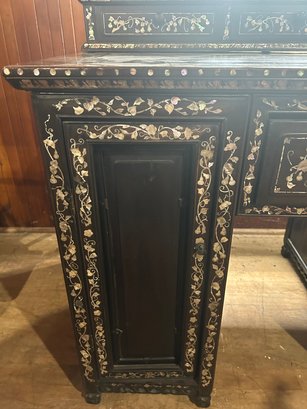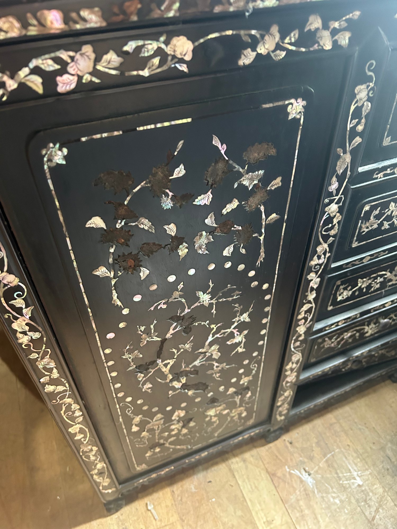 Some inlaid has fallen out. 40L, 26 1/2W, by 66H
