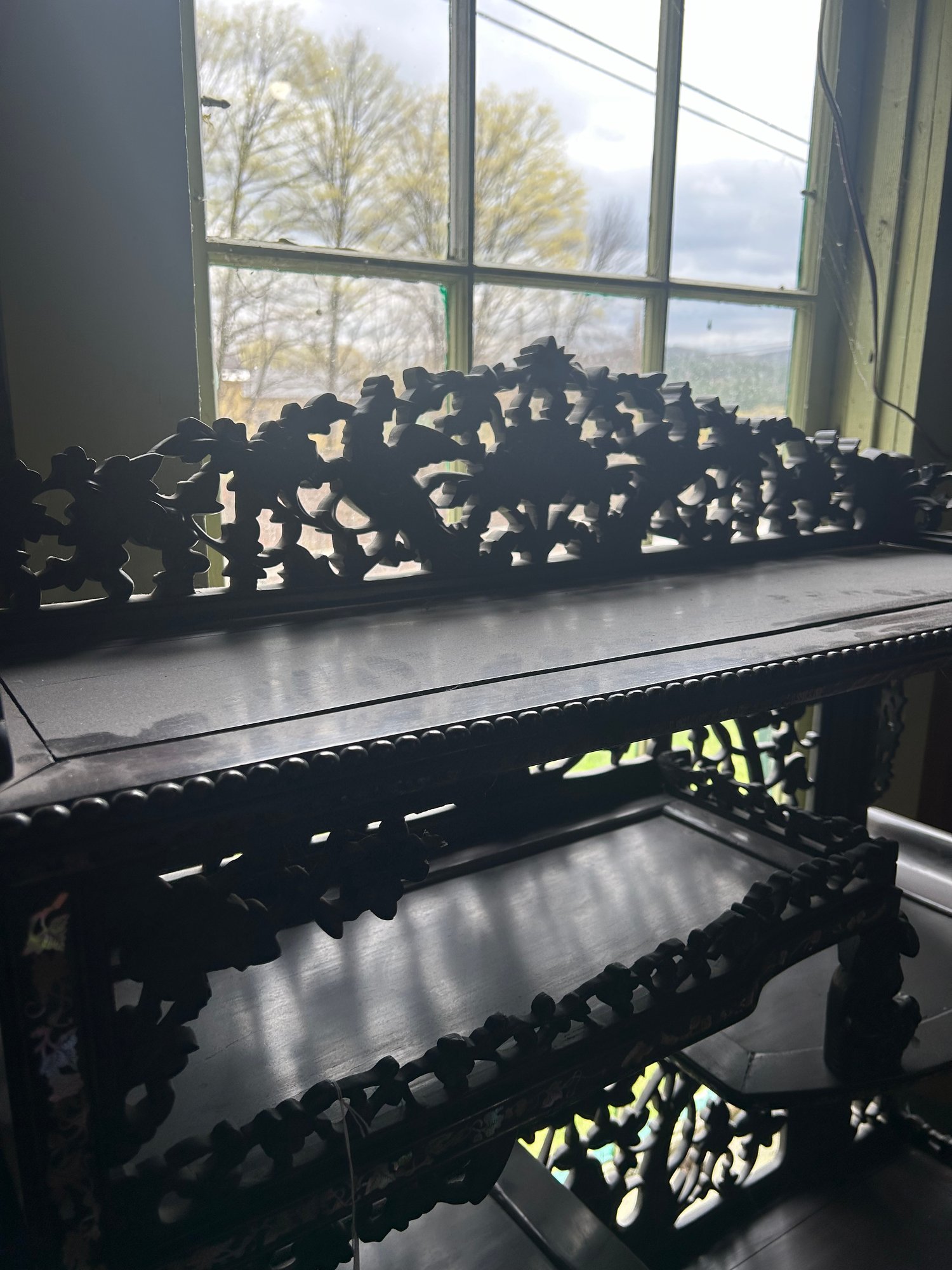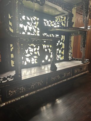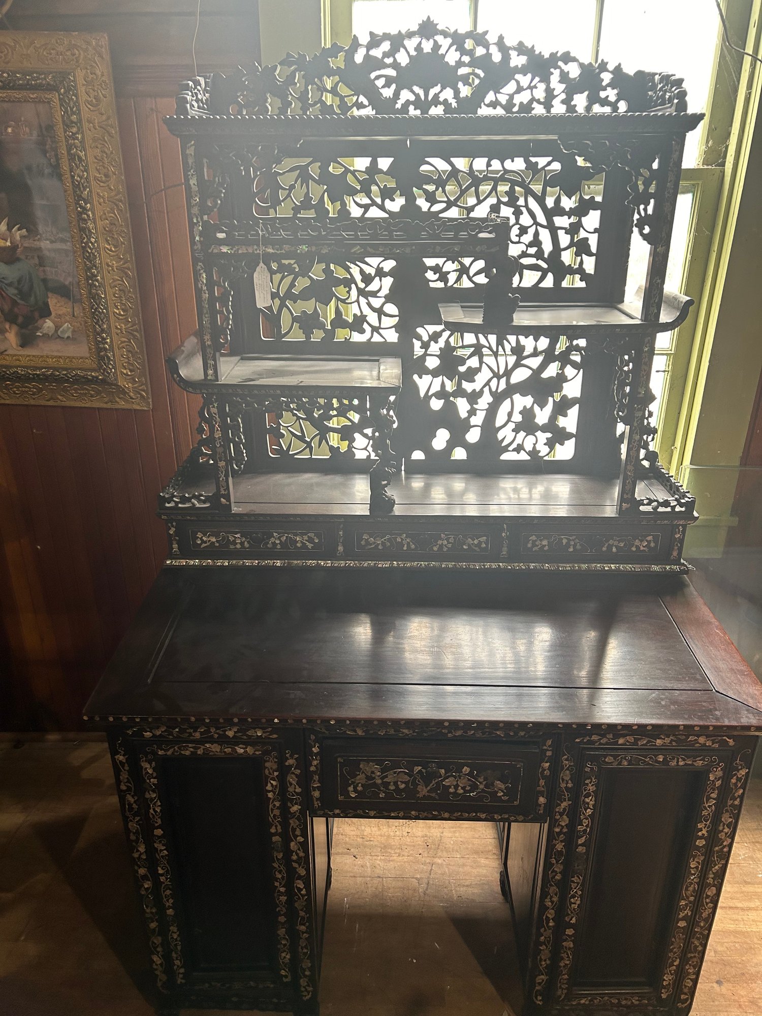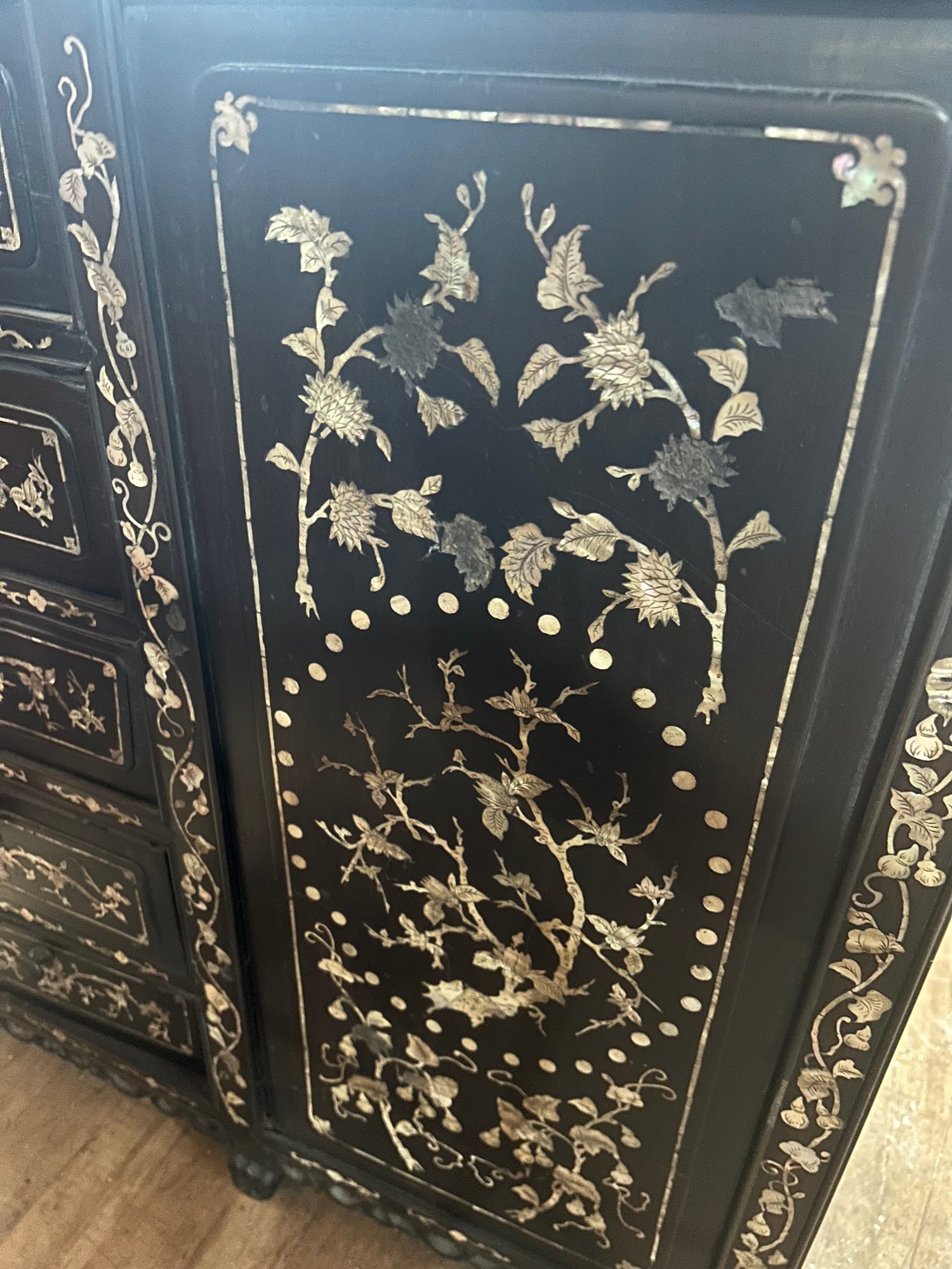 Some inlaid has fallen out. 40L, 26 1/2W, by 66H