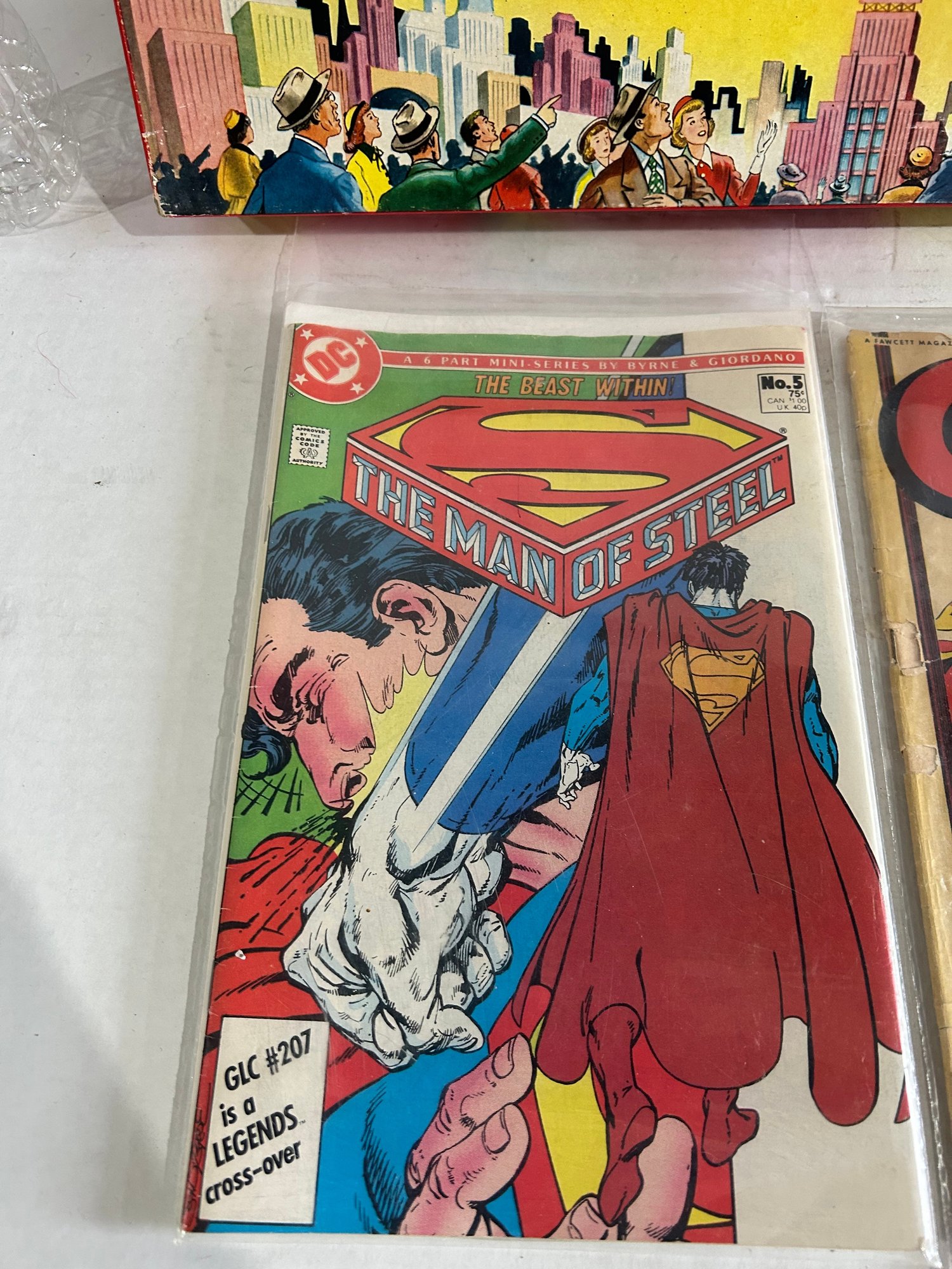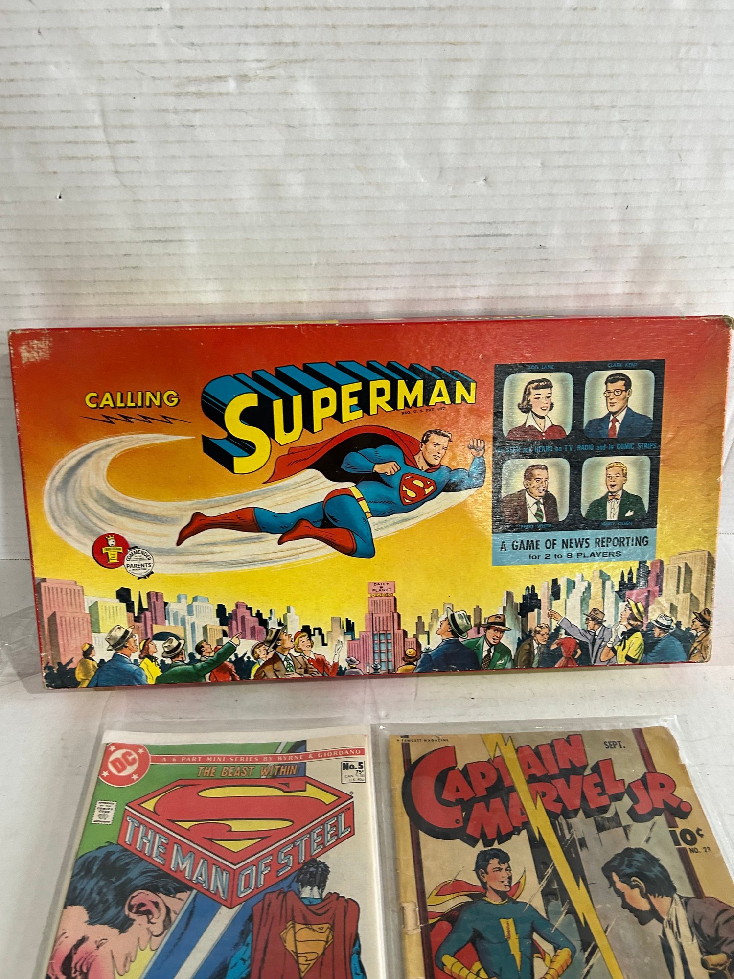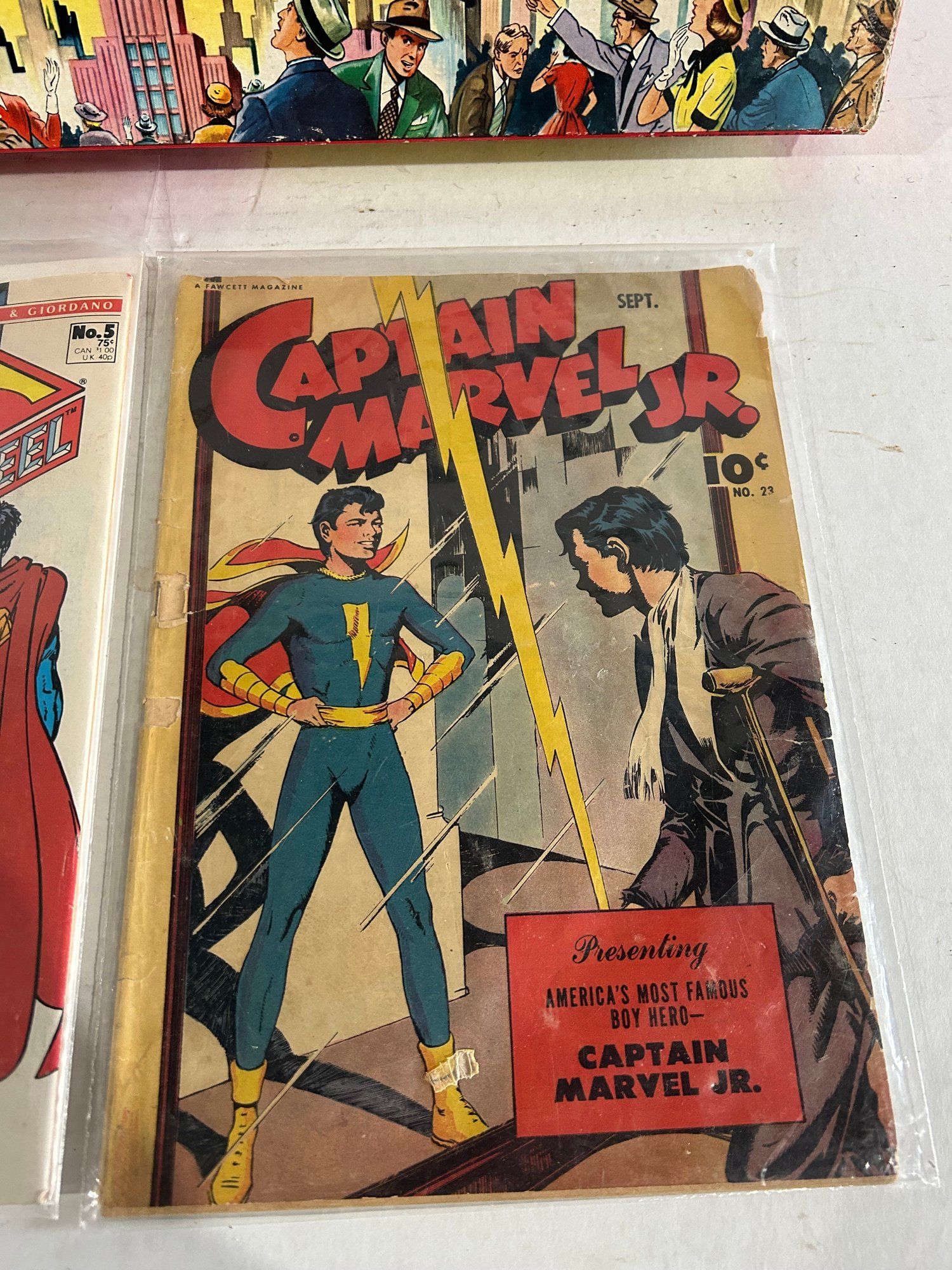Comics are DC Man of Steel Superman Comic and Captain Marvel Jr. 10 Cent Comic. All one lot!
