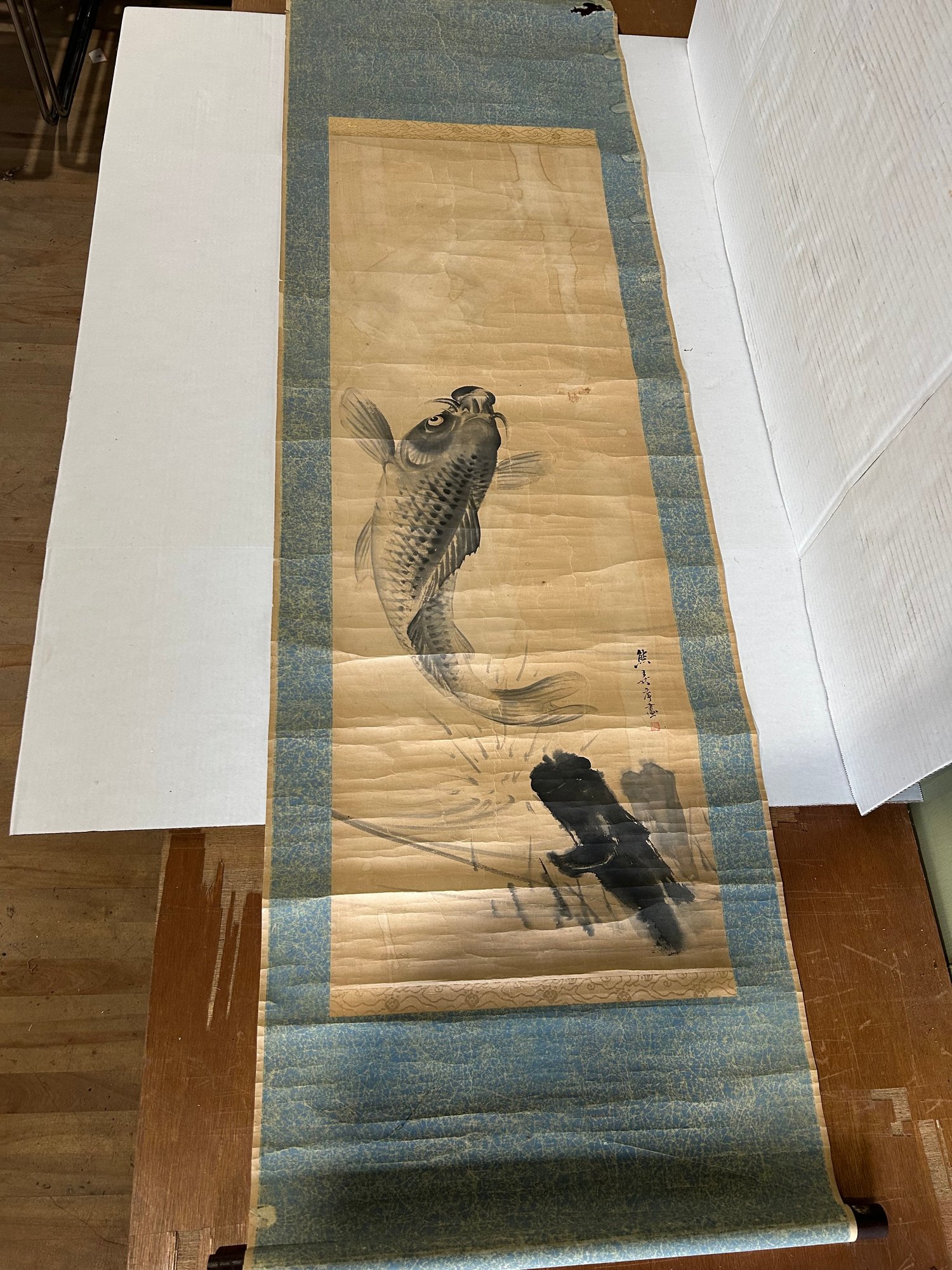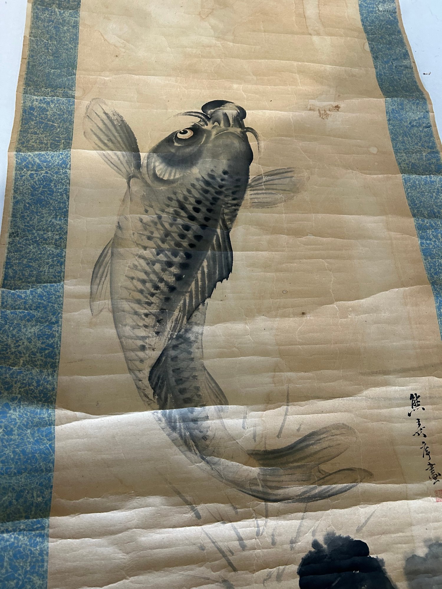 Lot 81- 19th Century Painted Chinese Koi Fish Scroll. 69x20. See Pictures For Condition