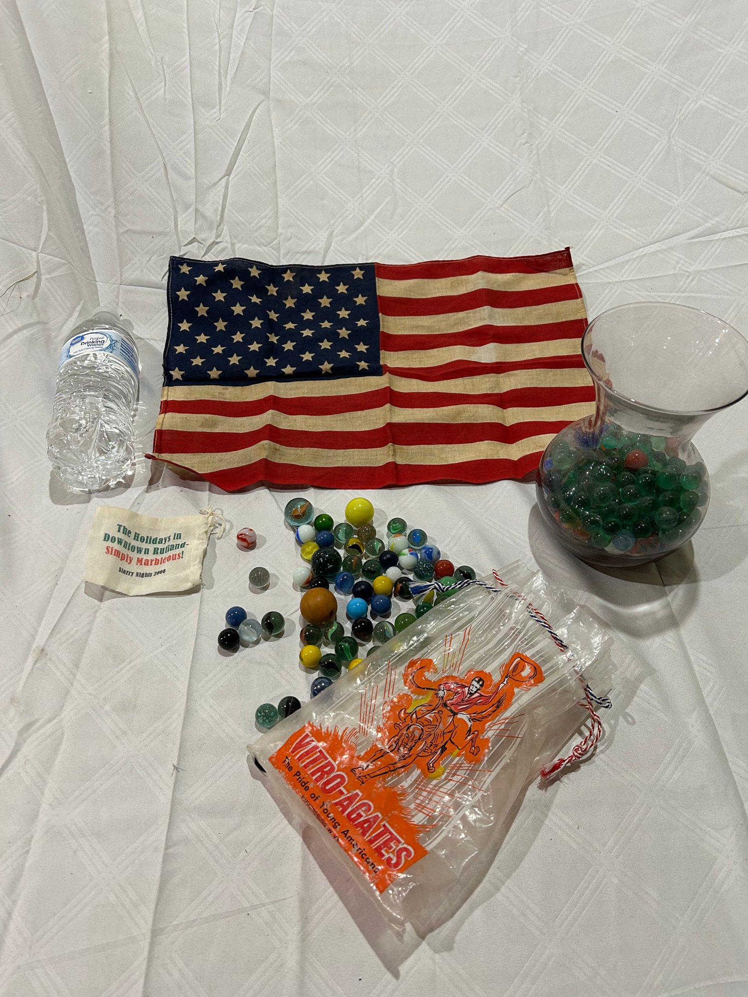 Lot Of Marbles With Vitro-Agates Marble Bag Ans Small American Flag