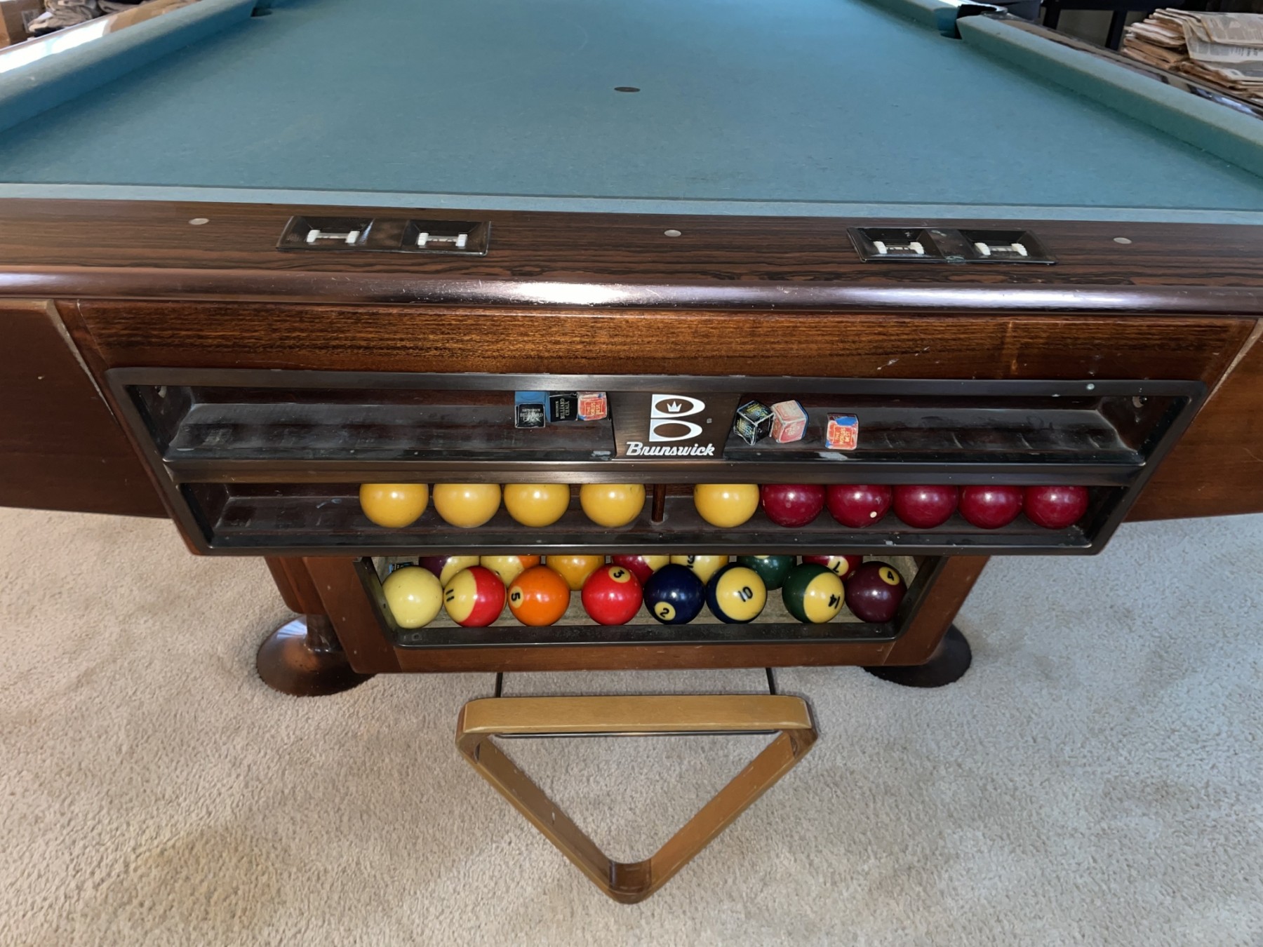 This Brunswick pool table dates back to the 1980s and was very well-maintained. Considered by many professional players the best table ever made ! This table is model AK Gold Crown III. This was Brunswick’s top-of-the-line used for tournaments and retailed for $12,000. The overall dimensions are 114“ x 63“. This will require knowledgeable disassembly and removal from second floor. The house is sold! The table must be removed no later than December 9th. Winning bidder must provide their own labor. We will be conducting an on-site estate sale at the location on December 3rd & 4th.