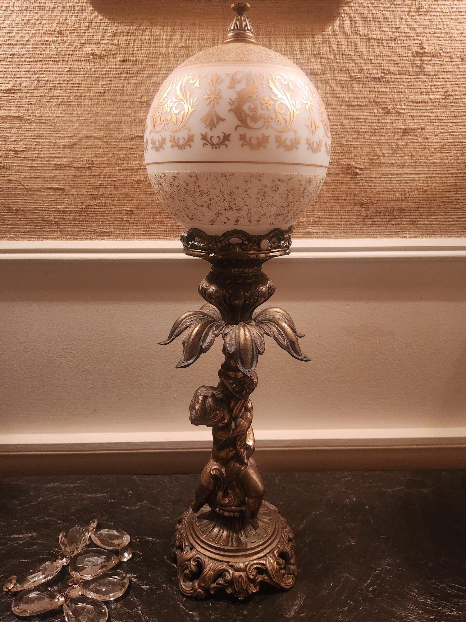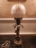 Figural cherub rable lamp with ornately gold decorated ball shade