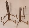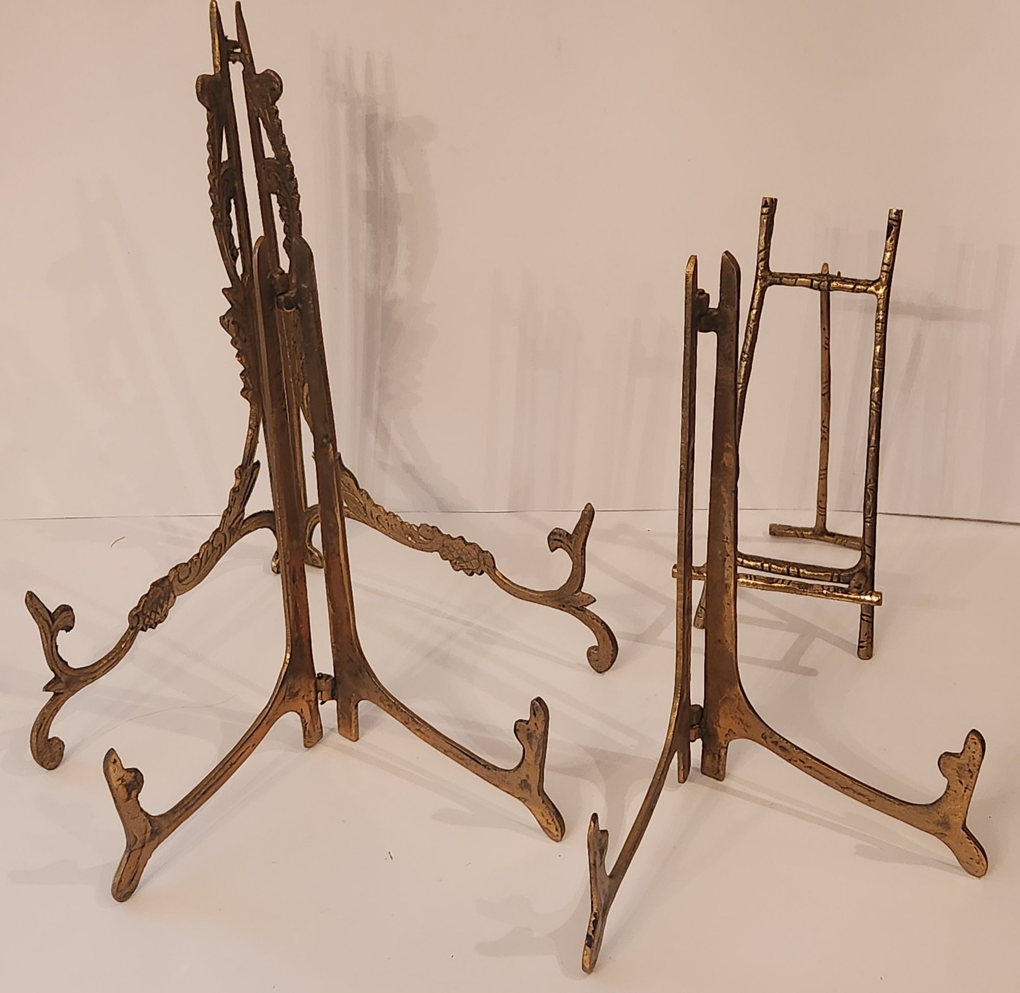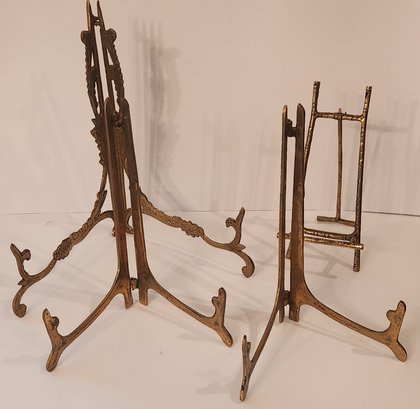 Three solid brass plate stands and a brass easel