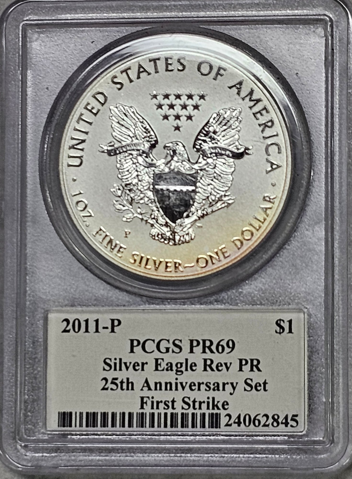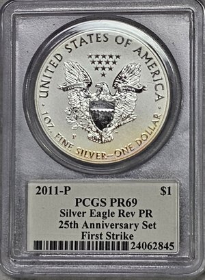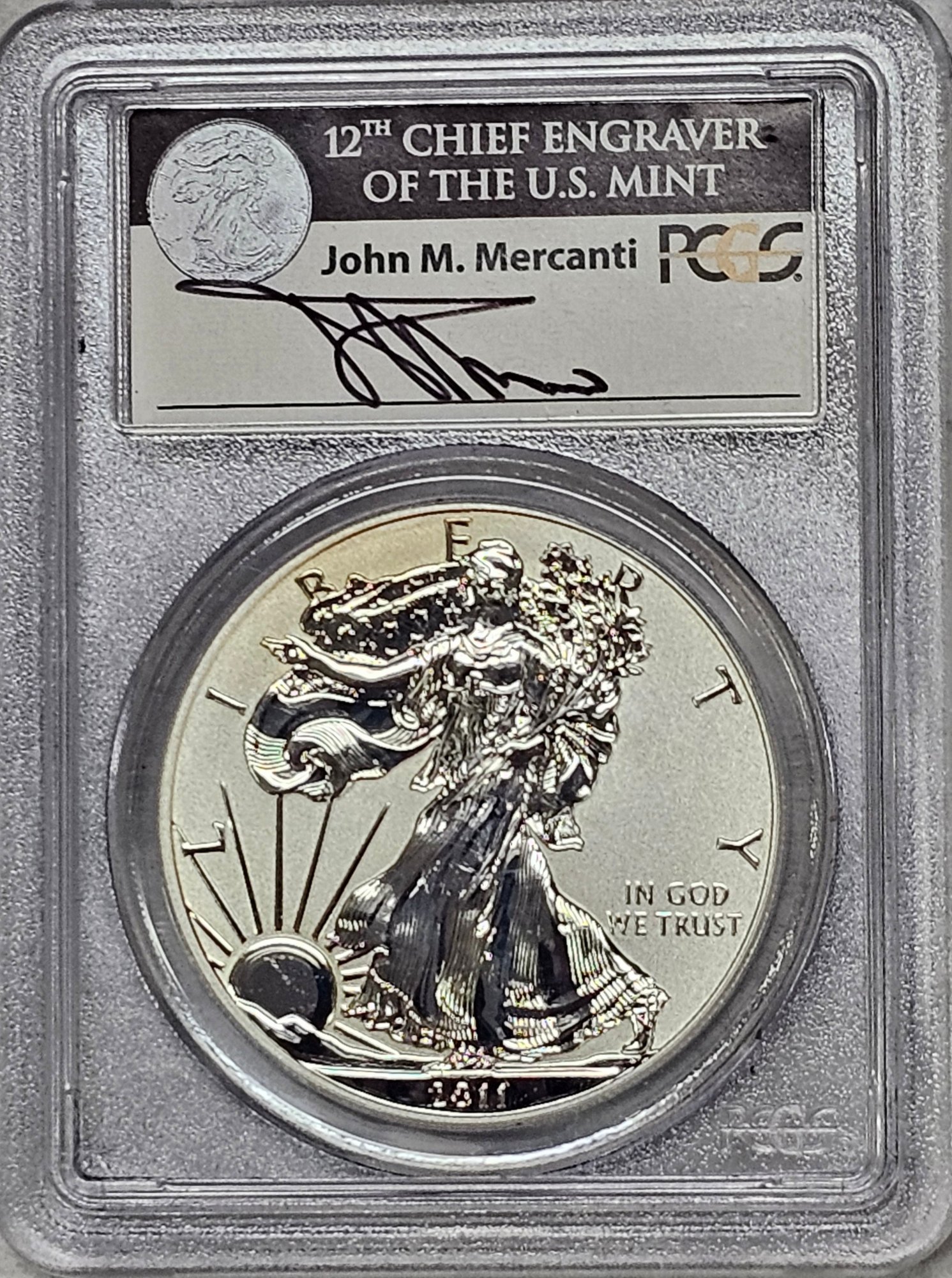 PCGS PR69 REV PR First Strike Silver Eagle $1, One Oz. 2011-P, John Mercanti Signed
