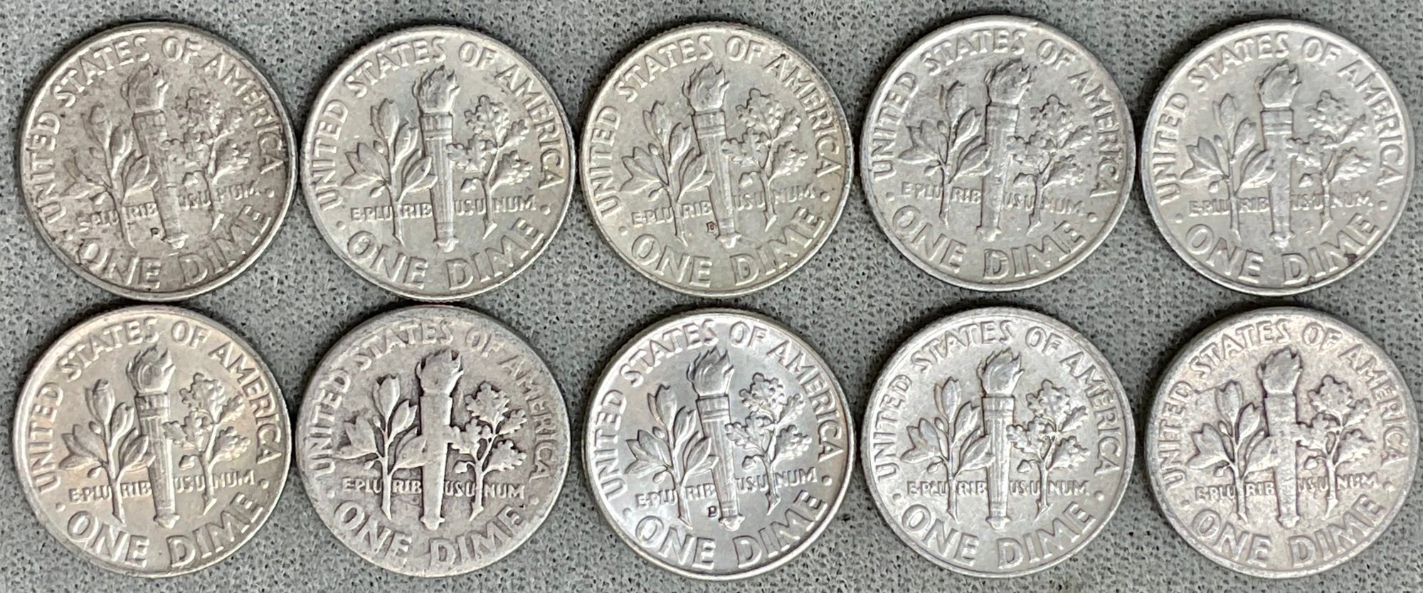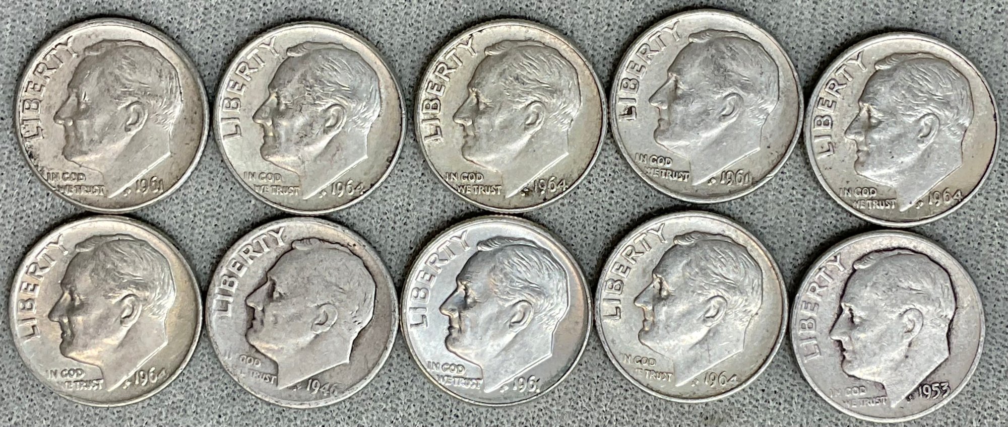 #1 - 10pc Silver Roosevelt Dimes - assorted dates - good used condition