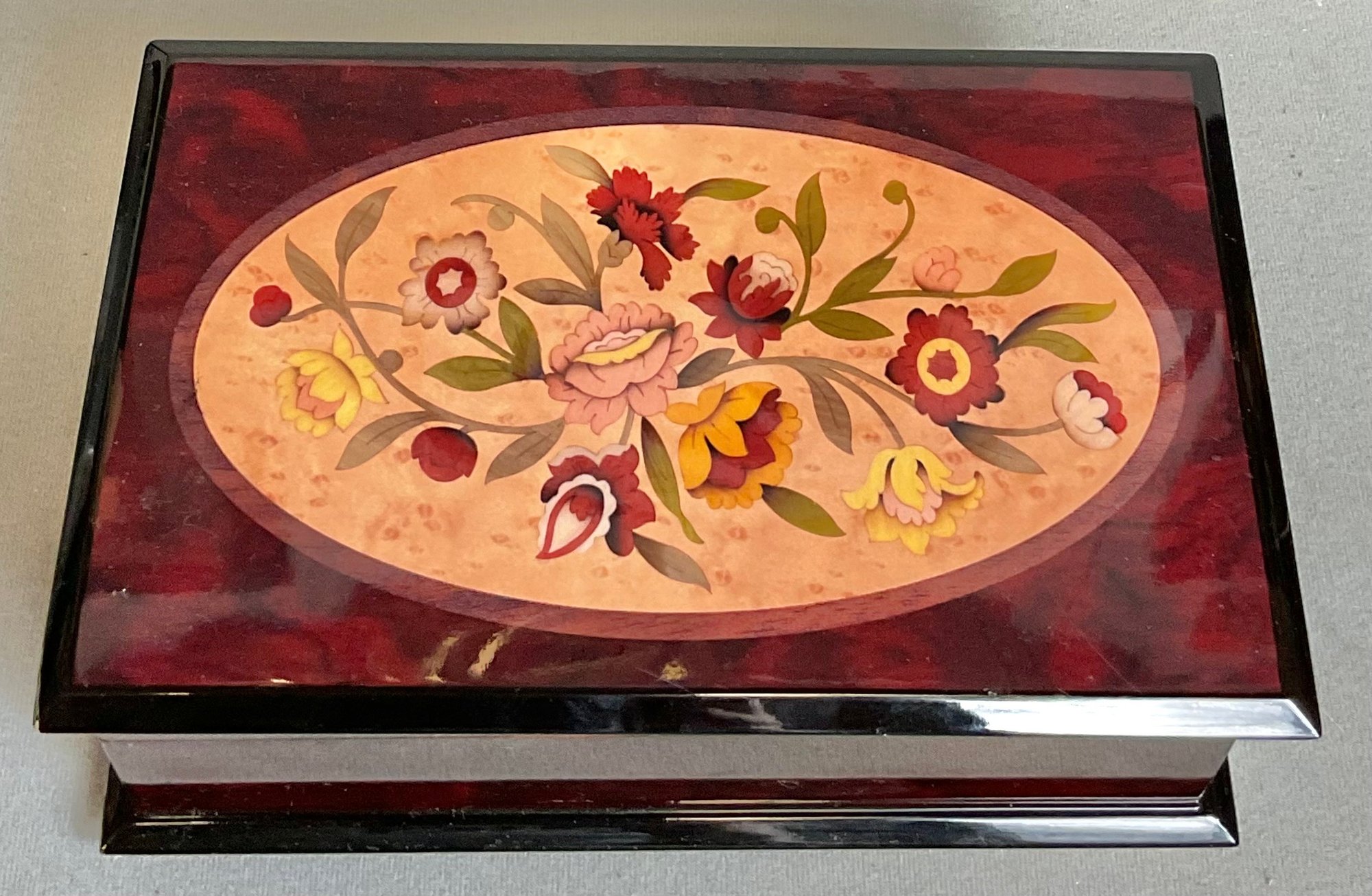 #1 - San Francisco Music Box - works - made China - plays Fantasie Impromptu - 3.5” tall x 9.5” long x 6” wide - good used condition
