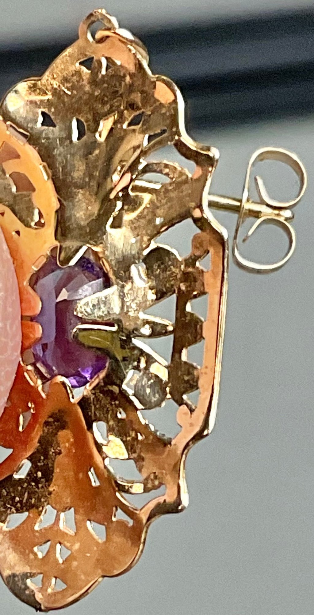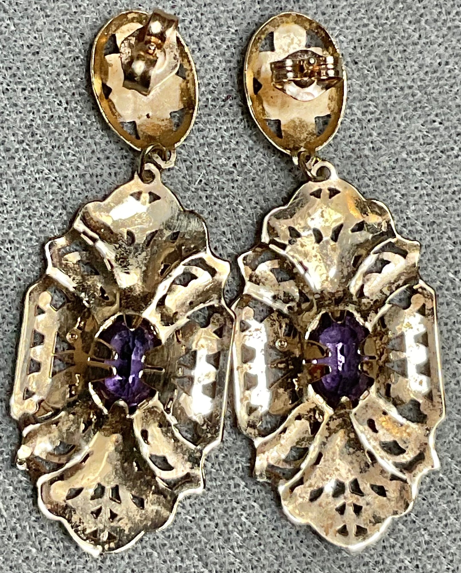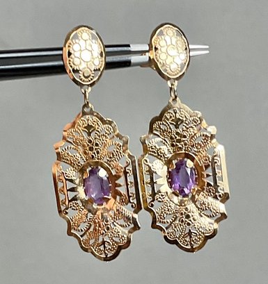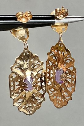 14k Amethyst Dangle Earrings - 1 5/8” x 5/8” - 1.7 grams - good used condition