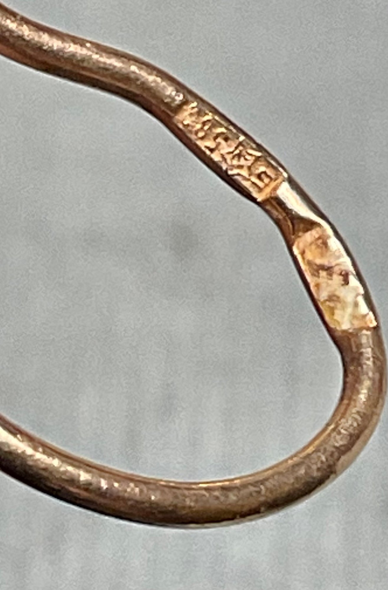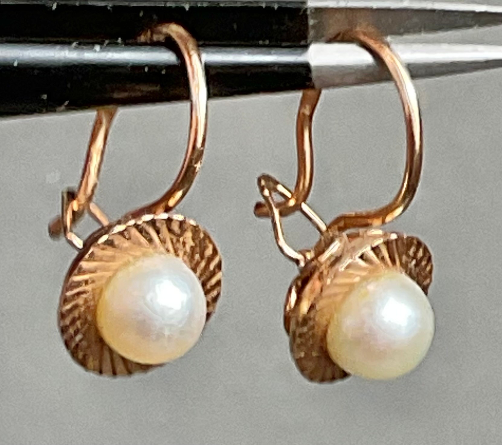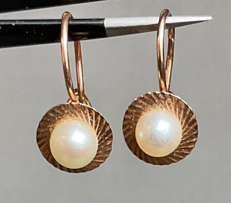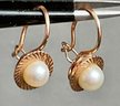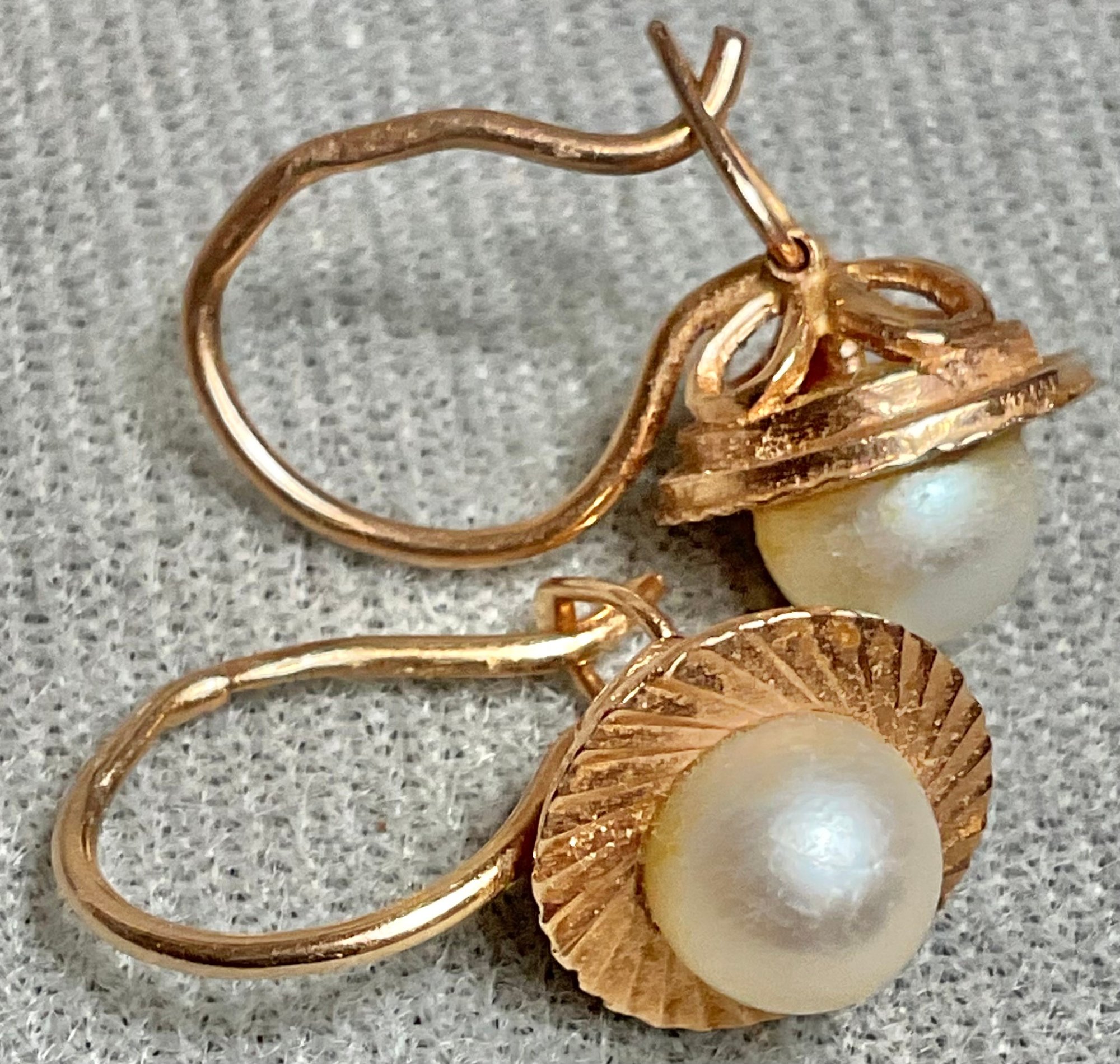 14k Gold Pearl Drop Earrings - pearl 6.6mm - weighs 4 grams - good used condition