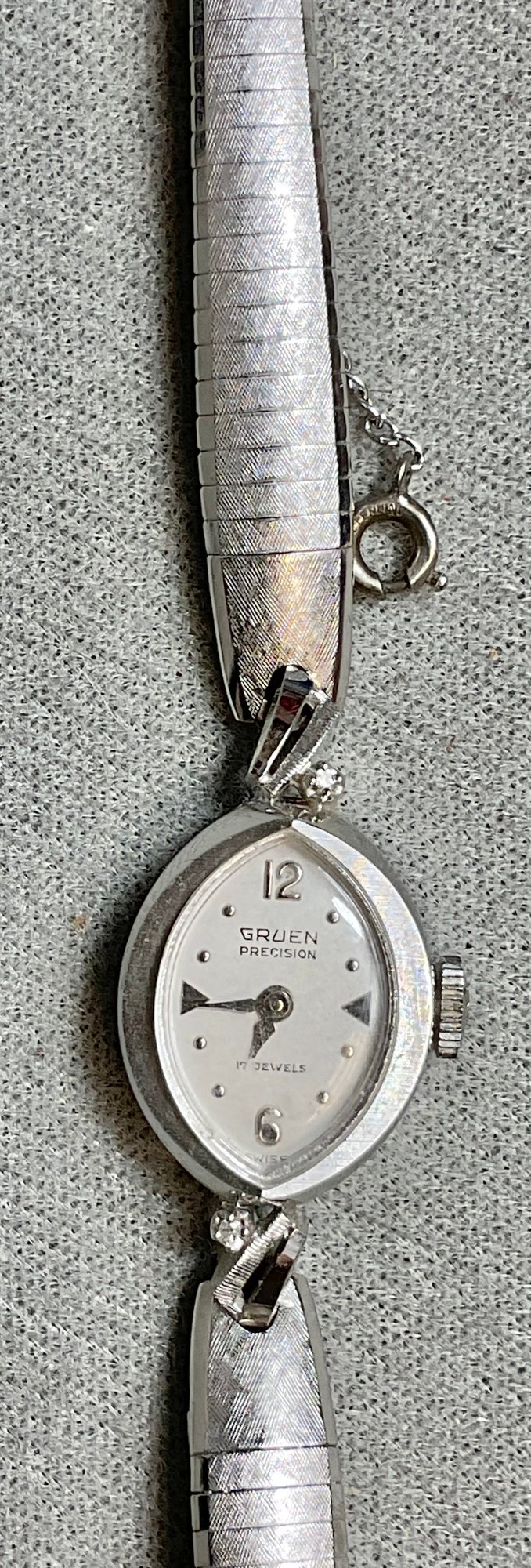 14k White Gold Ladies Gruen Precision Watch - 17 jewel - case solid 14k - band gold filled - works - 6” - good used condition