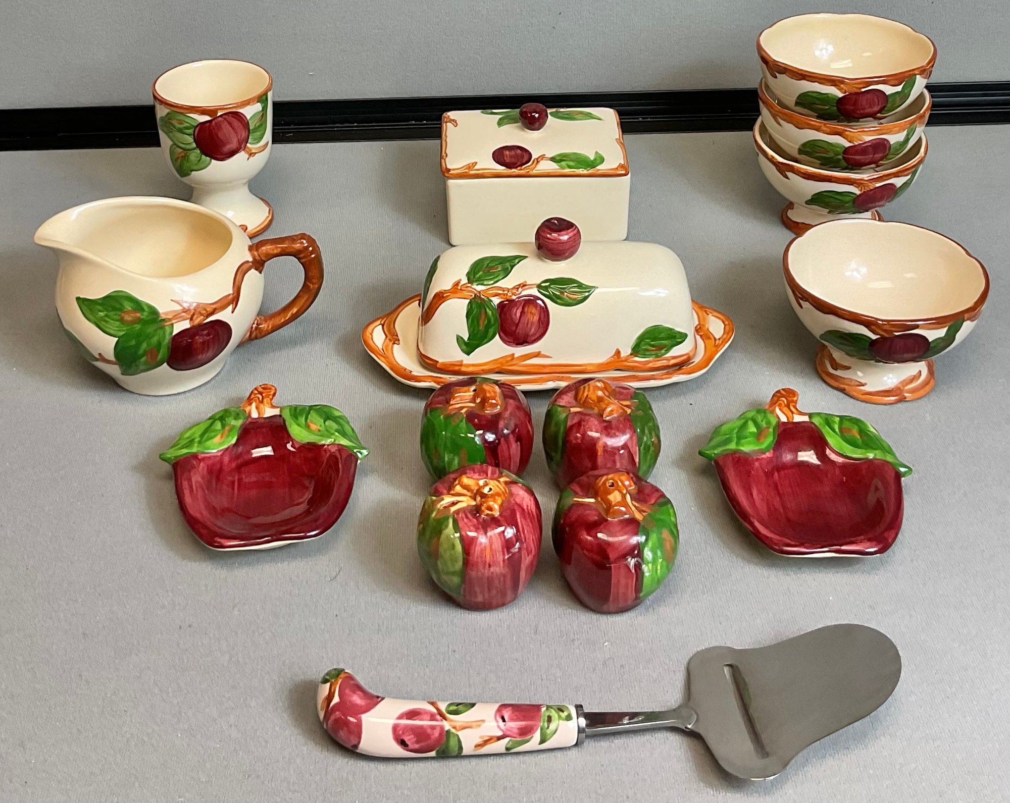 16pc Franciscan Apple - S & P/ Sherbet/ Misc. - 4pc sherbet 2.5” tall x 4” round - covered butter dish 3.5” tall x 7 5/8” long x 3 5/8” wide - cigarette box 3.25” tall x 4 3/8” long x 3.25” wide - egg cup 3.75” tall x 2 5/8” round - creamer 3.25” tall x 5.5” long x 4” wide - 2pc spoon rests 4.25” long x 3.75” wide - 2 sets salt & pepper shakers 2” tall - cheese slicer 8.75” long - no chips - good used condition