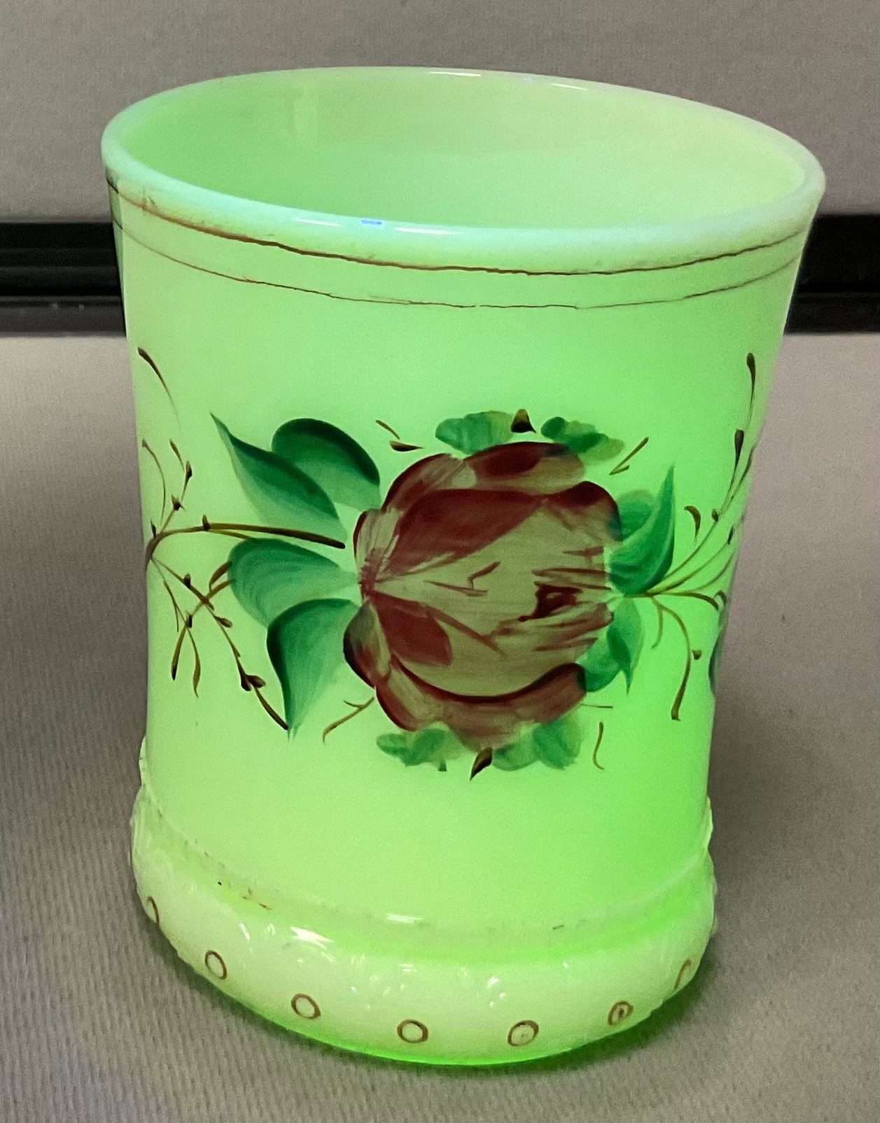 1903 Heisey Uranium Custard Glass Souvenir Cup - beautiful glow - no chips - 4” tall x 3” wide - good used condition