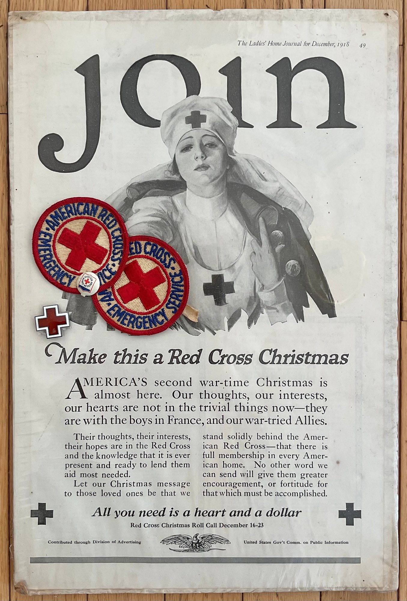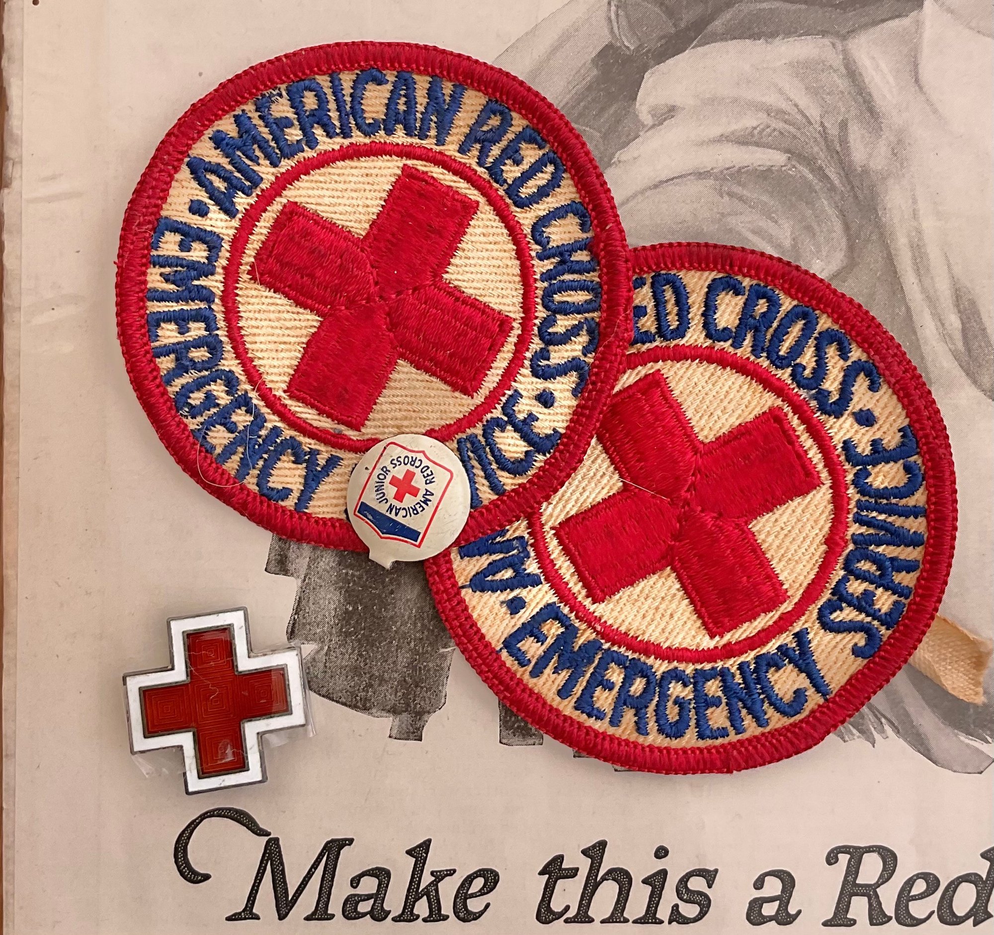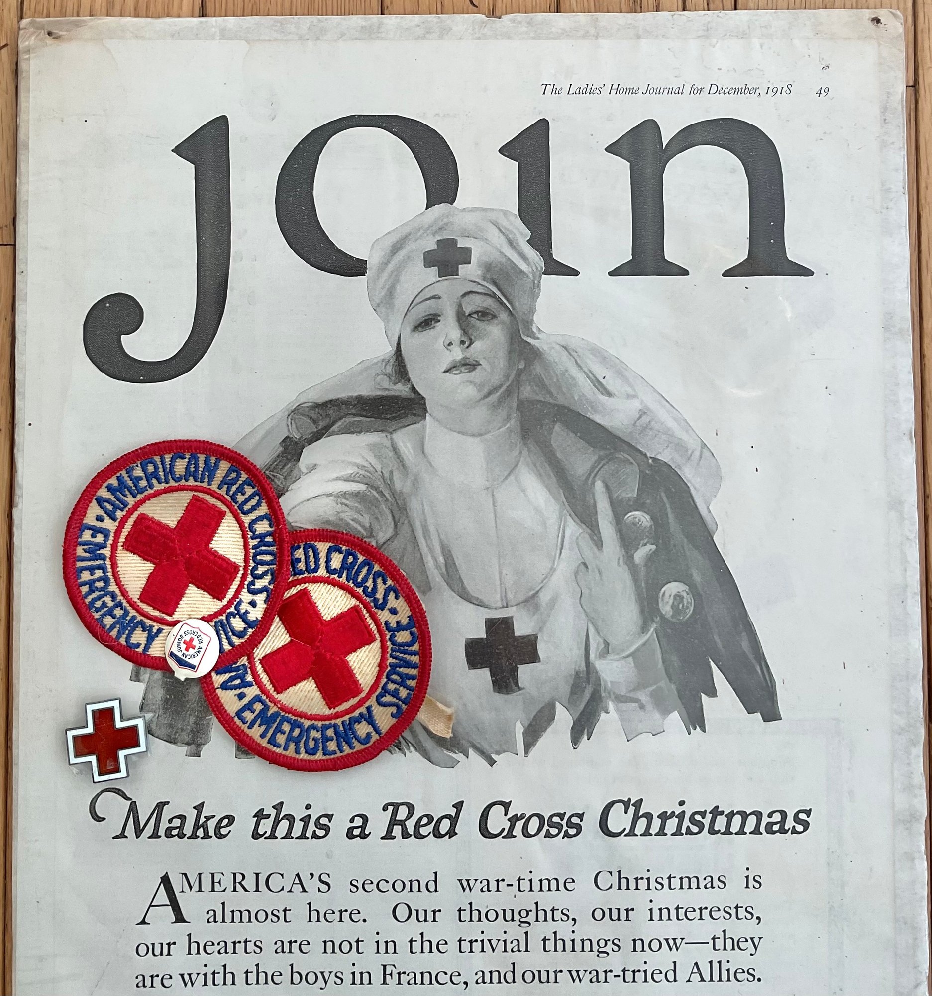 1918 Red Cross Ad & Patches/ Pin - ad from Ladies Home Journal - good used condition.