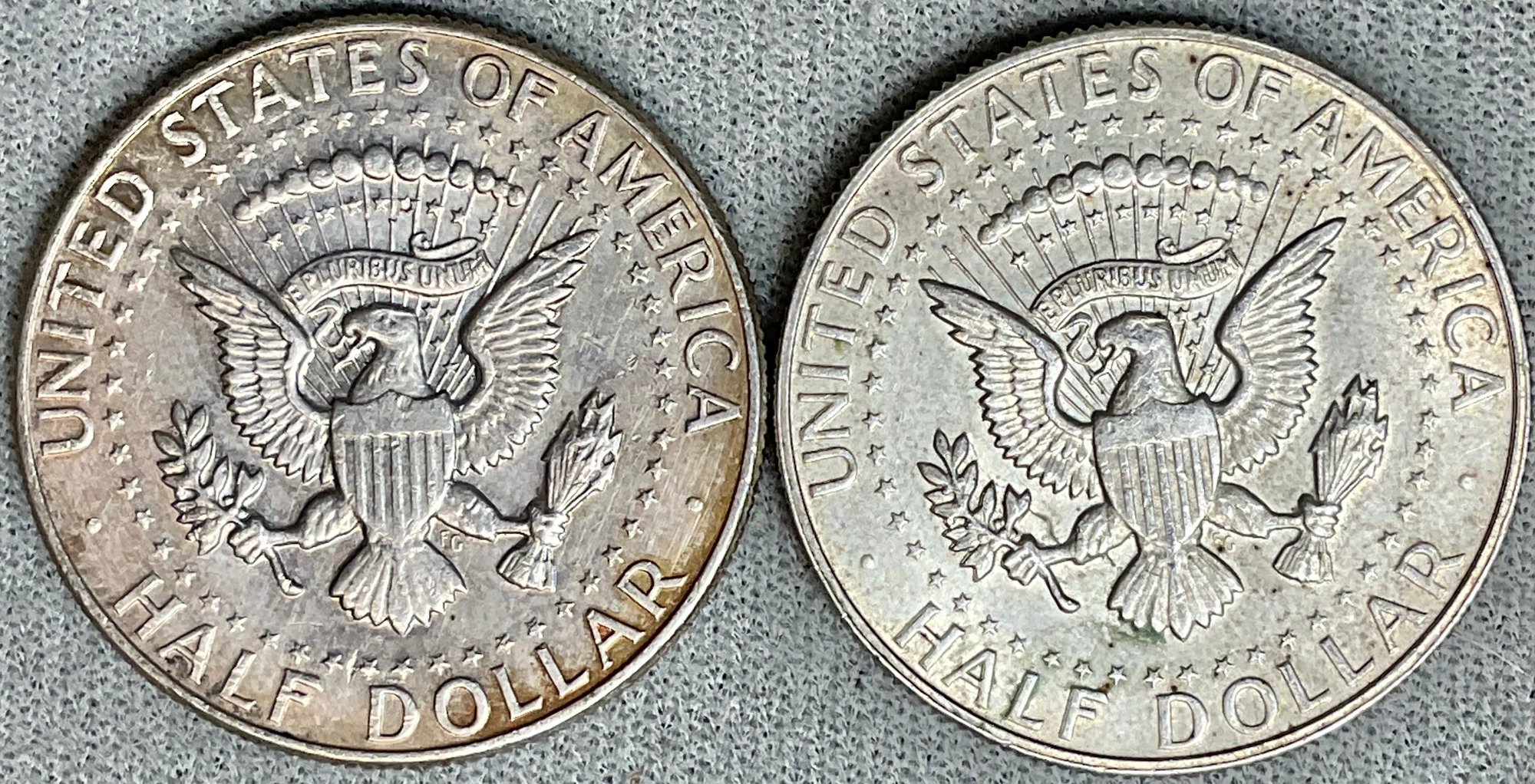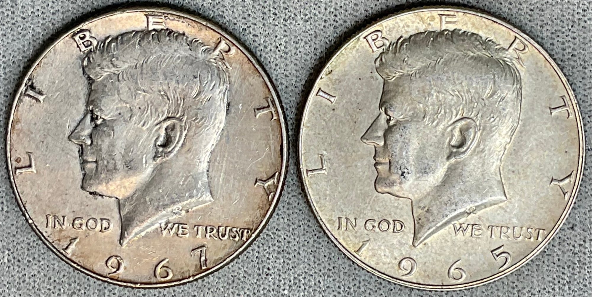 1965 & 1967 Kennedy Half Dollars - 40% silver - good used condition