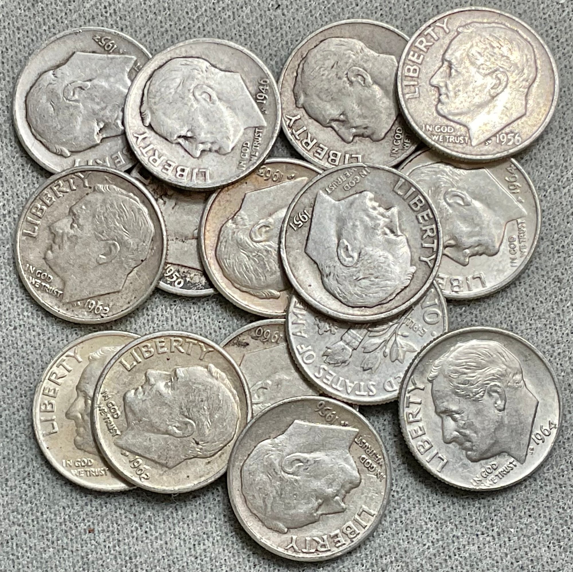 #2 - 15pc Silver Roosevelt Dimes - assorted dates - good used condition