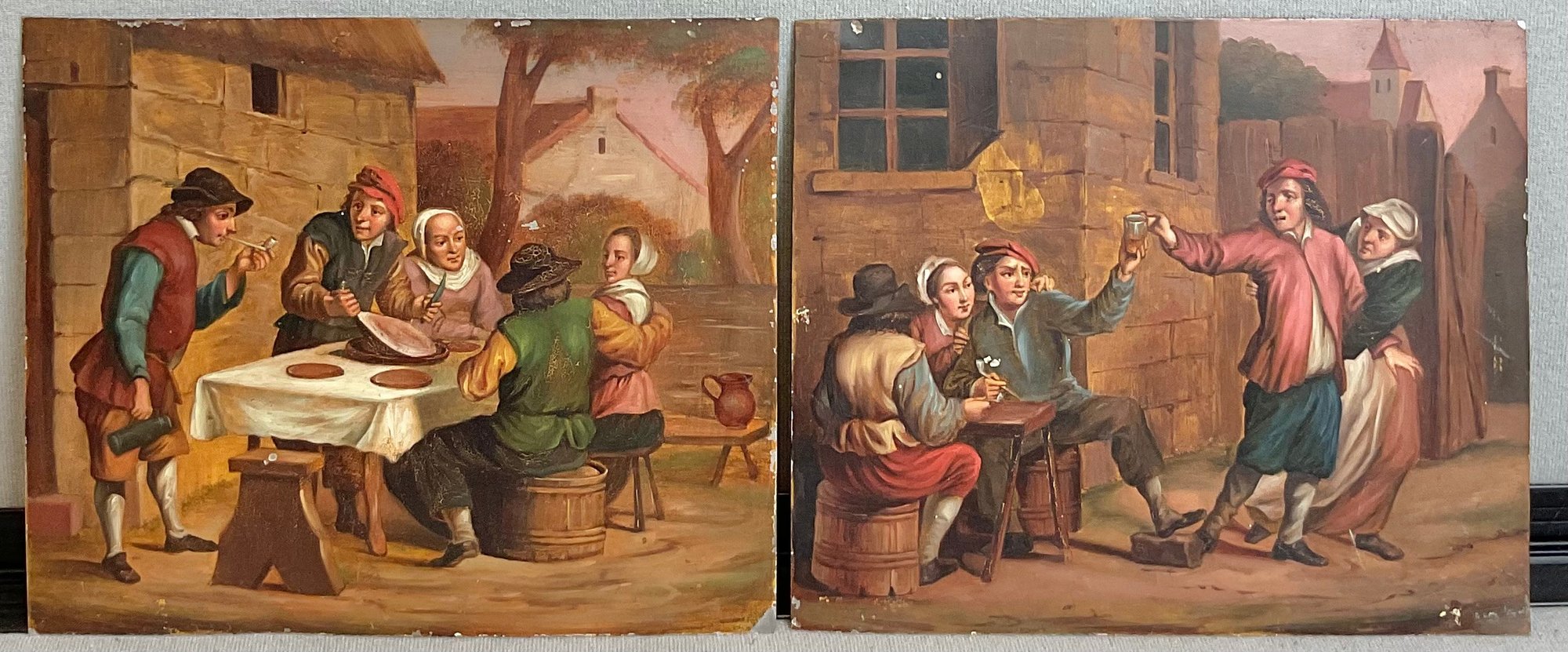 2 Antique Original Oil Paintings On Tin - After David Teniers - 8” x 6 5/8” - good used condition